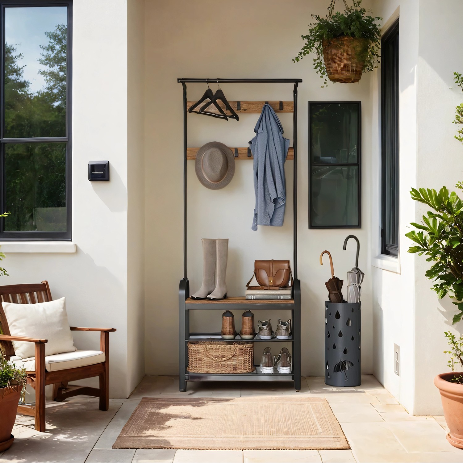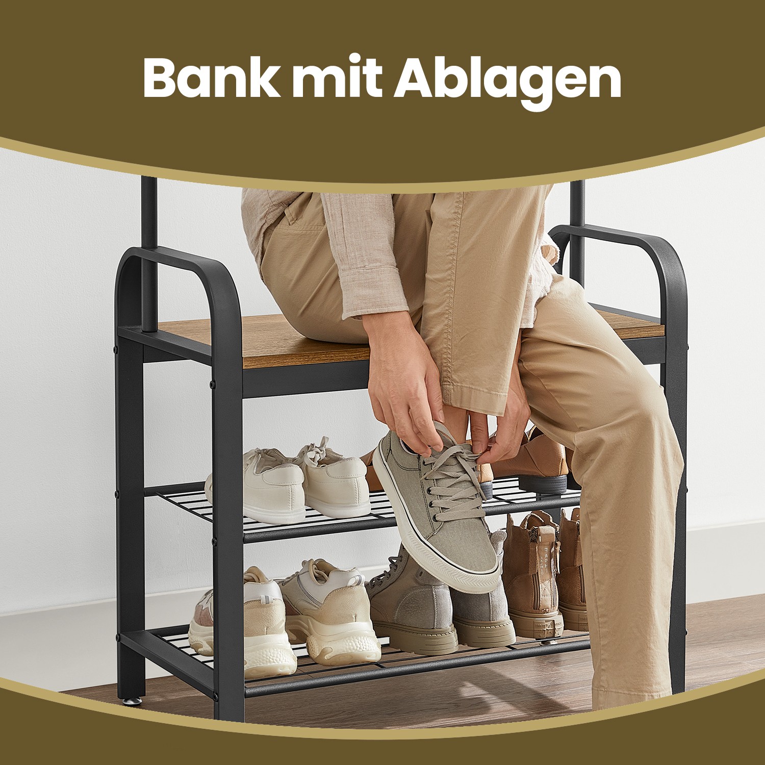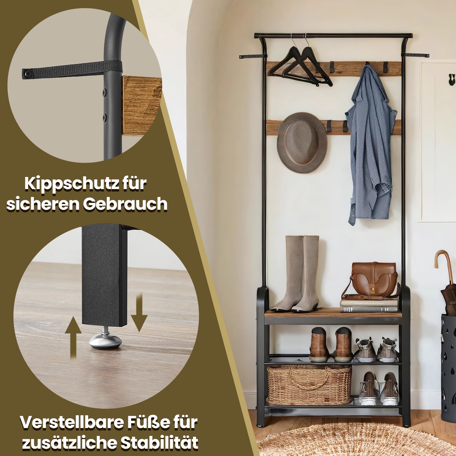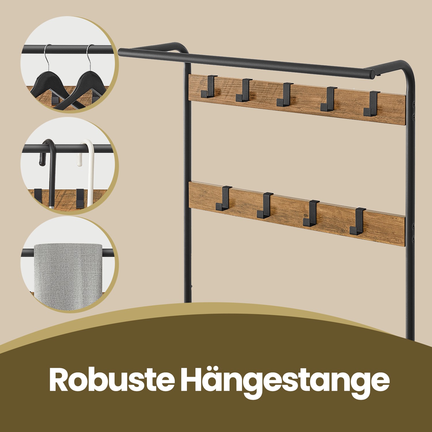 Tuotetiedot: – Väri: pähkinäpuunruskea-musta – Materiaali: lastulevy, teräs – Koko: 33,7 x 72 x 183 cm (S x L x K) – Paino: 9,8 kg – Kunkin koukun maks. staattinen kantavuus: 3 kg – Istuimen maks. staattinen kantavuus: 80 kg Toimitus sisältää: – 1 x vaateripustin – 1 x lisävarustepaketti – 1 x kaatumissuoja – 1 x ohjeet VASAGLE Huomautukset: – Kiinnitä tämä tuote seinään mukana toimitetulla kaatumissuojalla turvallisen käytön varmistamiseksi.- Älä ripusta raskaita vaatteita vaateripustimeen. – Turvallisuussyistä lapset eivät saa kiivetä tuotteelle tai leikkiä sillä. – Istuimen suurin staattinen kantavuus on 80 kg, koukun 3 kg. Älä ylitä tätä enimmäispainoa.