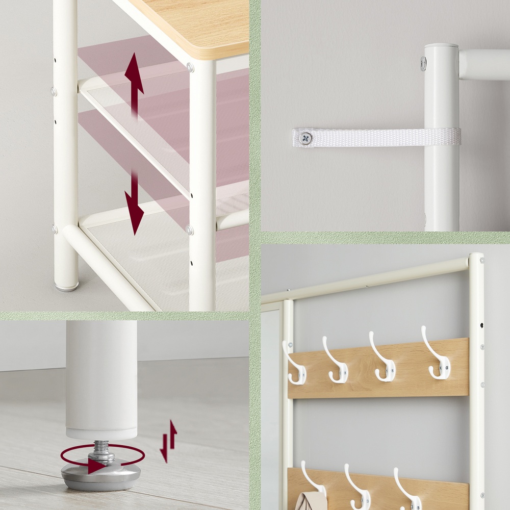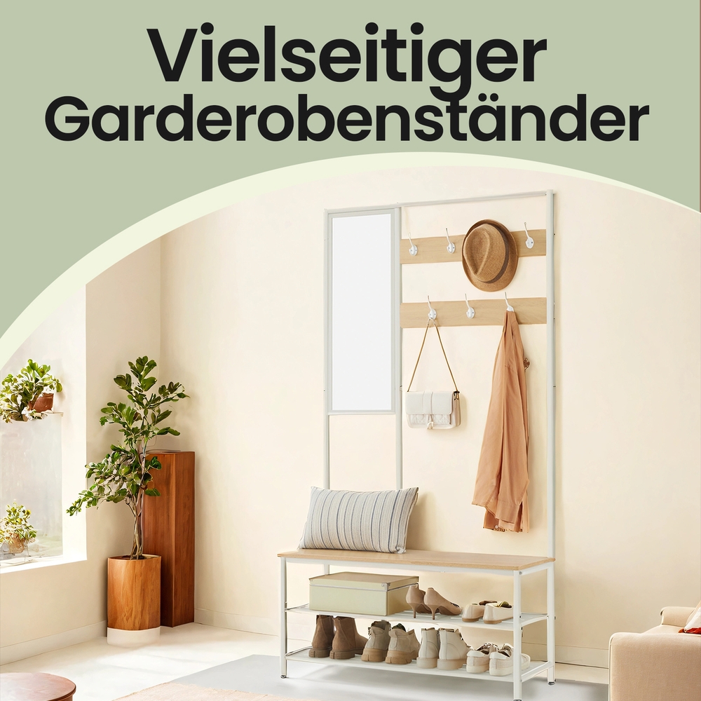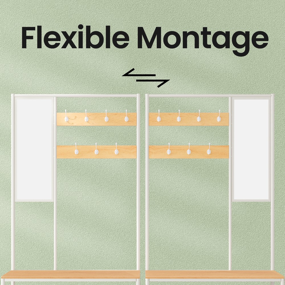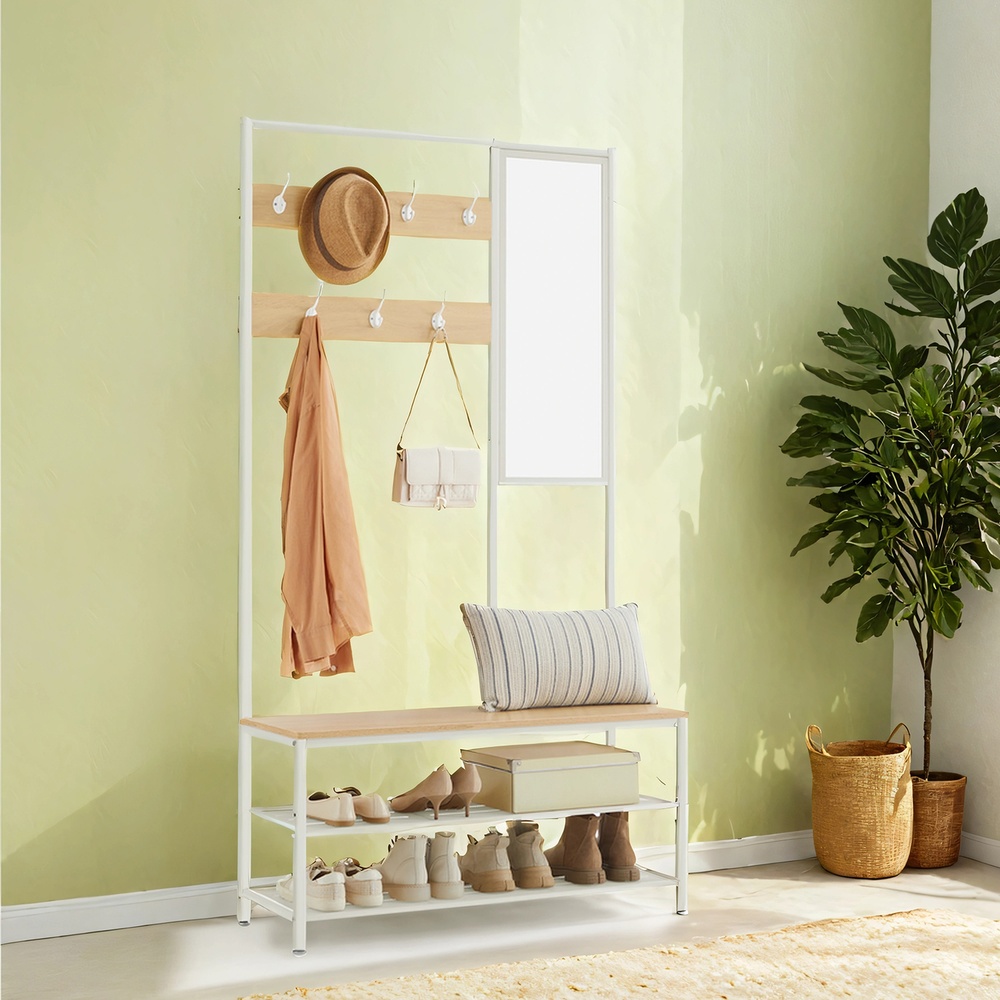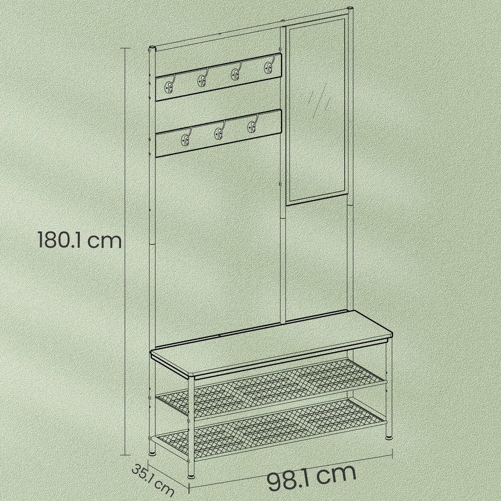 VASAGLE vaateripustin, vaatekaappi, vaateripustin koukkuilla, peili, penkki, 35 x 98 x 180 cm, eteiseen, makuuhuoneeseen, olohuoneeseen, teollinen muotoilu, vintage-ruskea-musta HSR415B01