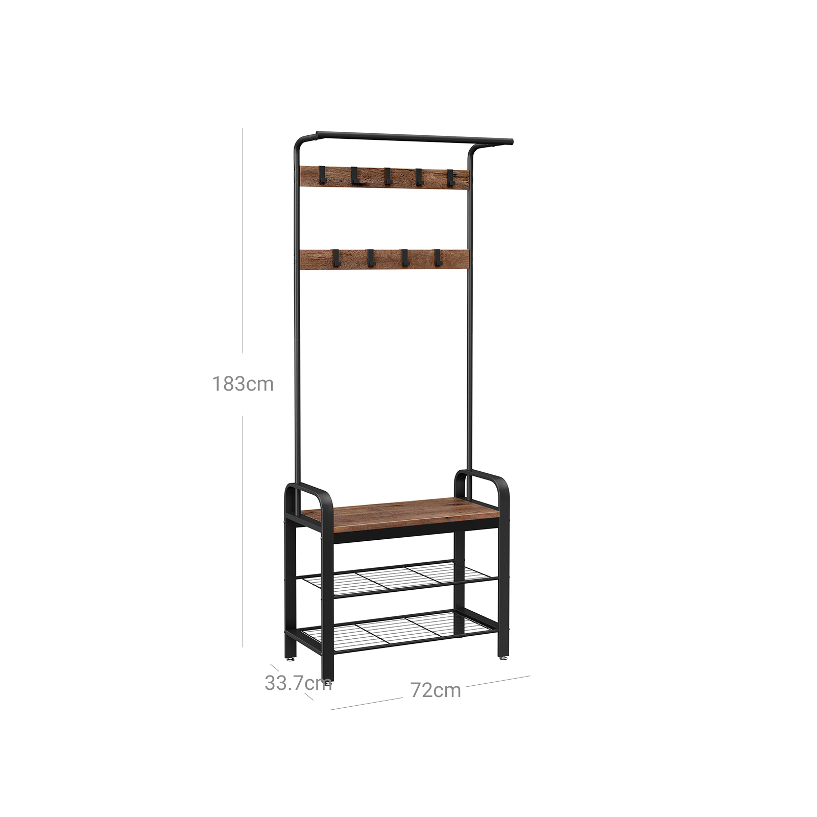Tuotetiedot: – Väri: pähkinänruskea-musta – Materiaali: lastulevy, teräs – Koko: 72 x 33,7 x 183 cm (P x L x K) – Paino: 9,8 kg – Koukun suurin staattinen kantavuus: 3 kg – Istuimen suurin staattinen kantavuus: 80 kg Toimitus sisältää:- 1 x vaatekaappi – 1 x lisävarustepaketti – 1 x kaatumissuoja – 1 x ohjeet (DE, EN, FR, IT, ES) VASAGLE Huomautukset: – Turvallisuussyistä lapset eivät saa kiivetä tuotteelle tai leikkiä sillä.- Istuimen suurin staattinen kantavuus on 80 kg, koukun 3 kg. Älä ylitä tätä enimmäispainoa. – Kiinnitä tämä tuote seinään mukana toimitetulla kaatumissuojalla turvallisen käytön varmistamiseksi.