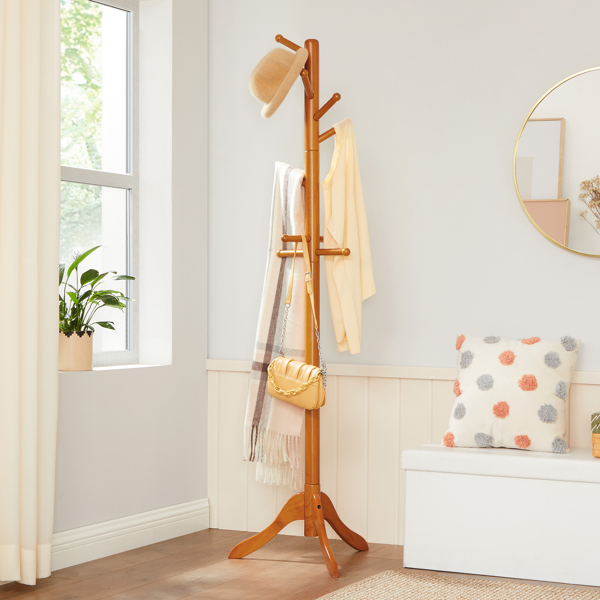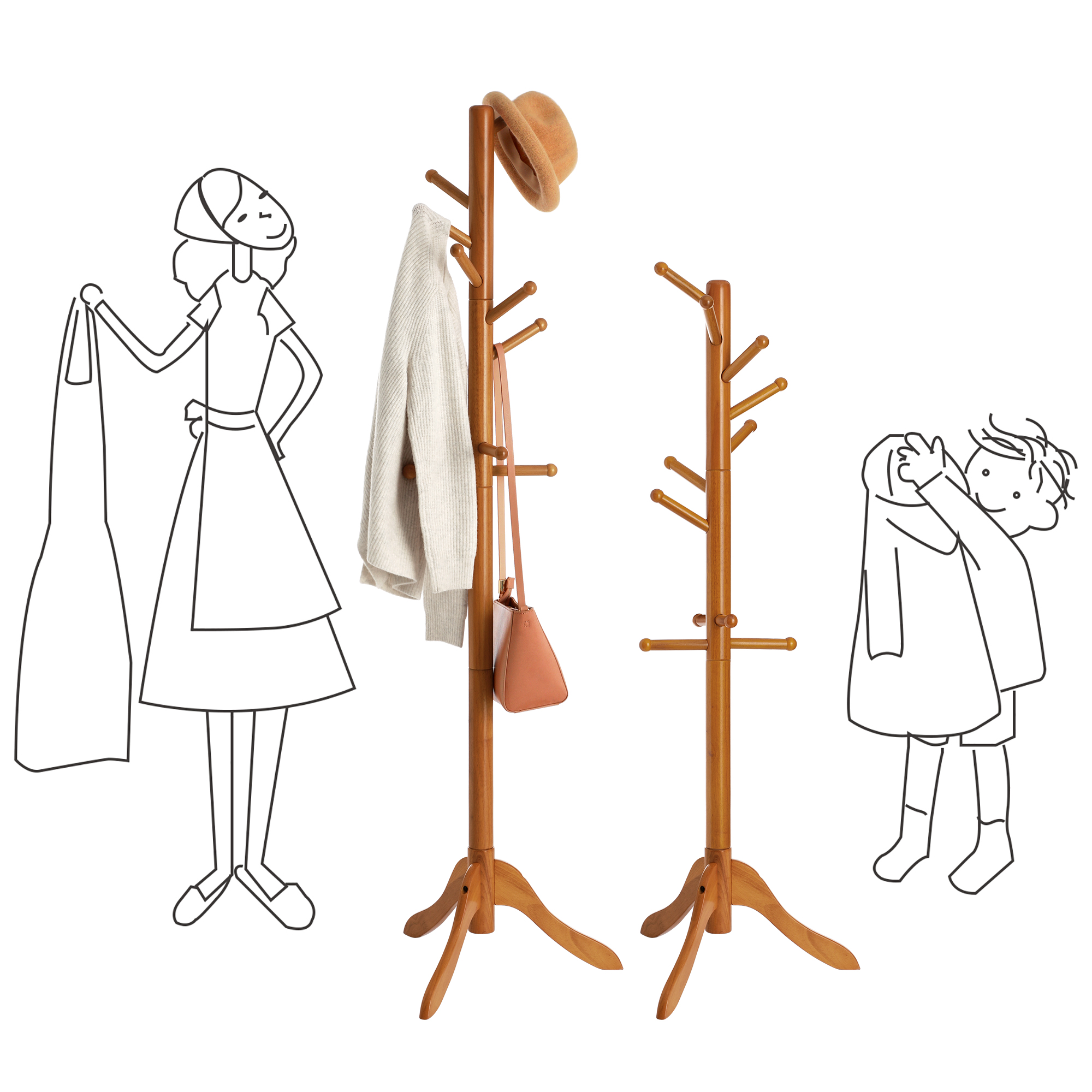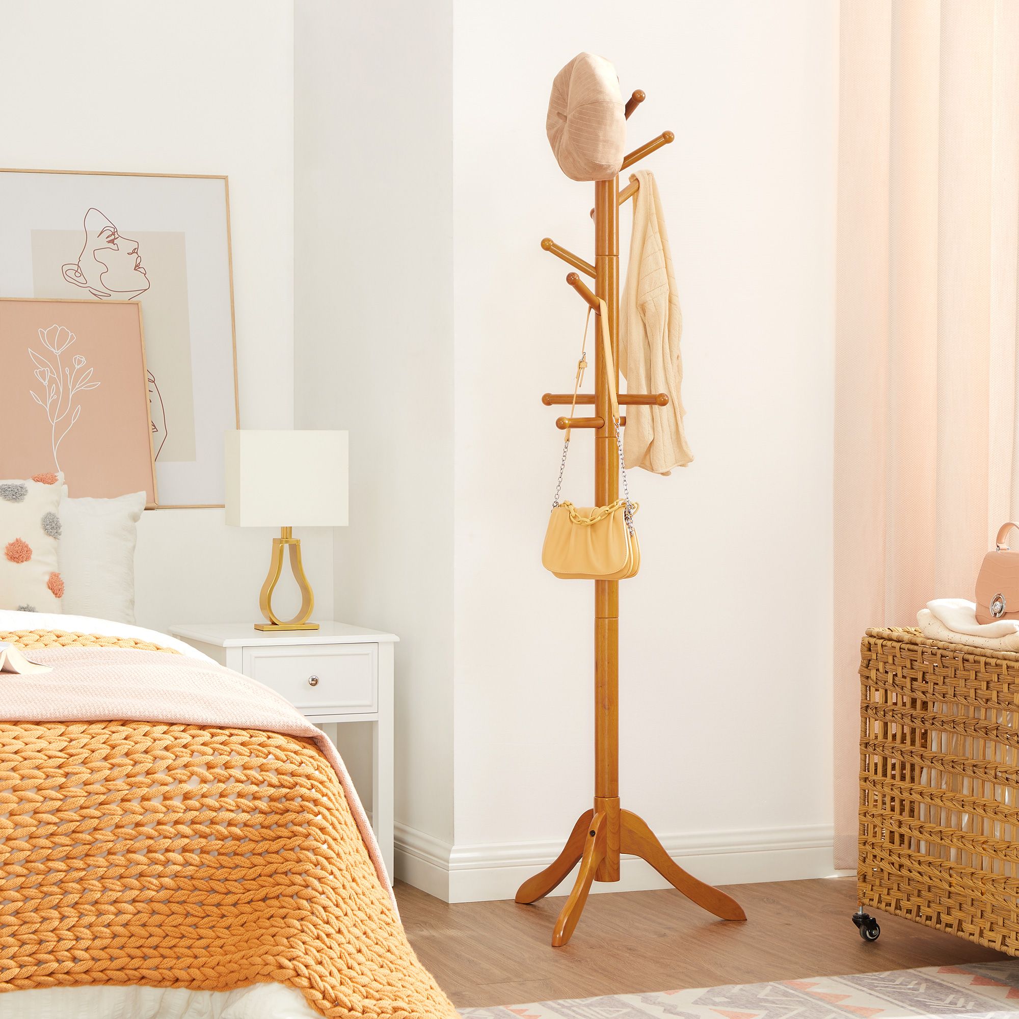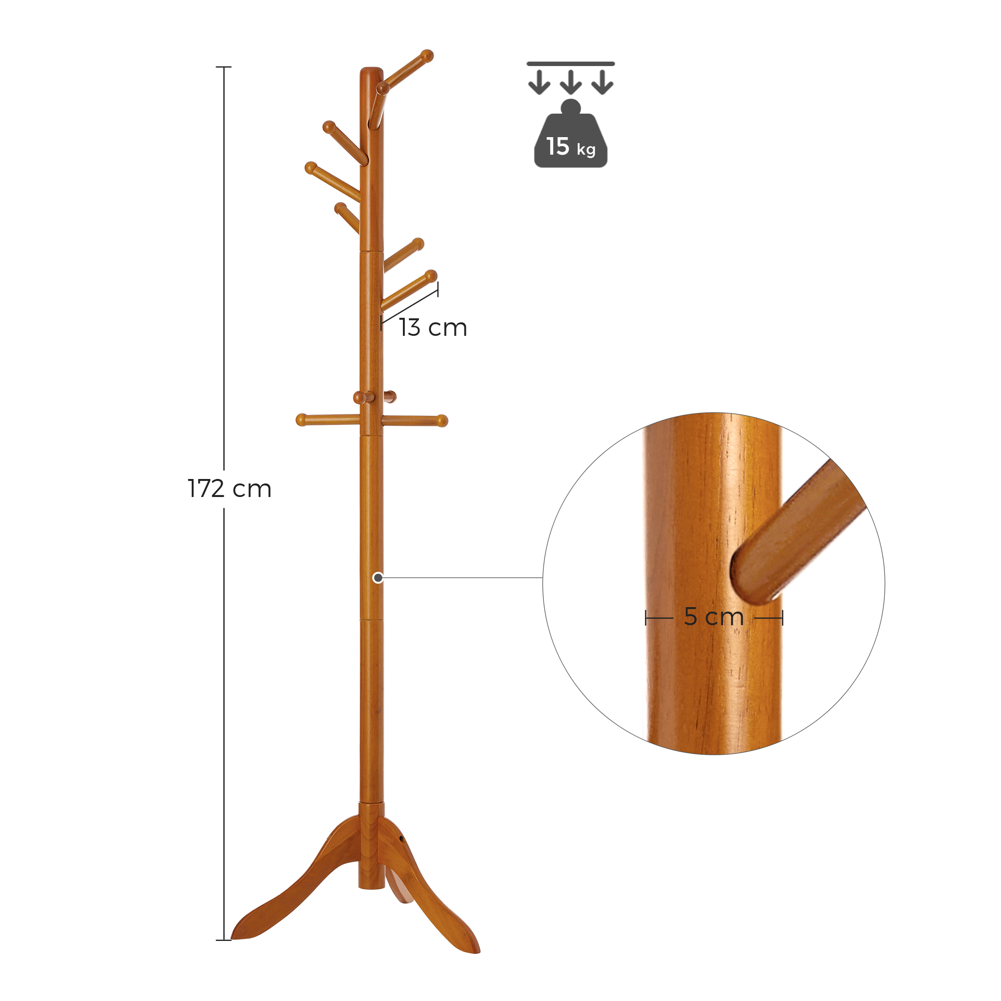 Tämä vapaasti seisova vaatekaappi on juuri se, mitä sinun onni tarvitsee Siisti koti tekee yksinkertaisesti onnelliseksi. Hanki tämä VASAGLE-vaatekaappi ja ota ensimmäinen askel kohti onnellisempaa kotia. Siivoa vaatekasat sohvalta ja muuta asuntosi jälleen viihtyisäksi. Tämän vaatekaapin kohokohdat yhdellä silmäyksellä: – Kolmen jalan tukemana tämä vaatekaappi on vakaa eikä kaadu, kun ripustat takkisi koukkuun. Se on myös erittäin kestävä ja pitkäikäinen. – Käytössäsi on 11 koukkua, joissa on pyöristetyt päät ja joihin voit ripustaa vaatteet, laukut ja muut tavarat kätevästi saataville ja siististi. – Asennus ei aiheuta päänvaivaa: tämän vaatekaapin kokoaminen on lastenleikkiä! Tuotetiedot:- Väri: tammenvärinen – Materiaali: kumipuu – Koko: 57 x 57 x 172 cm (P x L x K) – Koukun pituus: 13 cm – Paino: 3,4 kg – Koukun maks. staattinen kantavuus: 5 kg – Maks. staattinen kokonaiskantavuus: 15 kg Toimitus sisältää:- 1 x vaatekaappi – 1 x ohjeet (DE, EN, FR, ES, IT) VASAGLE-ohjeet: – Älä altista tuotetta suoralle auringonvalolle pitkäksi aikaa. – Tekstissä mainittu maks. kantavuus viittaa staattiseen maksimipainoon.