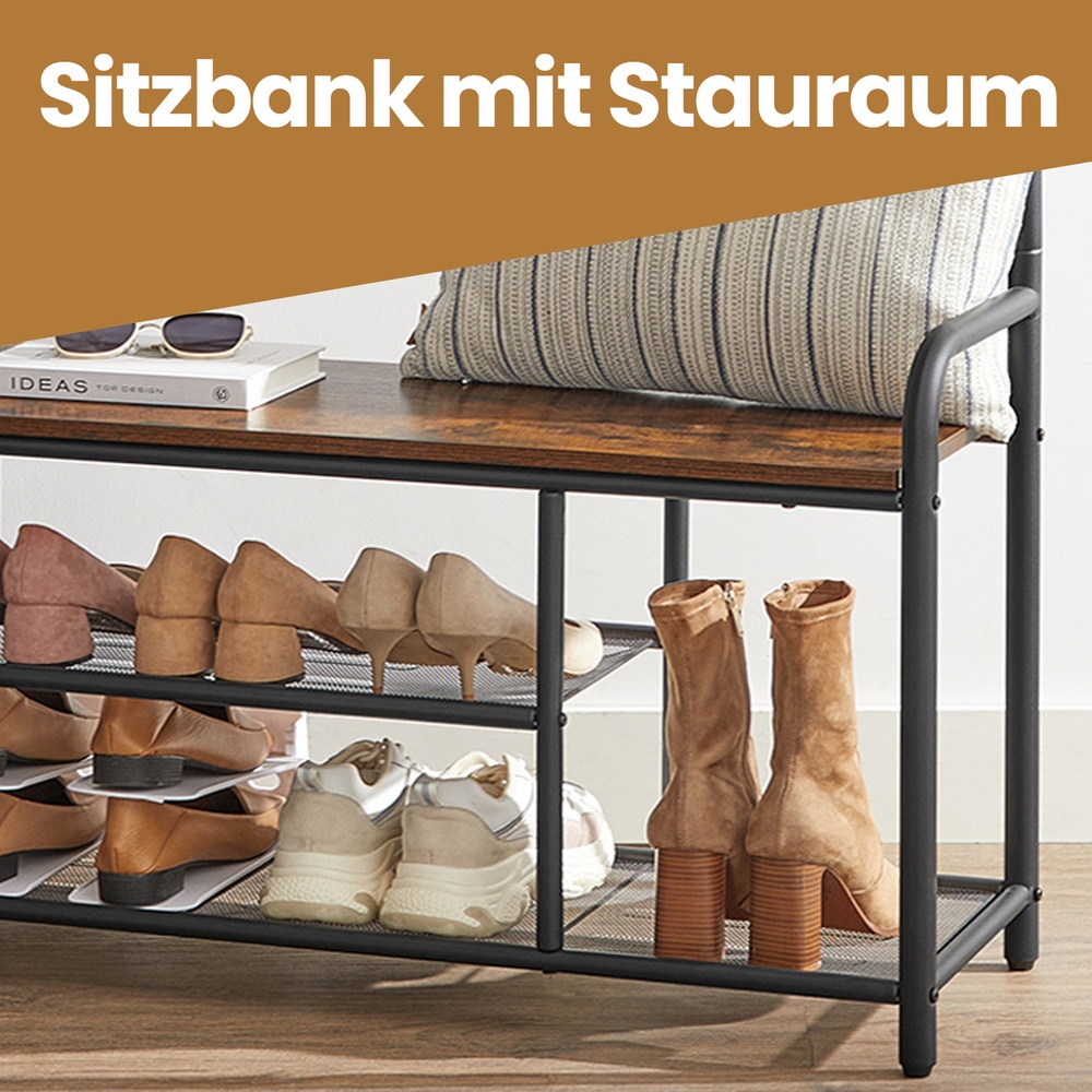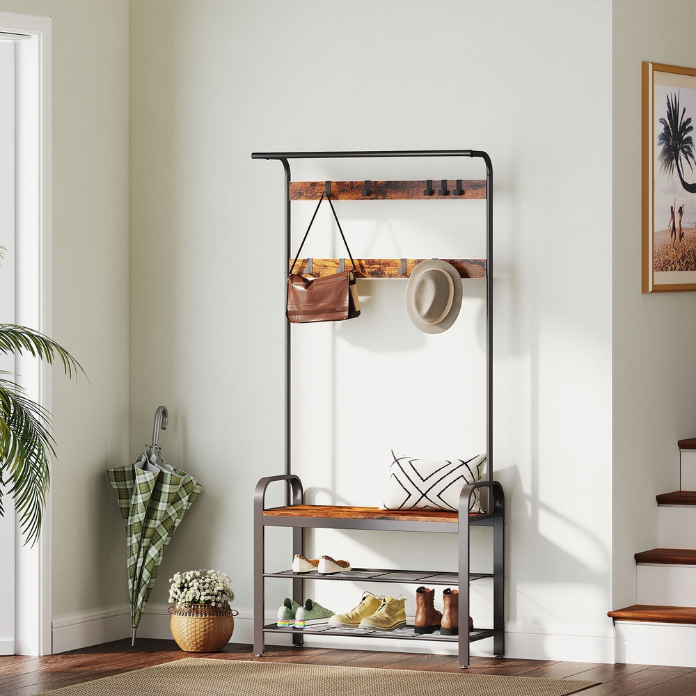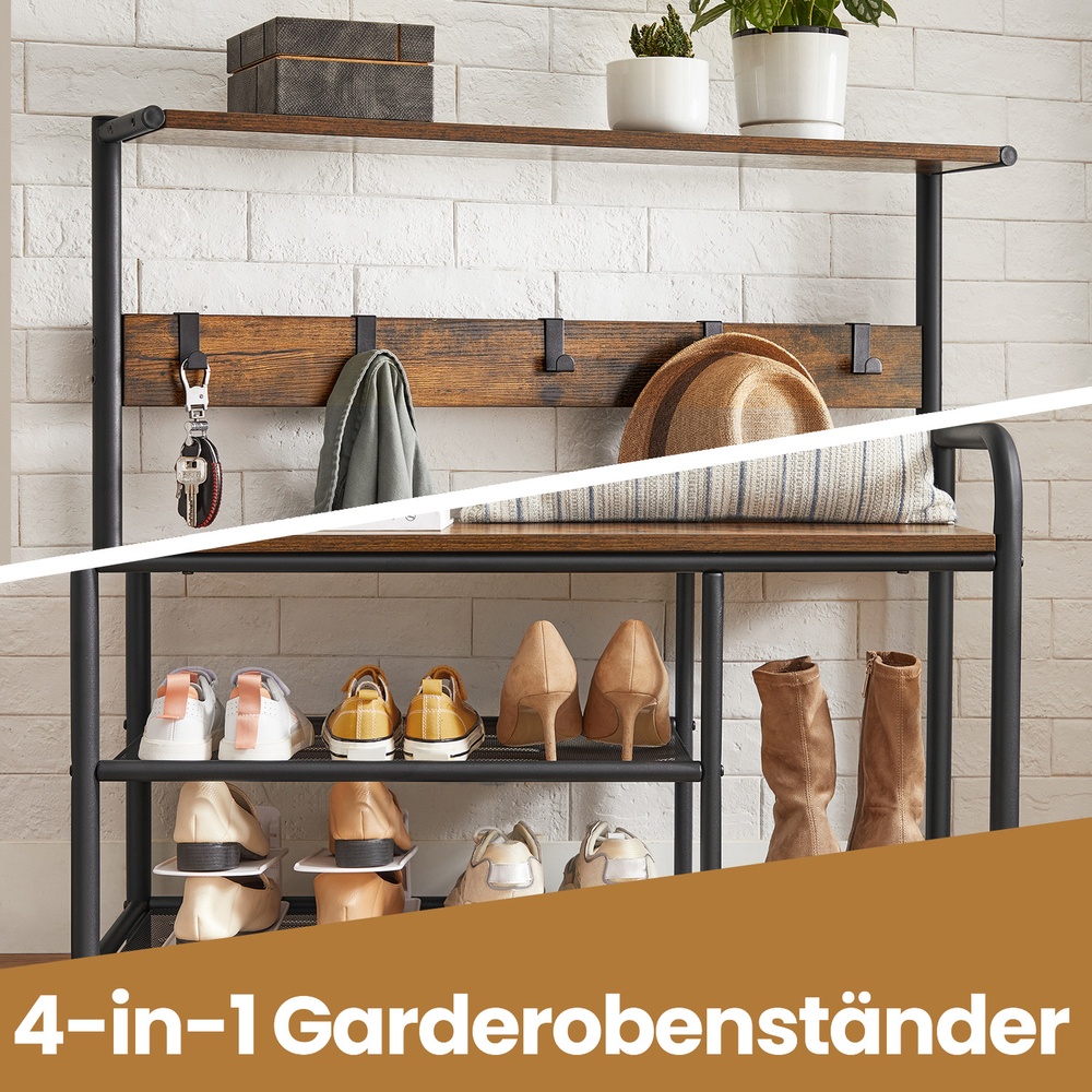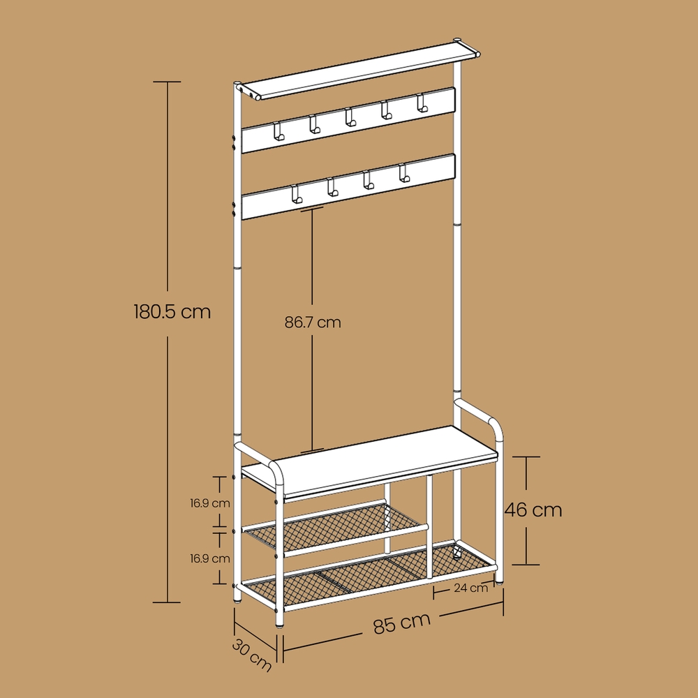Tuotetiedot: – Väri: vintage-ruskea-musta – Materiaali: lastulevy, teräs – Kokonaismitat: 85 x 30 x 180,5 cm (P x L x K) – Ylimmän hyllyn mitat: 80 x 15 x 1,5 cm (P x L x K) – Penkin koko: 80 x 30 x 1,5 cm (P x L x K) – Hyllyjen välinen etäisyys: 16,9 cm (vasen); 35,7 cm (oikealla) – Paino: 11,8 kg – Ylimmän hyllyn maks. staattinen kantavuus: 10 kg – Koukun maks. staattinen kantavuus: 3 kg – Penkin maks. staattinen kantavuus: 90 kg – Hyllyritilän maks. staattinen kantavuus: 15 kg Toimitus sisältää: – 1 x vaateripustin – 1 x lisävarustepaketti – 1 x kaatumissuoja – 1 x ohjeet VASAGLE Huomautukset: – Kiinnitä tämä tuote seinään mukana toimitetulla kaatumissuojalla turvallisen käytön varmistamiseksi. – Penkki kestää enintään 90 kg:n staattisen kuormituksen. Älä ylitä tätä enimmäispainoa.