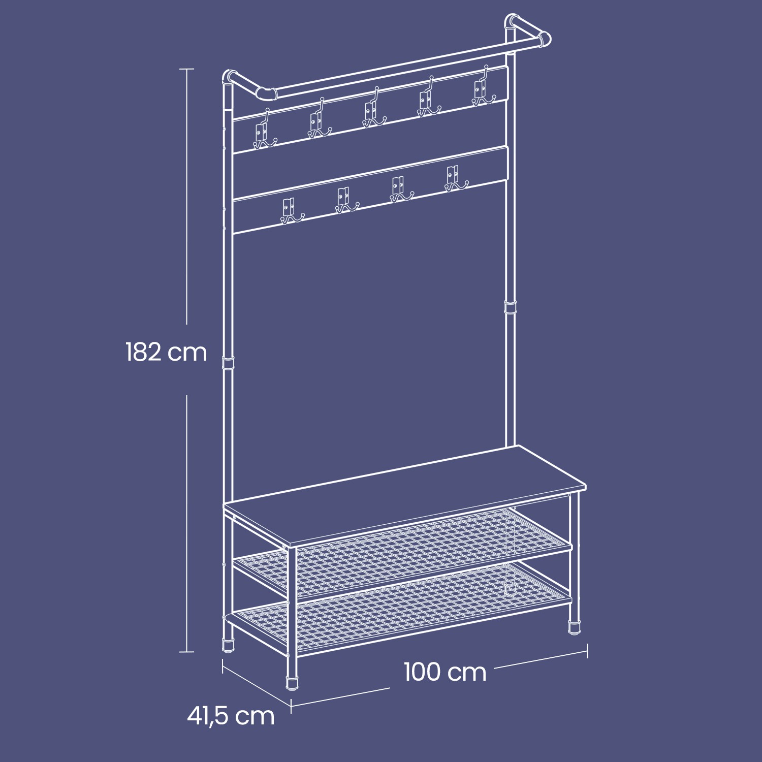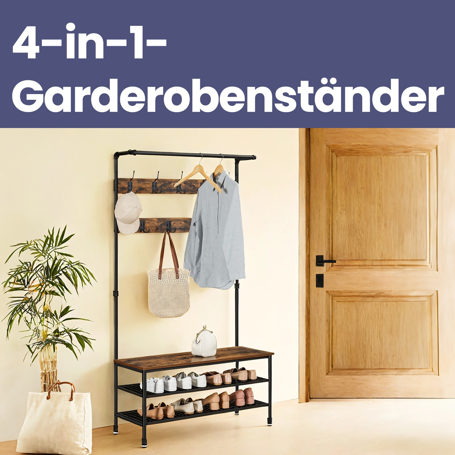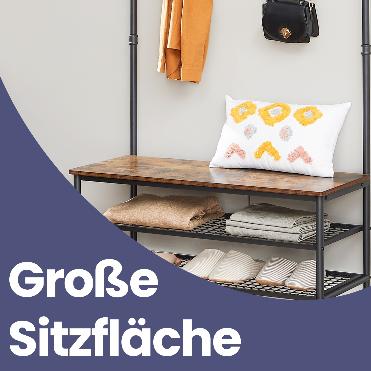 VASAGLE:n suunnittelijat kehittävät säännöllisesti uusia ideoita käytännöllisille huonekaluille, joiden avulla voit tehdä elämästäsi tyylikkäästi ja edullisesti hieman mukavampaa. Näin he antavat sinulle mahdollisuuden tehdä kodistasi jotain aivan poikkeuksellista. Rustikaalinen vaatekaappi teollisessa designissa He suunnittelivat esimerkiksi yllä olevan vaatekaapin, jossa on penkki, joka tarjoaa sekä mukavan istumapaikan että 2 hyllyä kenkien säilyttämiseen sekä vaatetangon ja 9 koukkua avainten, laukkujen tai vaatteiden säilyttämiseen. Trendikkäässä teollisessa designissa, vesiputkielementeillä ja rustiikkisilla puuelementeillä varustettu vaatekaappi sopii erityisesti suuriin tai avoimiin tiloihin, jotka eivät ole vielä liian täynnä muita huonekaluja. Sijoita vaatekaappi esimerkiksi eteiseen, jotta voit ripustaa takit ja päällystakit sekä pukea kengät mukavasti. Tämä vaatekaappi ei kuitenkaan saisi olla ainoa teollisen muotoilun esine asunnossasi. Tutustu myös muihin VASAGLE-tuotteisiin. Tuotetiedot: – Väri: vintage-ruskea-musta – Materiaali: lastulevy, teräs – Koko: 100 x 41,5 x 182 cm (P x L x K) – Paino: 16,5 kg – Penkkiin maks. kuormitus: 100 kg – Maks. kuormitus per ritilähylly: 20 kg – Maks. kuormituskyky koukkua kohti: 3 kg Toimitus sisältää: – 1 x vaatekaappi – 1 x lisävarustepussi – 1 x kaatumissuoja – 1 x ohjeet (DE, EN, FR, ES, IT) VASAGLE Huomautukset: – Käytä kaatumissuojaa ja kiinnitä tuote seinään vaatekaapin turvallisuuden varmistamiseksi. – Älä ripusta liian painavia esineitä yläosan puulevyyn tai koukkuihin.