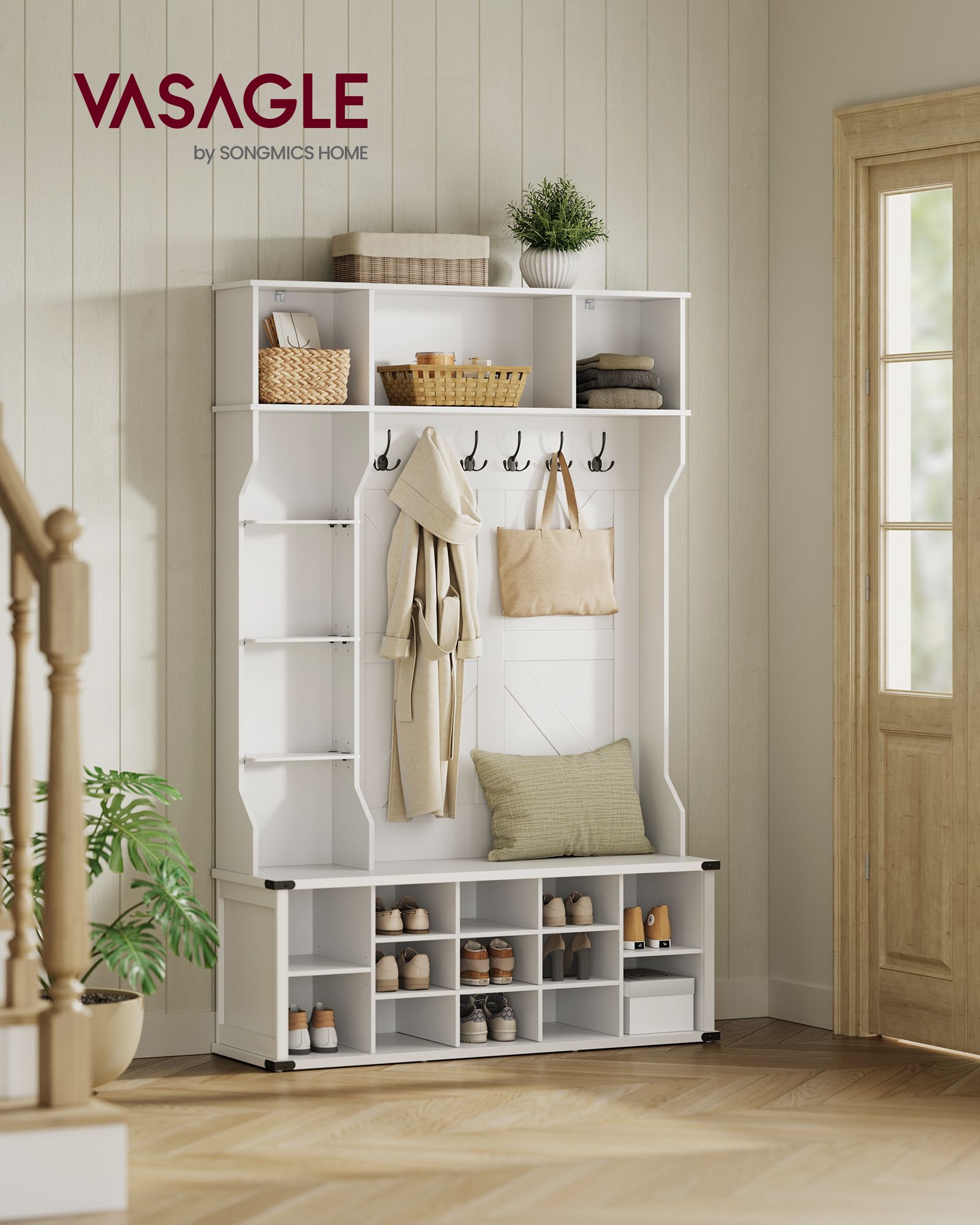 VASAGLE vaateteline, naulakko, eteiskaluste kenkähyllyllä, säädettävät hyllyt, 20 avointa lokeroa, 6 kolminkertaista koukkua, maalaistyyli, vapaasti seisova, eteiseen, käytävään, pilvinen valkoinen HSR440W03
