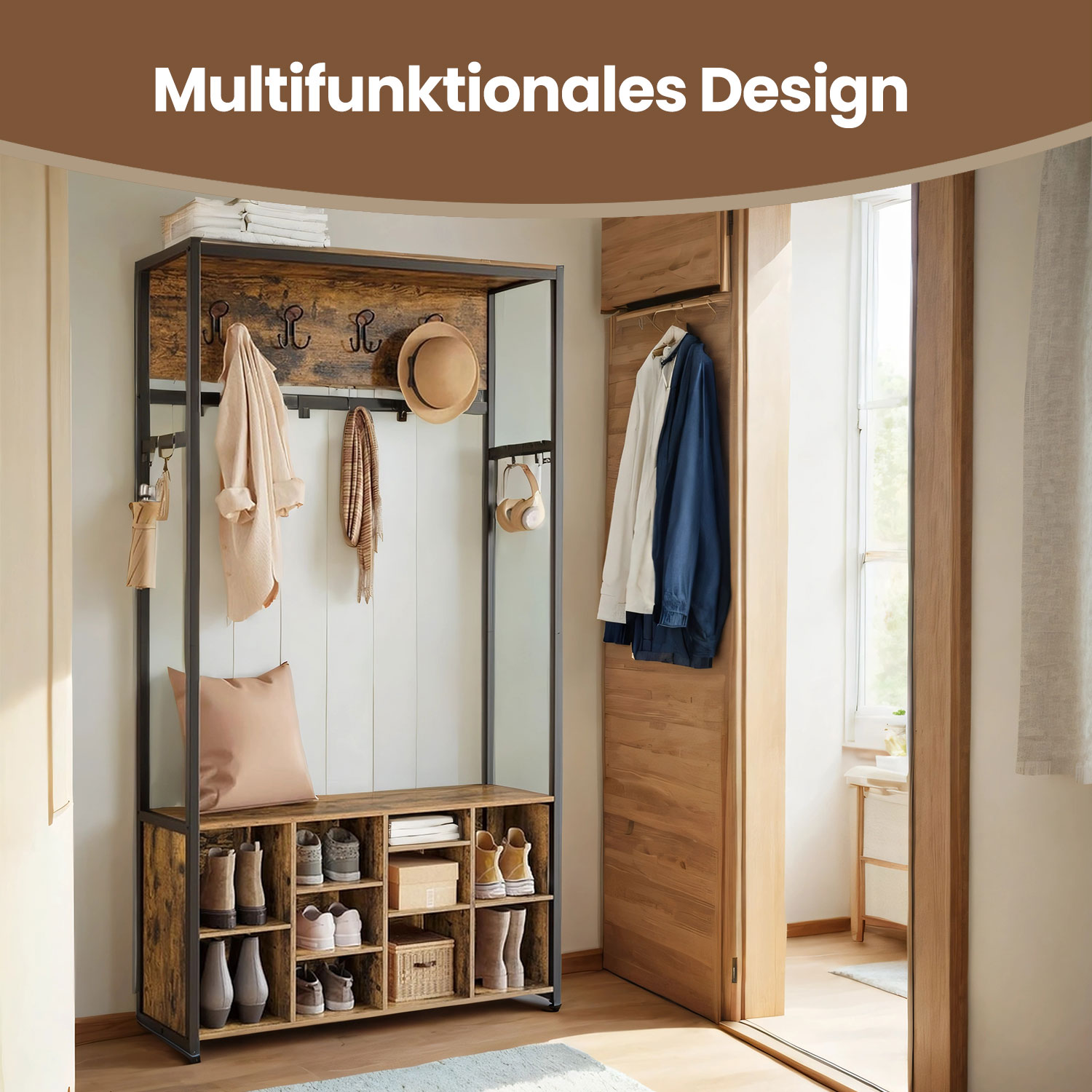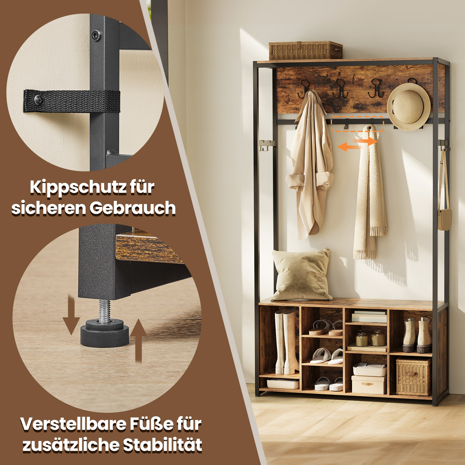 VASAGLE vaateripustin, vaatekaappi, eteiskaluste kenkähyllyllä, avoimet lokerot, vaatekoukut, säädettävät hyllyt, teollinen tyyli, käytävään, eteiseen, vintage-ruskea-mustanmusta HSR432K01