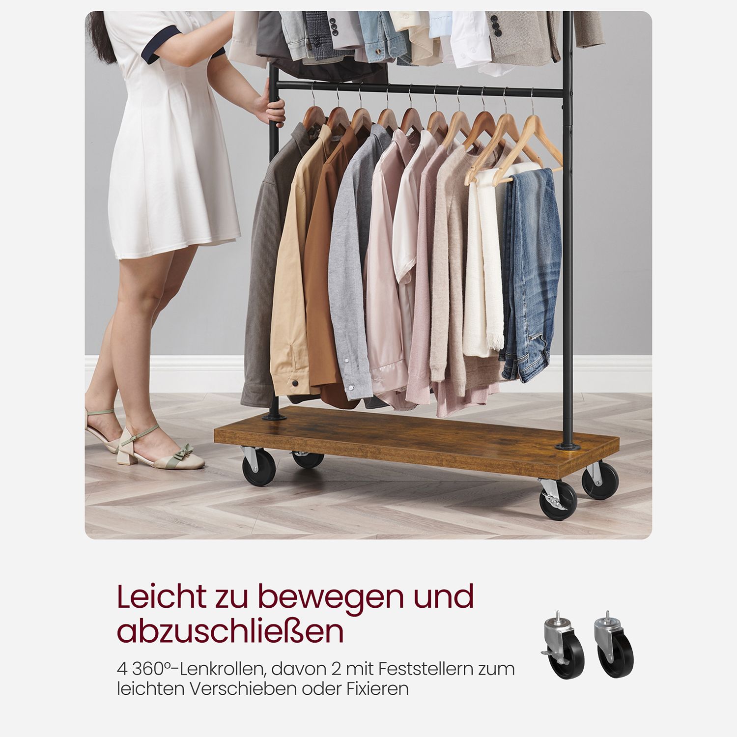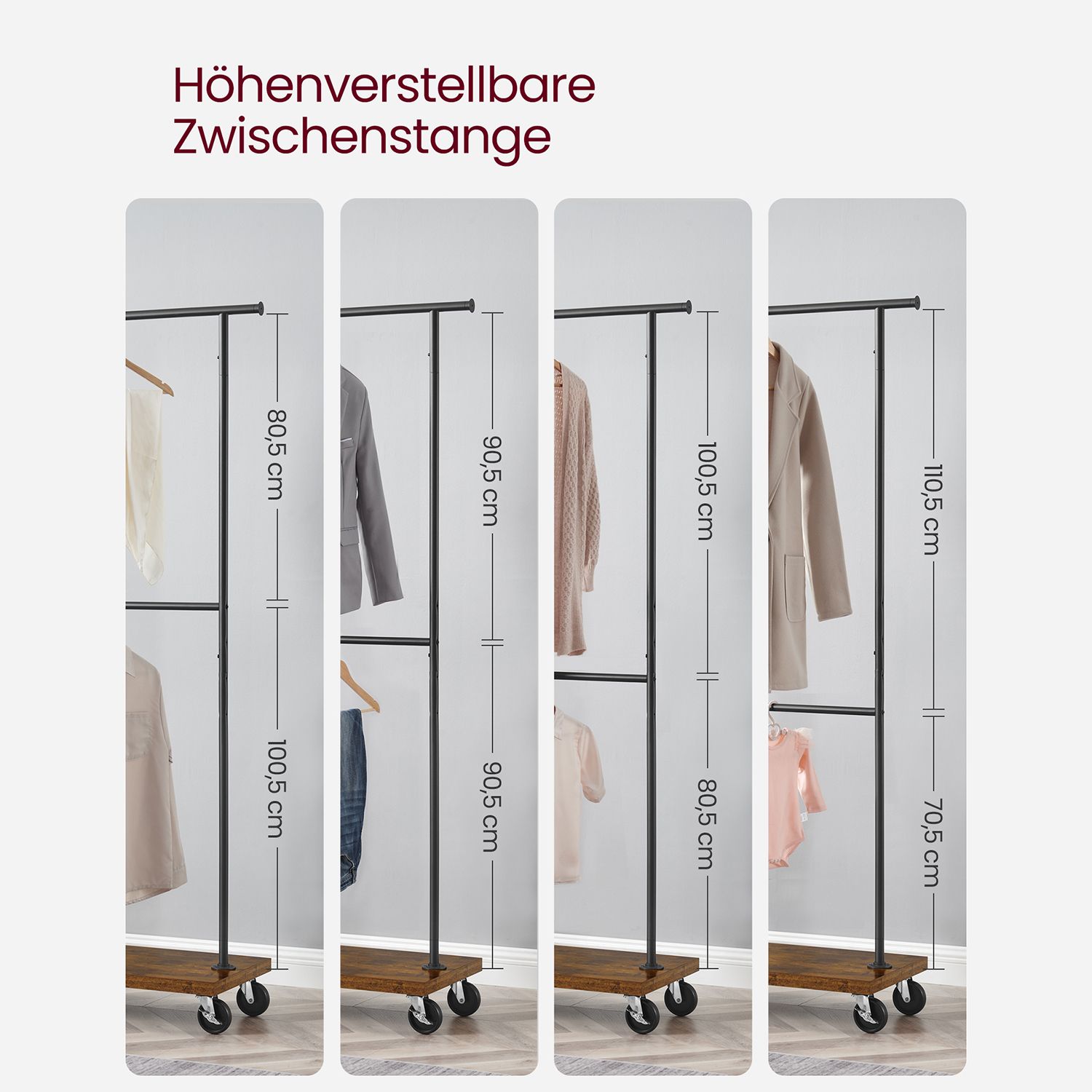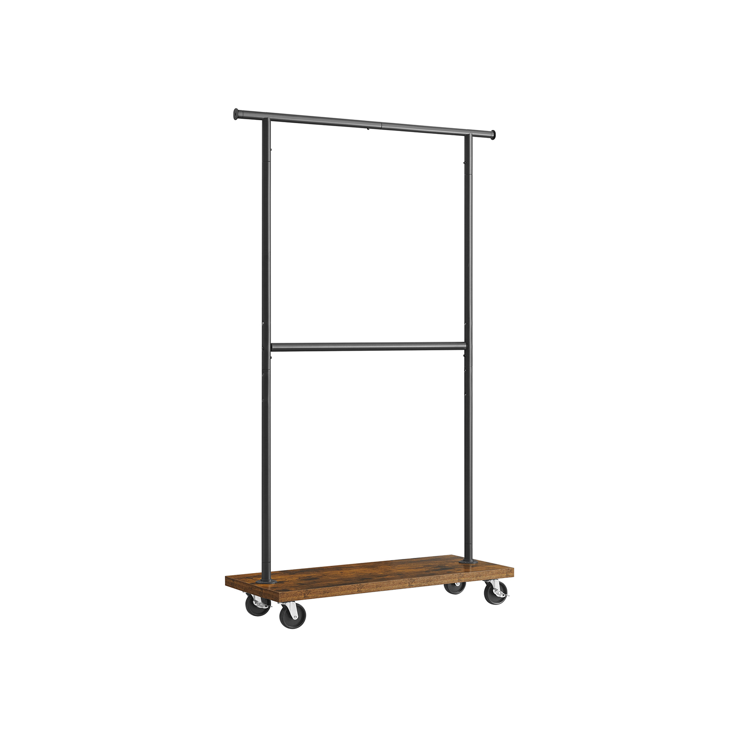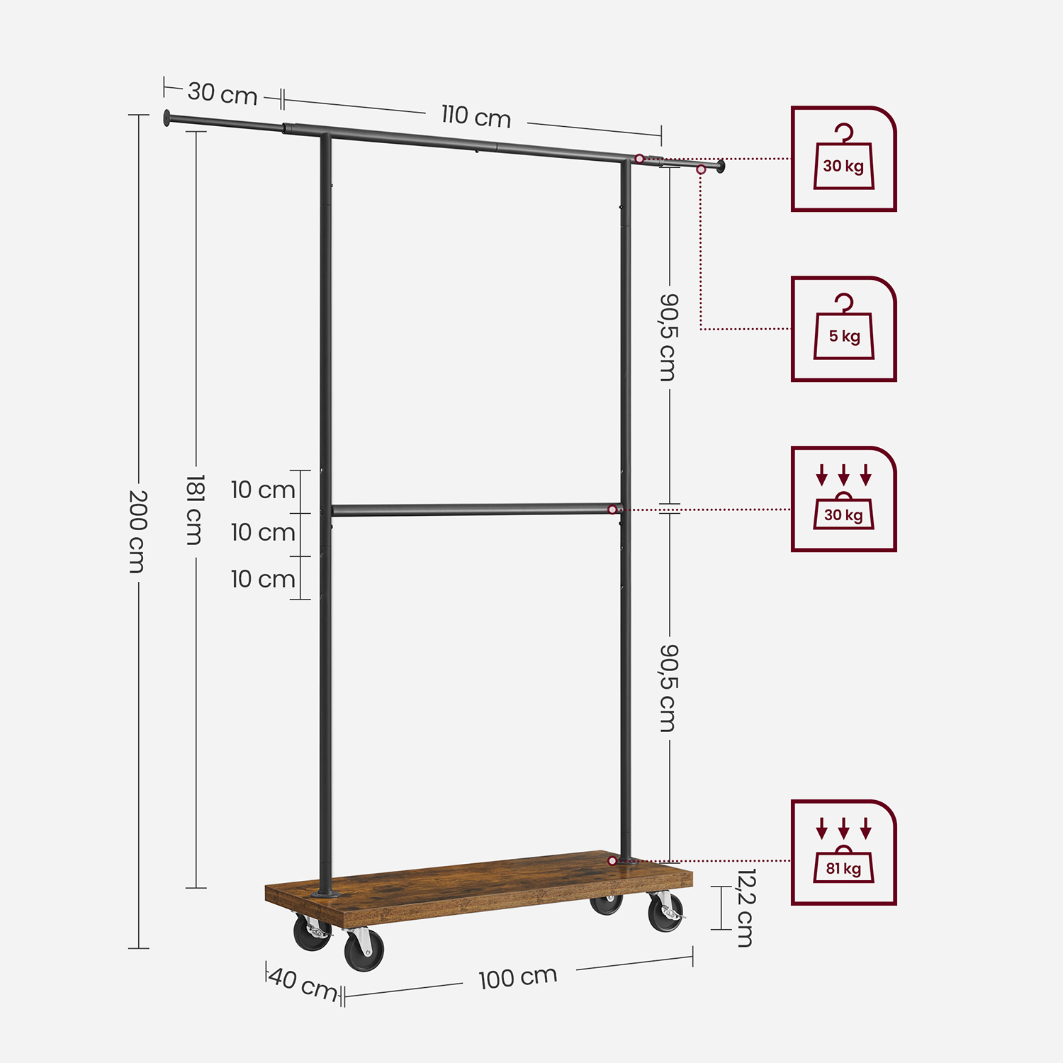 Tuotetiedot: Väri: vintage-ruskea-musta Materiaali: lastulevy, teräs Koko: 40 x (110-170) x 200 cm (S x L x K) Paino: 10,5 kg Yläpalkin maks. staattinen kantavuus: 30 kg Ulostyöntyvien yläpäiden maks. staattinen kantavuus: 5 kg Keskimmäisen tangon maks. staattinen kantavuus: 30 kg Hyllyn maks. staattinen kantavuus: 81 kg Maks. staattinen kokonaiskantavuus: 151 kg Toimitus sisältää: 1 x vaateteline 1 x lisävarustepaketti 1 x ohjeet VASAGLE Huomautukset: Turvallisuussyistä lapset eivät saa kiivetä tuotteelle tai leikkiä sillä.