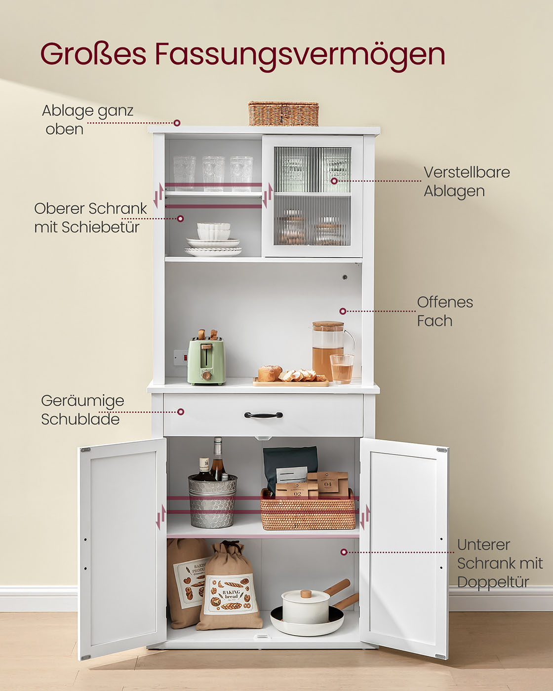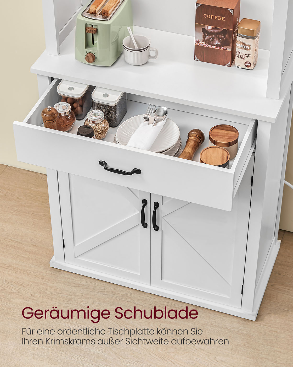 VASAGLE valaistu sivupöytä, säilytyskaappi, ovet ja laatikot, keittiökaappi, kahvibaari, säädettävä hylly, maalaistyyli, pilvinen valkoinen BBK363W21