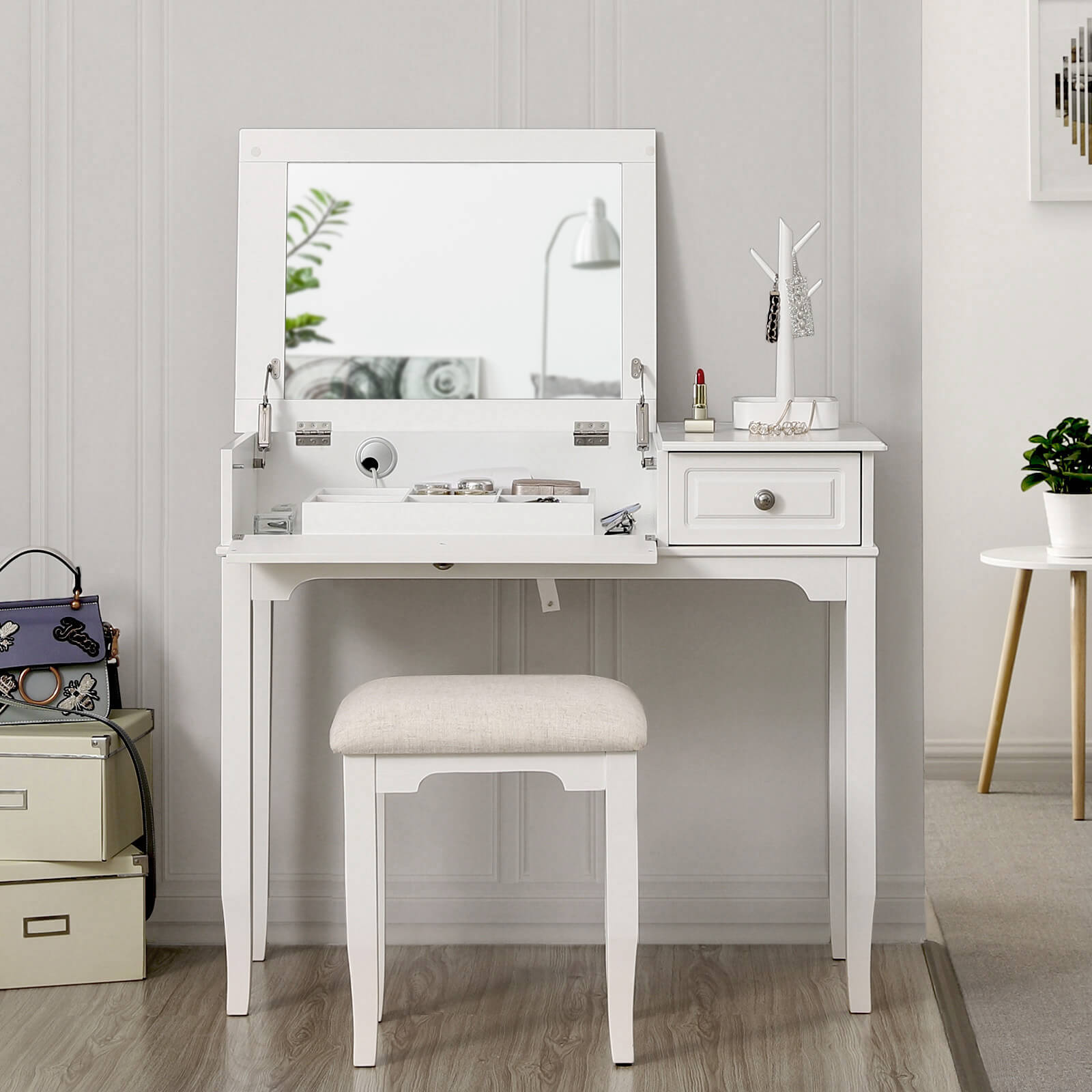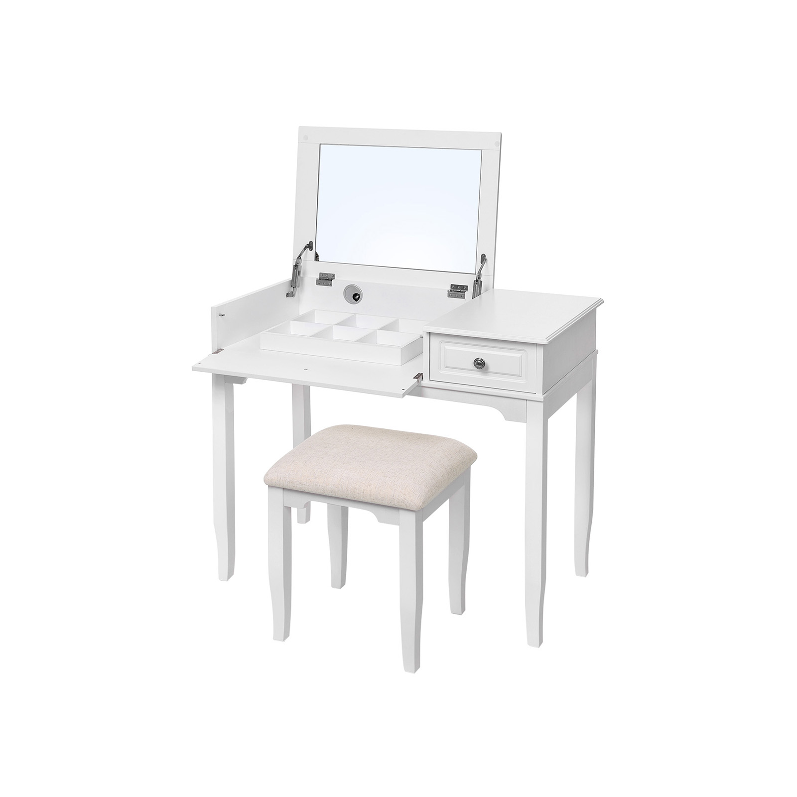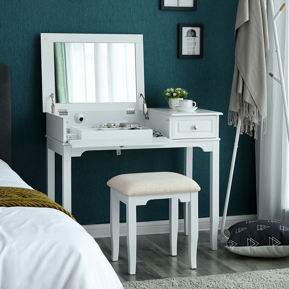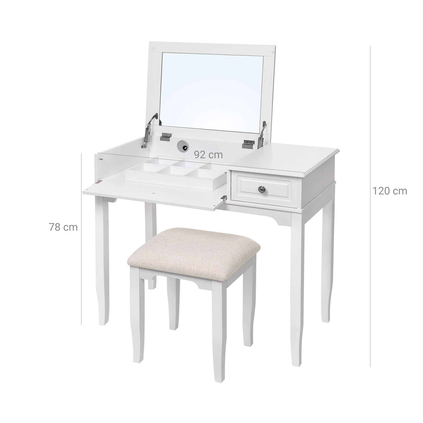Meikkauspaikallesi tulee lisäys Etsitkö edelleen ainutlaatuista ja huomiota herättävää peilipöytää? Sitten etsintäsi on nyt ohi! Tämä SONGMICS-meikkauspöytä vakuuttaa käytännöllisyydellään ja tyylikkäällä ulkonäöllään. Ansaitset jotain parempaa Verrattuna huonolaatuisiin pöytään, jotka rikkoutuvat alle kahdessa vuodessa, premium-meikkauspöytämme pysyy kotonasi monien vuosien ajan. Tästä huolehtivat erityisesti kumipuusta valmistetut jalat ja korkealaatuiset puukuitulevyt. Harkitut yksityiskohdat mukavuutesi takaamiseksi Korkealaatuisten saranoiden ansiosta kansi pysyy auki missä tahansa kulmassa ilman, että sinun tarvitsee käyttää käsiäsi. Etupaneeli voidaan myös taittaa alas, jotta lokeroon säilytettyihin esineisiin pääsee helposti käsiksi. Älä epäröi, vaan klikkaa nyt ”Lisää ostoskoriin”! Tuotetiedot: – Väri: valkoinen – Materiaali: MDF-levyt (P2-luokka), kumipuu – Pöydän mitat: 92 x 78 x 45,5 cm (L x K x S) – Jakkaran mitat: 40 x 44 x 29,5 cm (L x K x S) – Paino: 21,5 kg Toimitus sisältää: – 1 x meikkauspöytä – 1 x jakkara – 1 x tarvikepussi – 1 x ohjeet (DE, EN, FR, ES, IT)