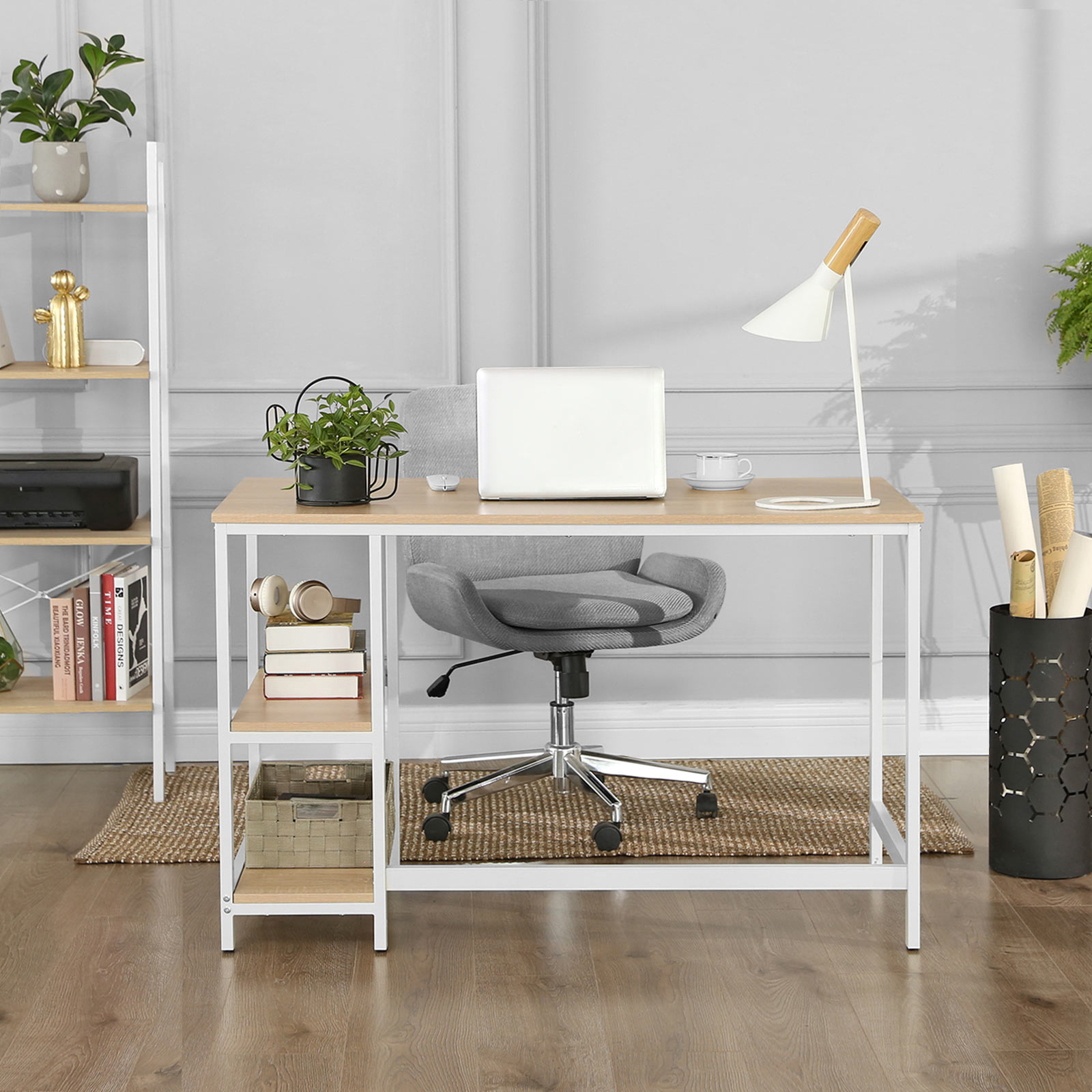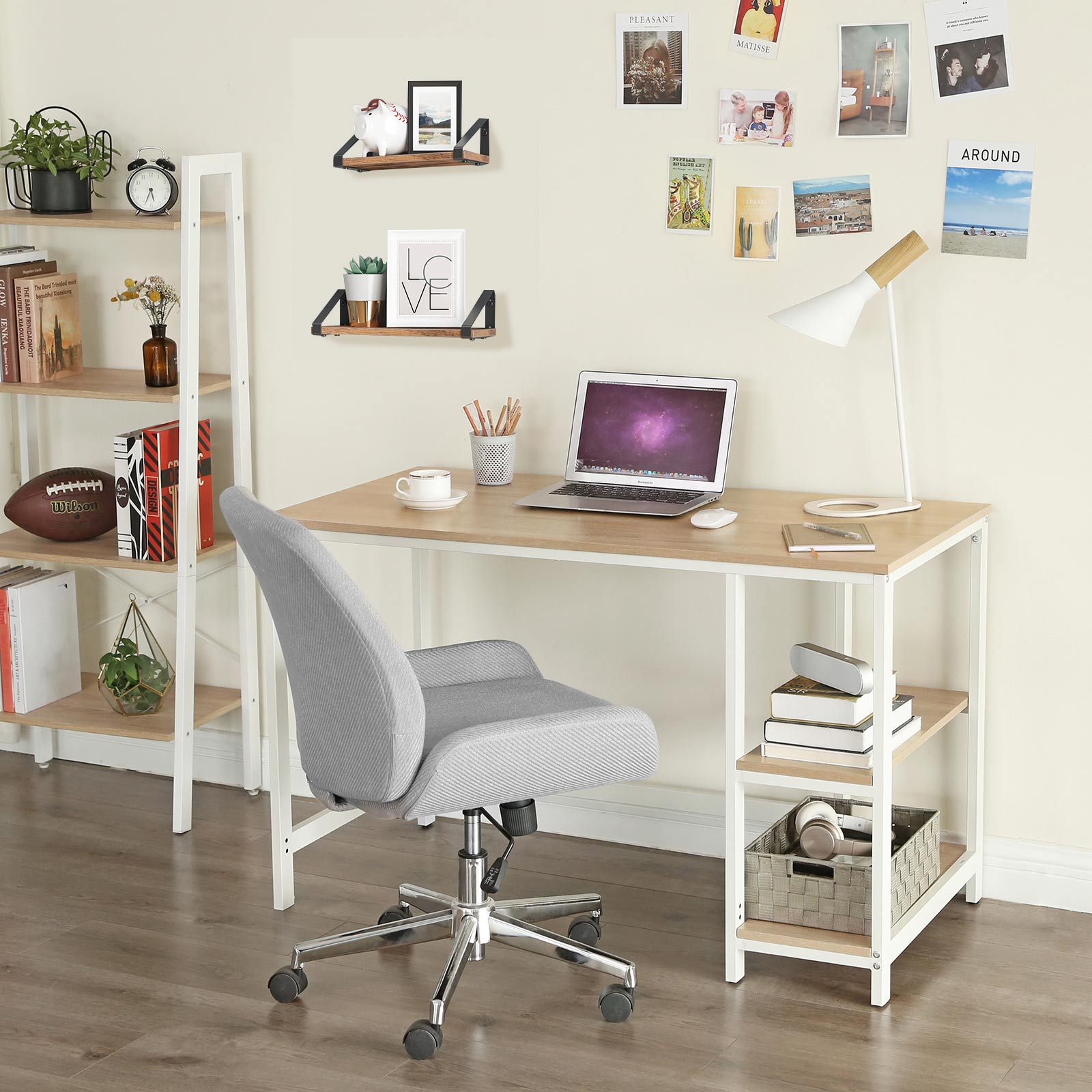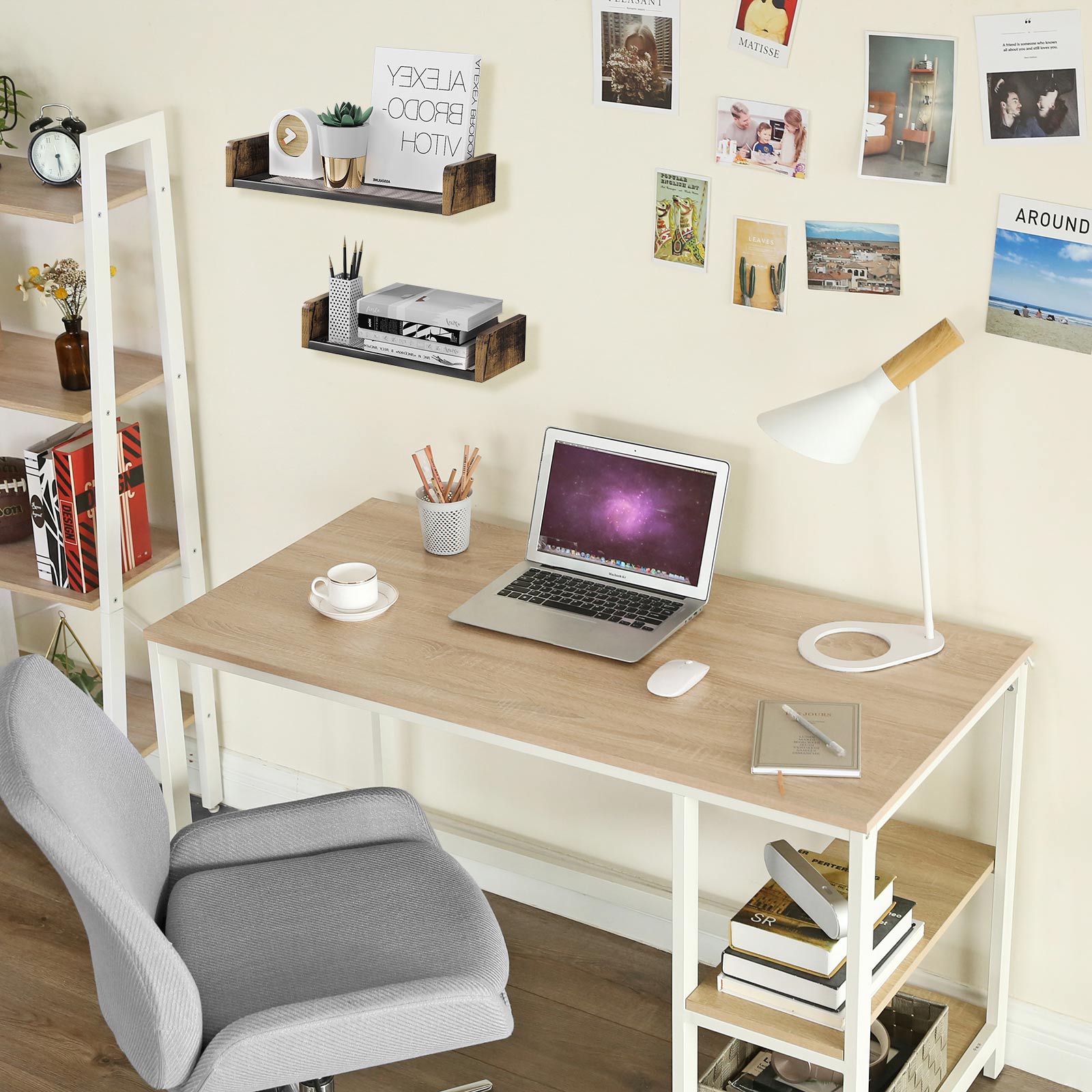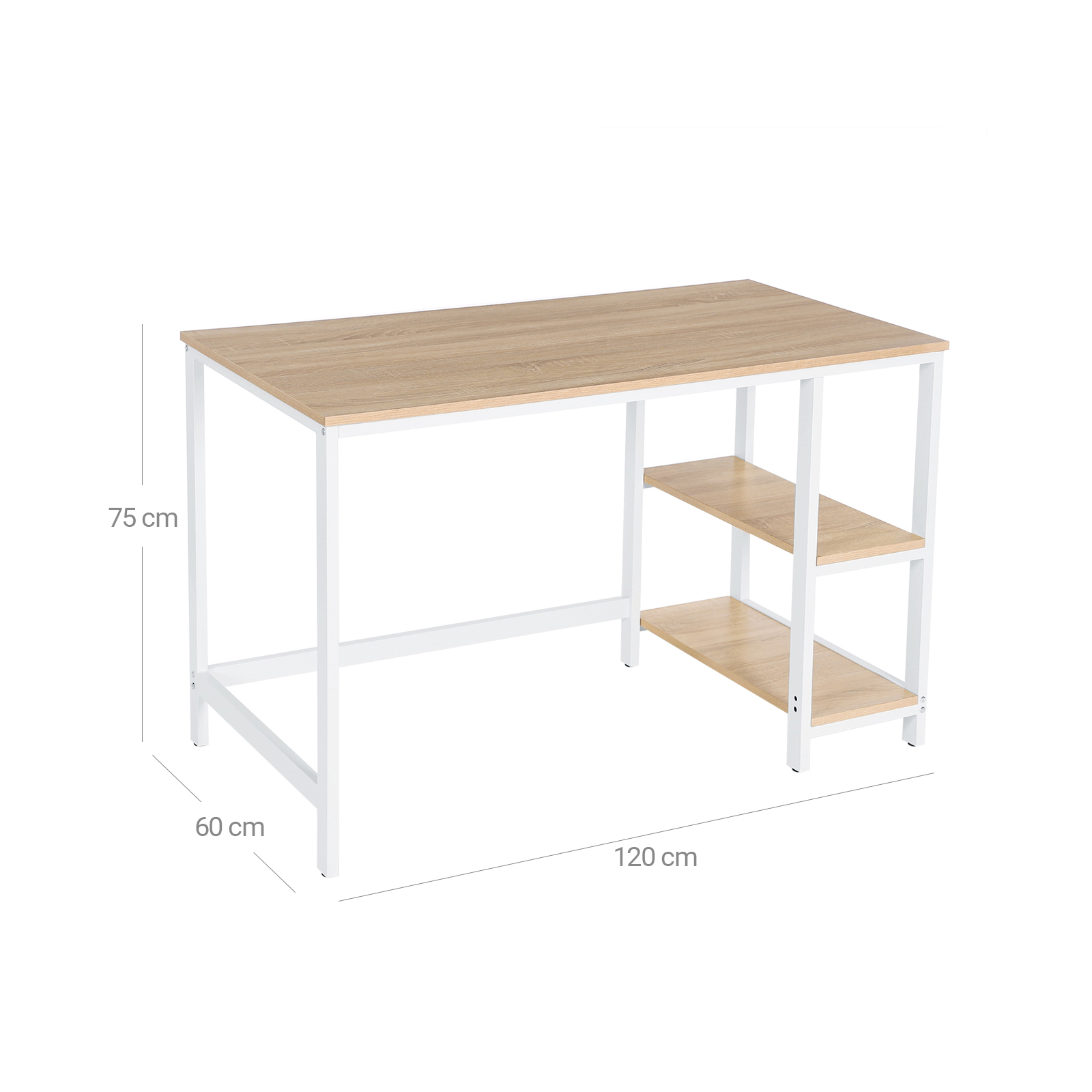 Ole tuottelias, mutta tyylikkäästi! Anna työpöydällesi yhtä hyvä ulkonäkö kuin työllesi. Sijoita tämä moderni VASAGLE-pöytä toimistoosi, makuuhuoneeseesi, olohuoneeseesi, työhuoneeseesi tai yksinkertaisesti sinne, missä olet tuotteliain. Tietokonepöytä vakuuttaa paitsi tyylikkäällä muotoilullaan myös tukevalla 1,2 mm paksulla rautakehyksellä ja kestävällä lastulevyllä.Vasen vai oikea? Päätös on sinun! Tässä työpöydässä on kaksi hyllytasoa, jotka voidaan asentaa joko oikealle tai vasemmalle puolelle, aivan kuten haluat! Aseta niille koriste-esineitä, kirjoja, asiakirjoja tai tärkeitä muistiinpanoja, jotta ne ovat mahdollisimman nopeasti ja helposti saatavilla. Jos sinulla on tietokone, jossa on ulkoinen asema, voit poistaa ylemmän hyllytason ja asettaa aseman alemmalle hyllylle. Älä pelkää kokoonpanoa. Ohjeemme on helppo ymmärtää ja toimitamme tarvittavat työkalut mukana. Tuotetiedot: – Väri: puunsyykuvio, valkoinen – Materiaali: lastulevy, metalli – Koko: 120 x 60 x 75 cm (P x L x K) – Paino: 20,5 kg Toimitus sisältää: – 1 x työpöytä – 1 x asennustyökalu – 1 x tarvikepussi – 1 x ohjeet (DE, EN, FR, ES, IT) VASAGLE Huomautukset:- Pidä tuote kaukana tulen lähteistä. – Älä aseta kuumia esineitä pöydän pinnalle. – Vältä tuotteen pitkäaikaista kosketusta veden kanssa. – Pidä pöytä kaukana terävistä ja terävistä esineistä.