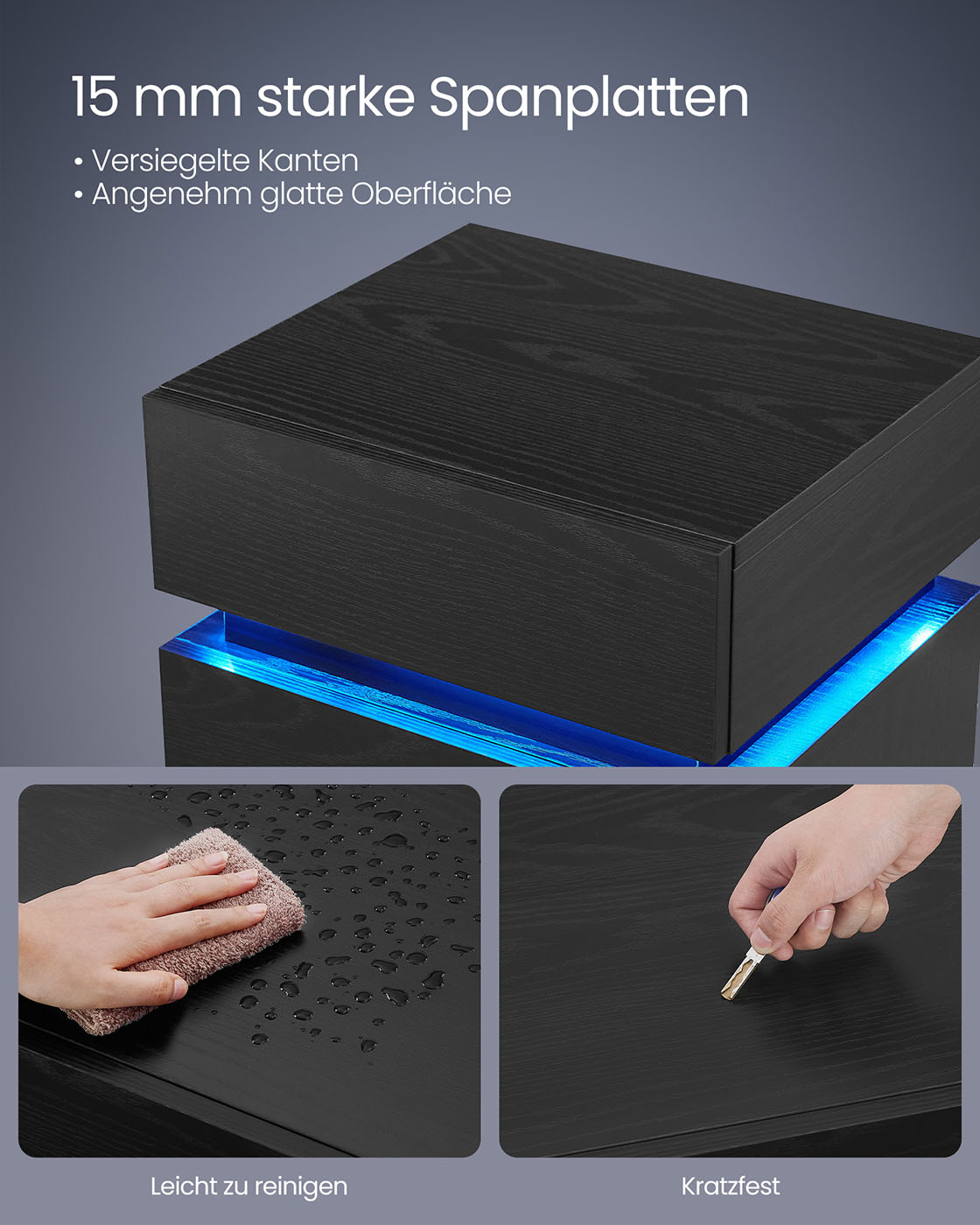 VASAGLE Yöpöytä LED-valaistuksella, 2 kpl, sivupöytä, säädettävät värit, sohvapöytä 3 laatikkoa, yöpöytä makuuhuoneeseen, moderni, 35 x 40 x 55 cm, musta puuviilulla LET0830B01