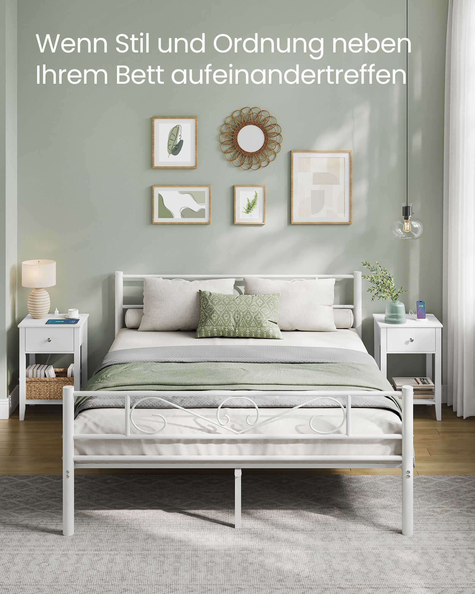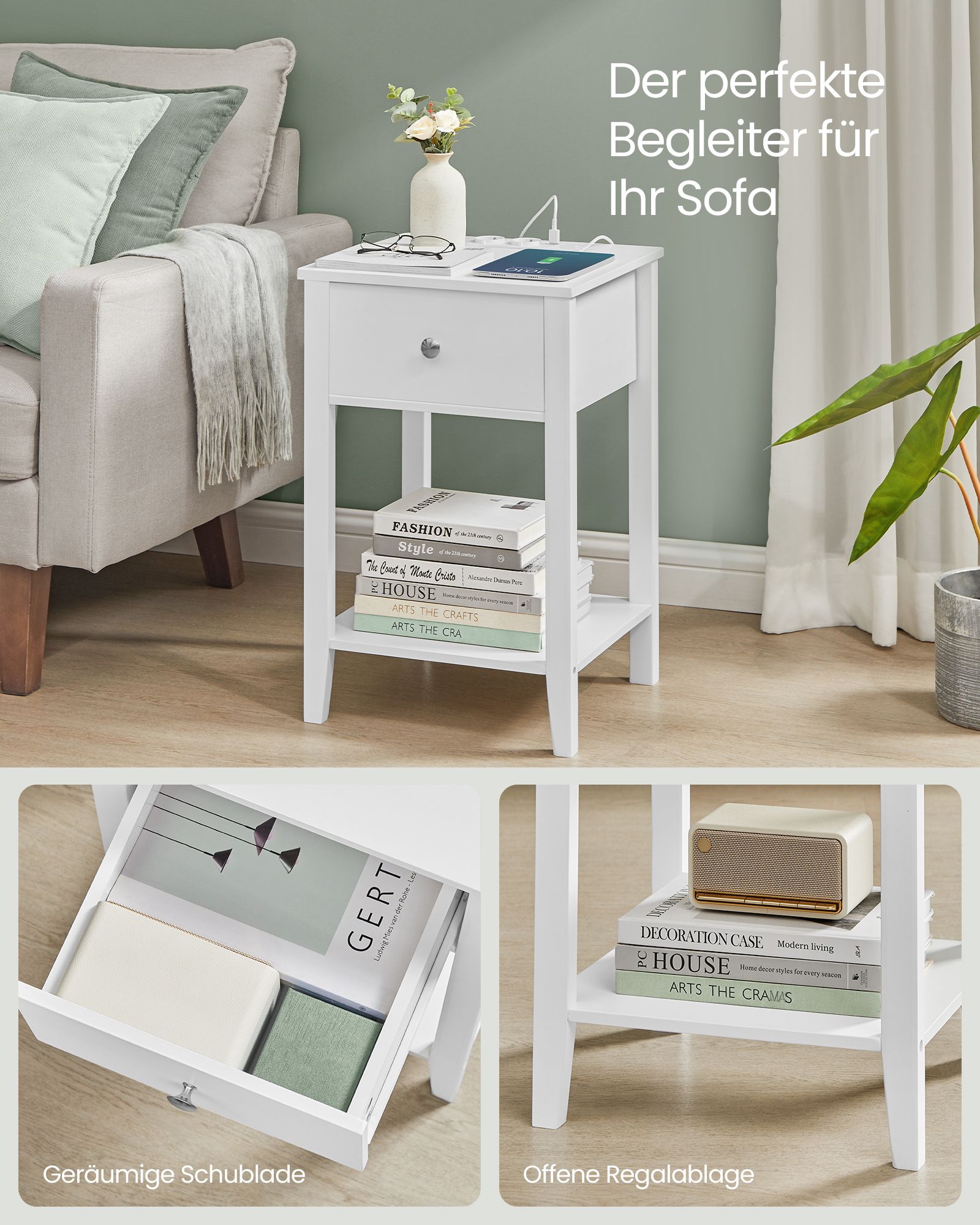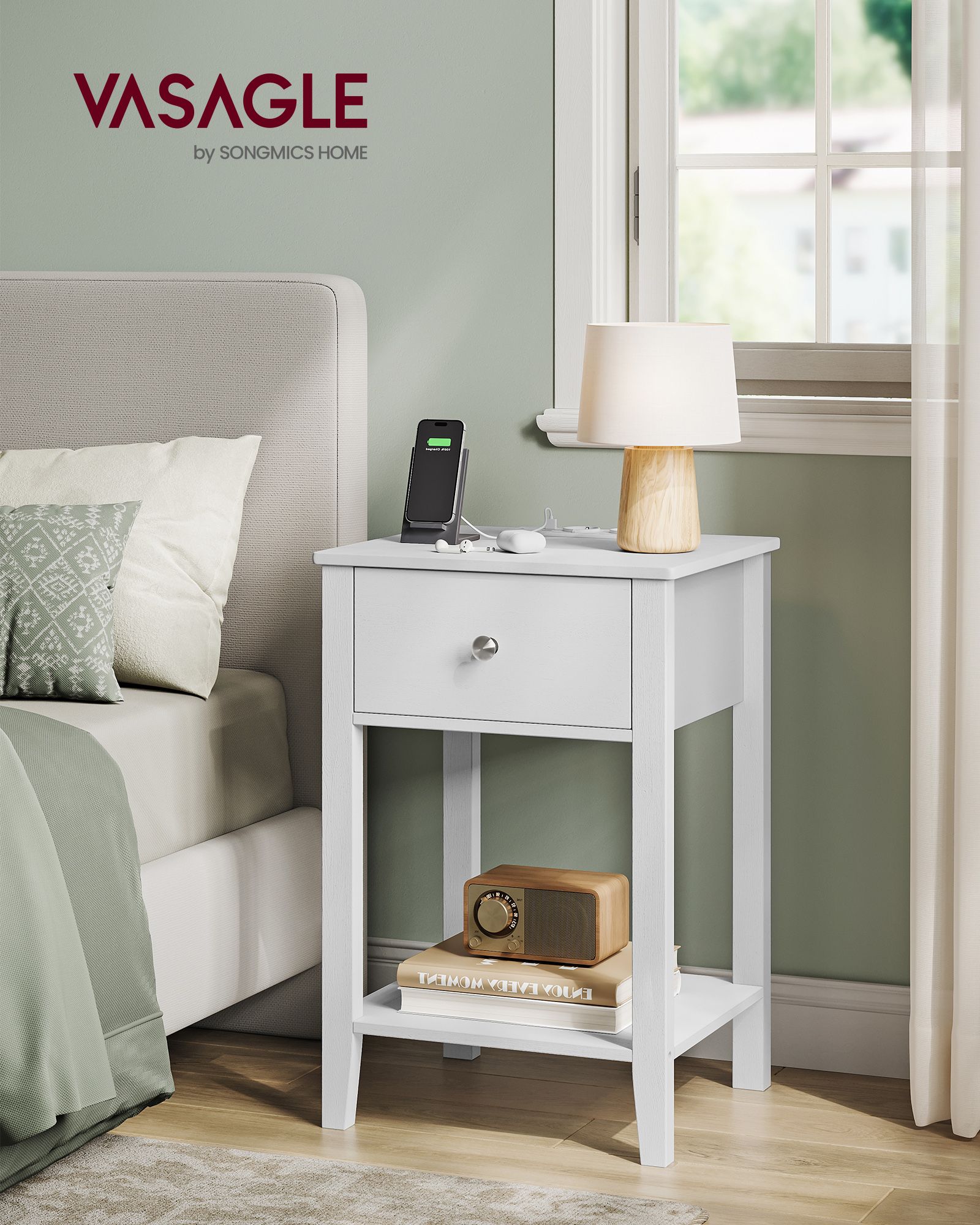 VASAGLE bambusta valmistettu yöpöytä, sivupöytä, jossa on säilytystila, laatikko, avoin hylly, 2 USB-A-liitäntää, 2 AC-liitäntää, minimalistinen, olohuoneeseen, makuuhuoneeseen, sohvalle