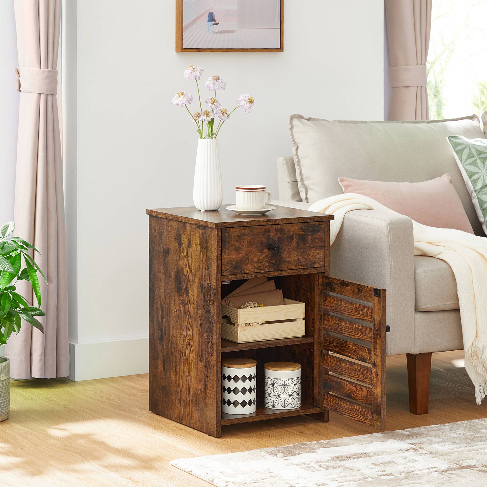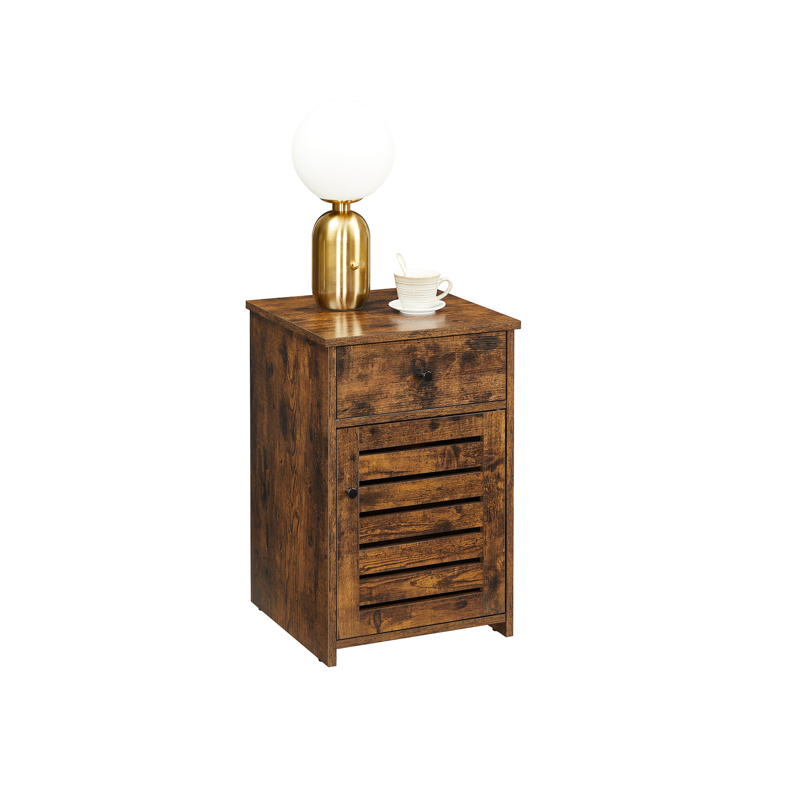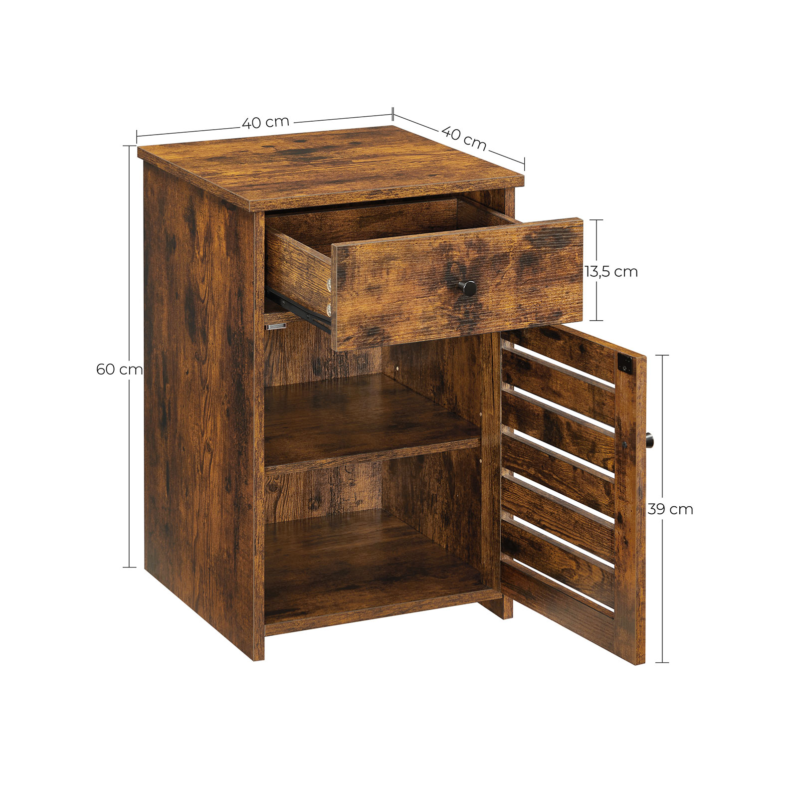 Tuotetiedot: – Väri: vintage-ruskea – Materiaali: lastulevy – Koko: 40 x 40 x 60 cm (P x L x K) – Paino: 13,7 kg – Maks. staattinen kantavuus: 20 kg Toimitus sisältää: – 1 x yöpöytä – 1 x lisävarustepaketti – 1 x kaatumissuoja – 1 x ohjeet VASAGLE Huomautukset:- Turvallisuussyistä lapset eivät saa kiivetä tuotteelle tai leikkiä sillä. – Voit kiinnittää tämän tuotteen seinään mukana toimitetulla kaatumissuojalla sen vakauttamiseksi entisestään.