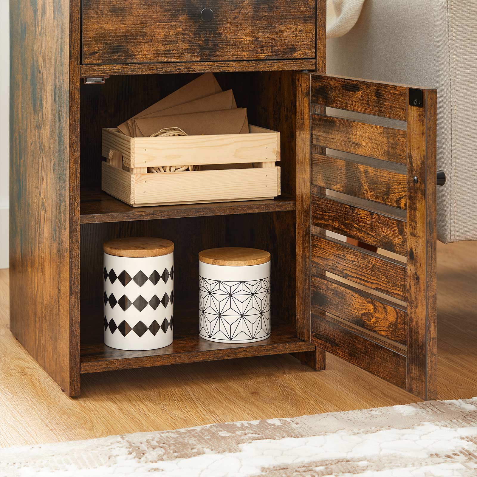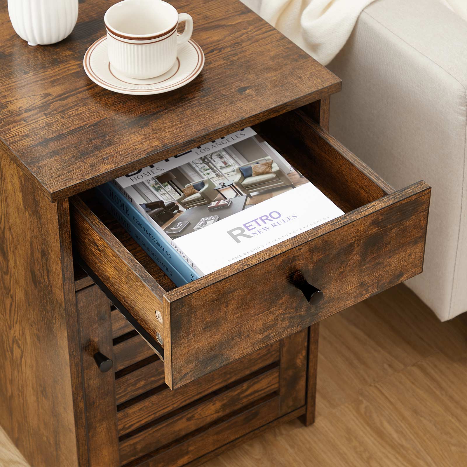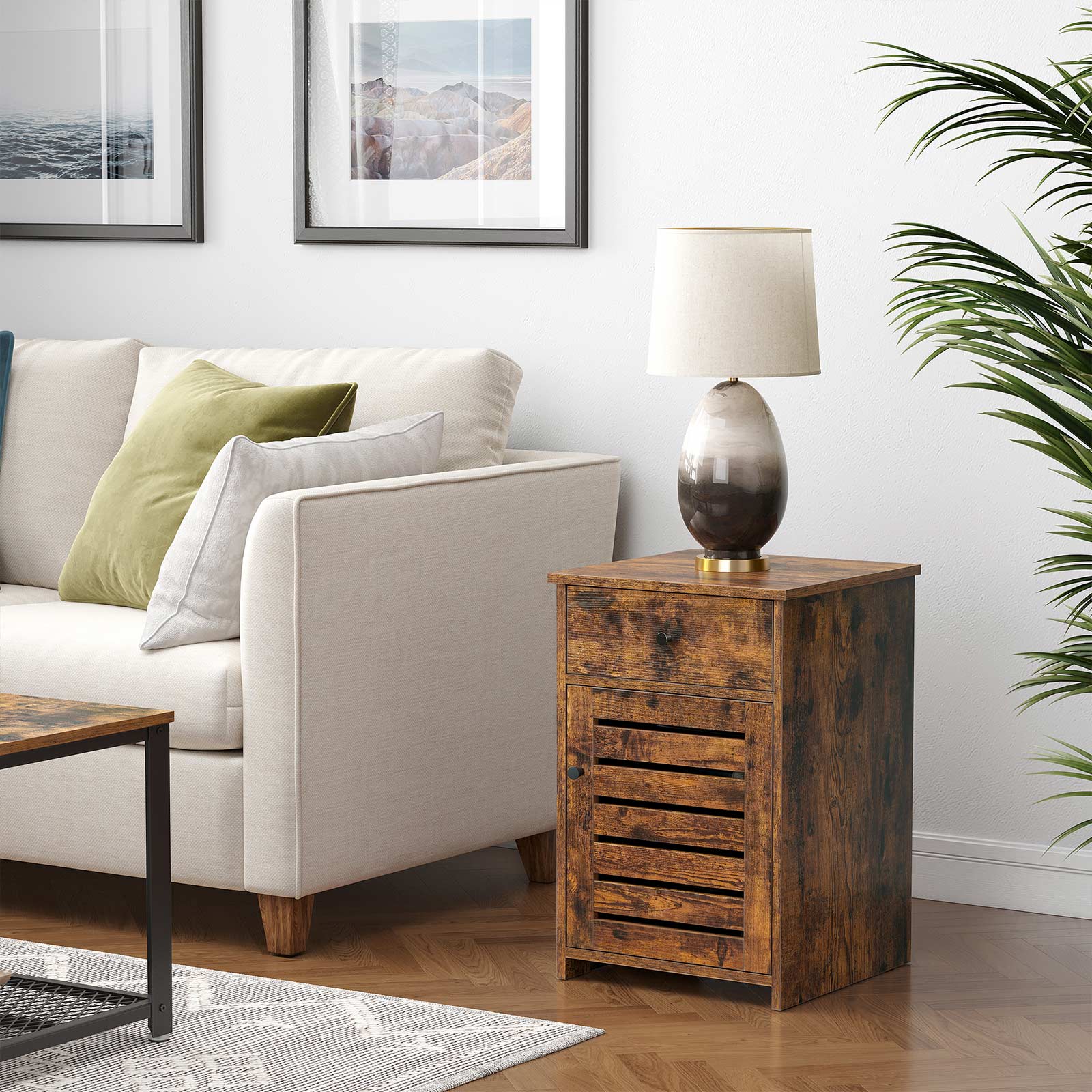 Tuotetiedot: – Väri: vintage-ruskea – Materiaali: lastulevy – Koko: 40 x 40 x 60 cm (P x L x K) – Paino: 13,7 kg – Maks. staattinen kantavuus: 20 kg Toimitus sisältää: – 1 x yöpöytä – 1 x lisävarustepaketti – 1 x kaatumissuoja – 1 x ohjeet VASAGLE Huomautukset:- Turvallisuussyistä lapset eivät saa kiivetä tuotteelle tai leikkiä sillä. – Voit kiinnittää tämän tuotteen seinään mukana toimitetulla kaatumissuojalla sen vakauttamiseksi entisestään.