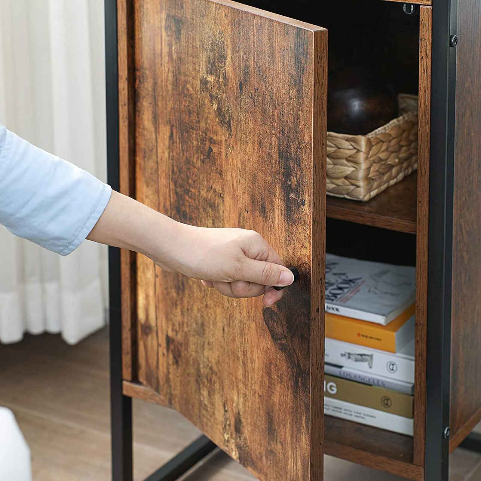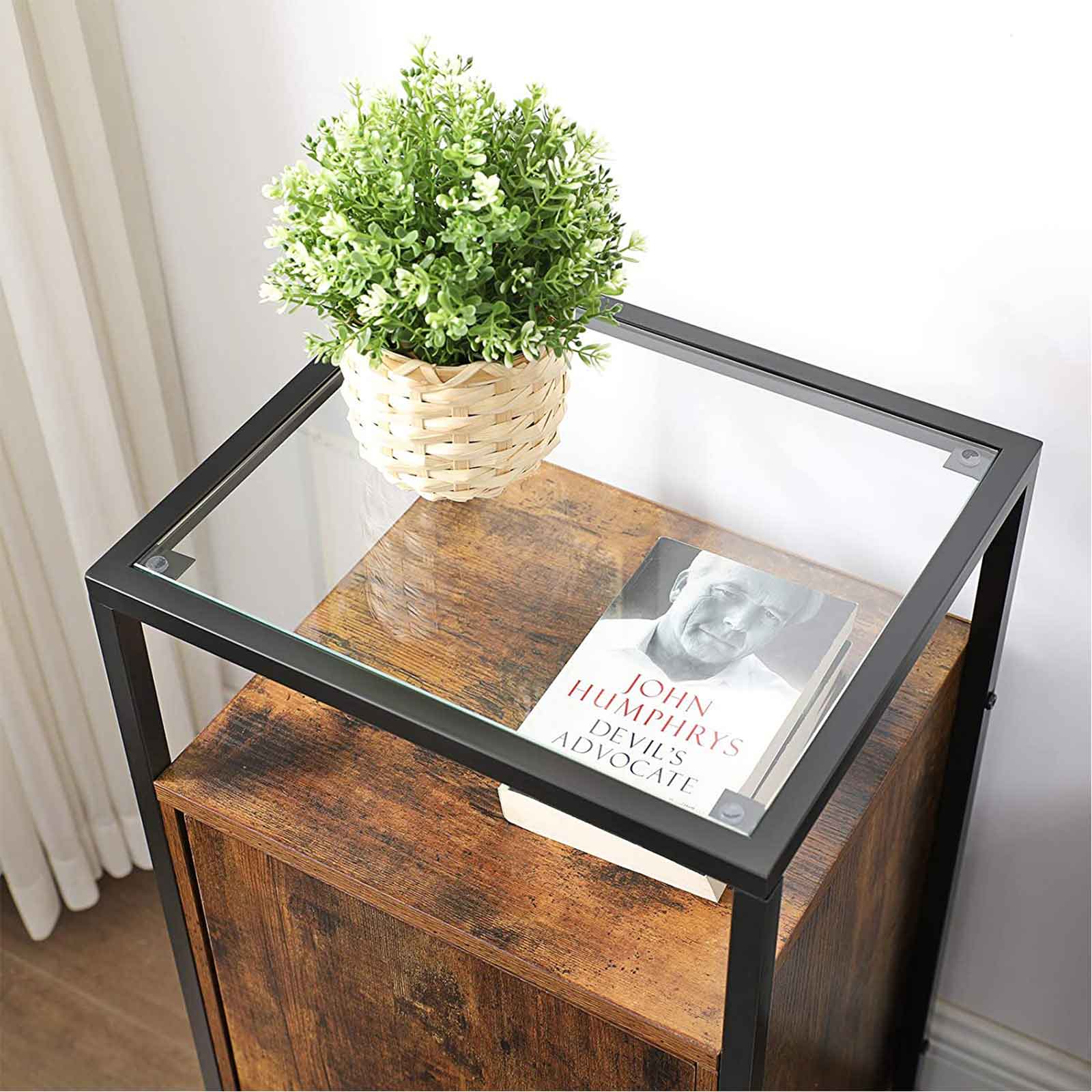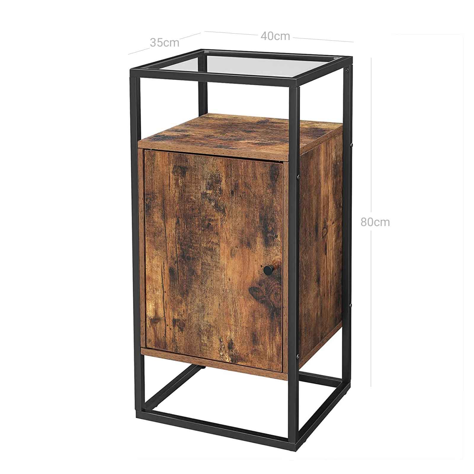 Tuotetiedot: – Väri: vintage-ruskea-musta – Materiaali: lastulevy, teräs, karkaistu lasi – Koko: 40 x 35 x 80 cm (P x L x K) – Paino: 13,2 kg – Lasipinnan maks. staattinen kantavuus: 30 kg – Muiden hyllyjen maks. staattinen kantavuus: 10 kg Toimitus sisältää:- 1 x yöpöytä lasipinnalla – 1 x lisävarustepaketti – 1 x kaatumissuoja – 1 x ohjeet (DE, EN, ES, FR, IT) VASAGLE Huomautukset: – Turvallisuussyistä lapset eivät saa kiivetä tuotteen päälle tai leikkiä sillä. – Kiinnitä tämä tuote seinään mukana toimitetulla kaatumissuojalla.