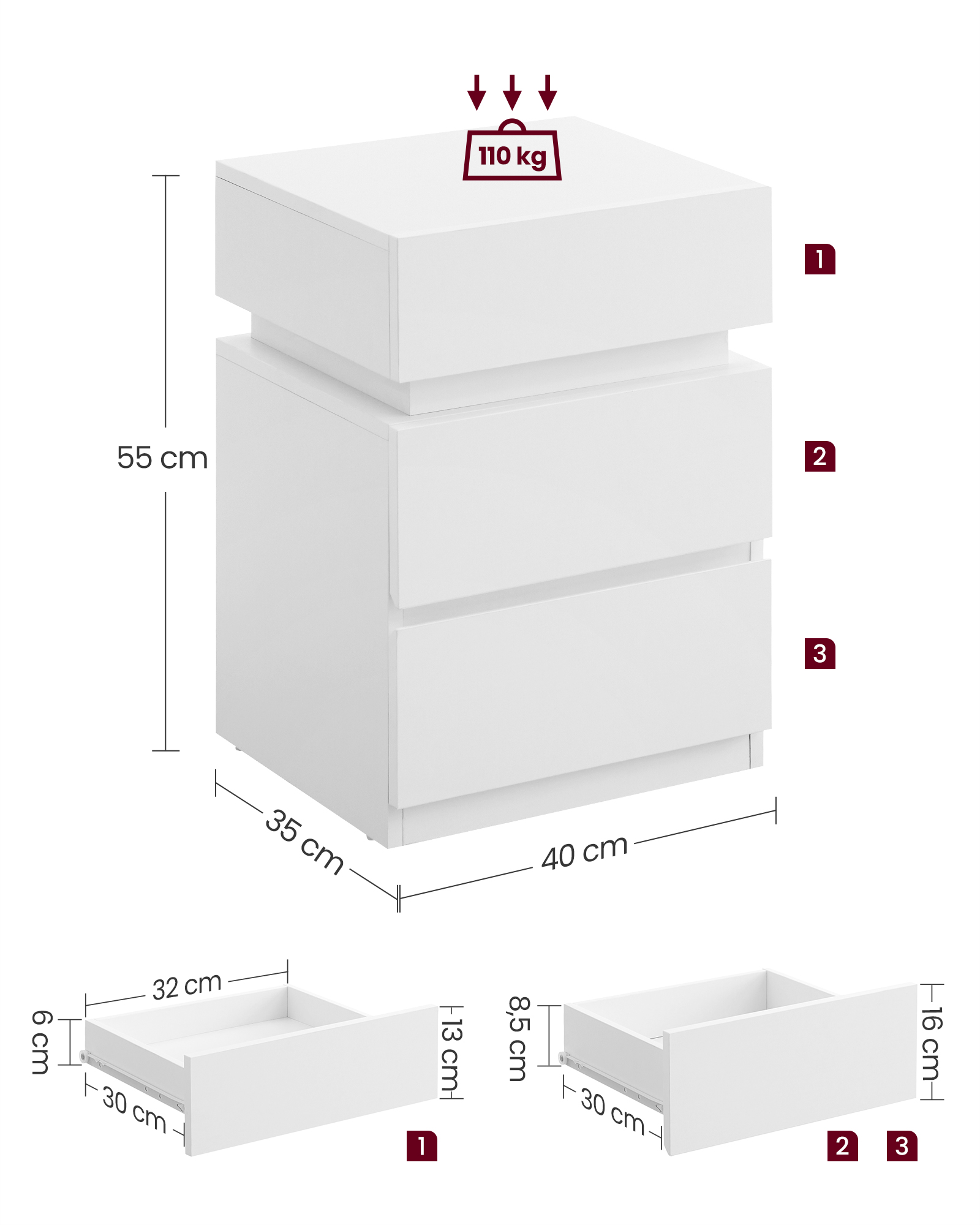 Tuotetiedot: – Väri: valkoinen – Materiaali: lastulevy – Koko: 33,5 x 40 x 55 cm (S x L x K) – Paino: 15,4 kg – Ylimmän laatikon suurin staattinen kantavuus: 2,3 kg – Kahden alimman laatikon suurin staattinen kantavuus: 3,4 kg – Suurin staattinen kantavuus yhteensä: 110 kgToimitus sisältää:- 1 x sivupöytä – 1 x lisävarustepaketti – 1 x ohjeet VASAGLE Huomautukset: – Turvallisuussyistä lapset eivät saa kiivetä puhelintelineelle tai leikkiä sillä.