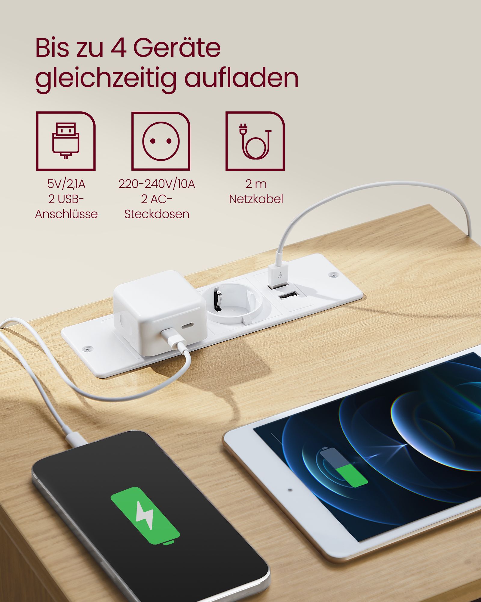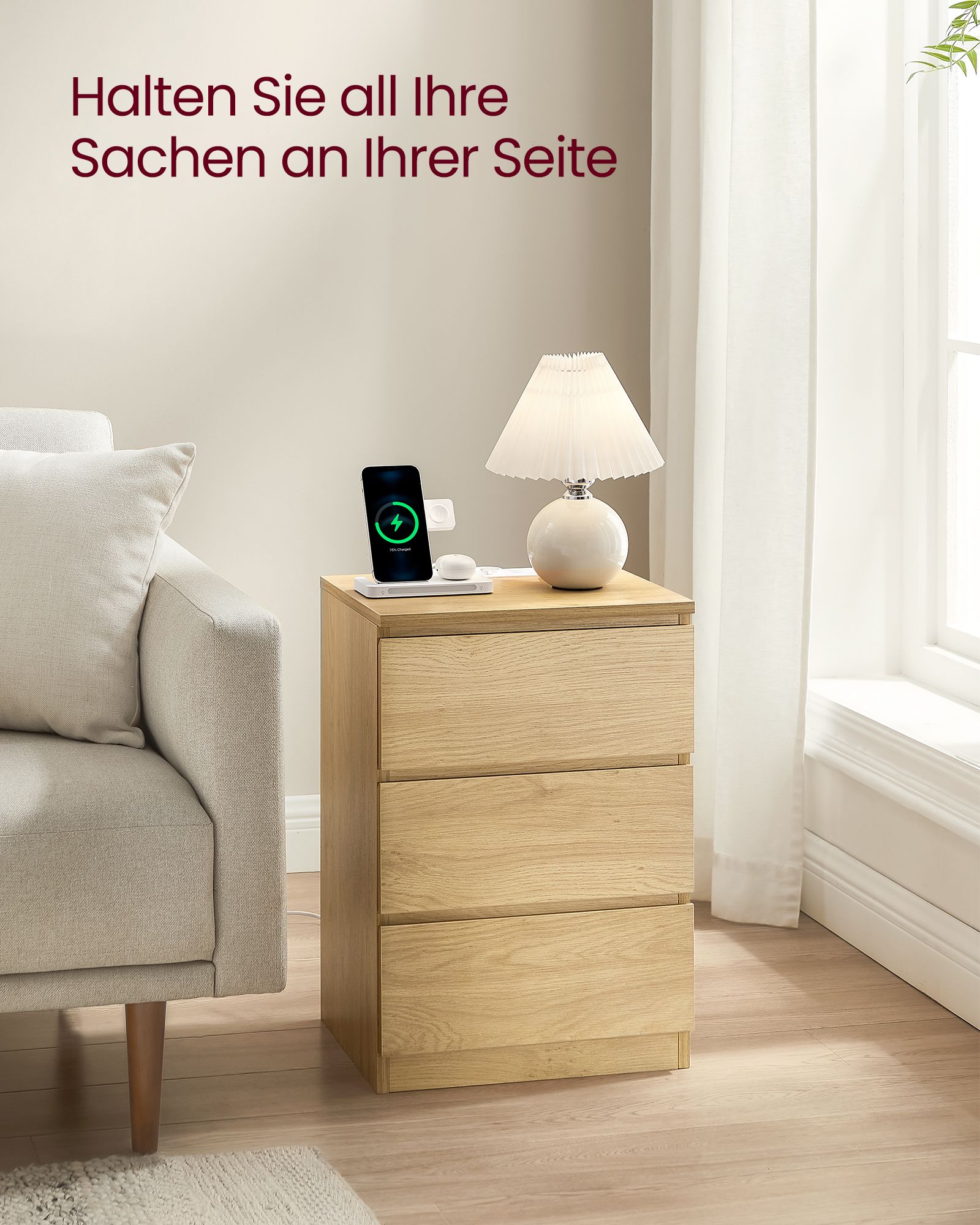 VASAGLE yöpöytä, sivupöytä, 3 laatikkoa, viistetty reuna, 2 AC-pistorasiaa, 2 USB-liitäntää, olohuone, makuuhuone, työhuone, moderni