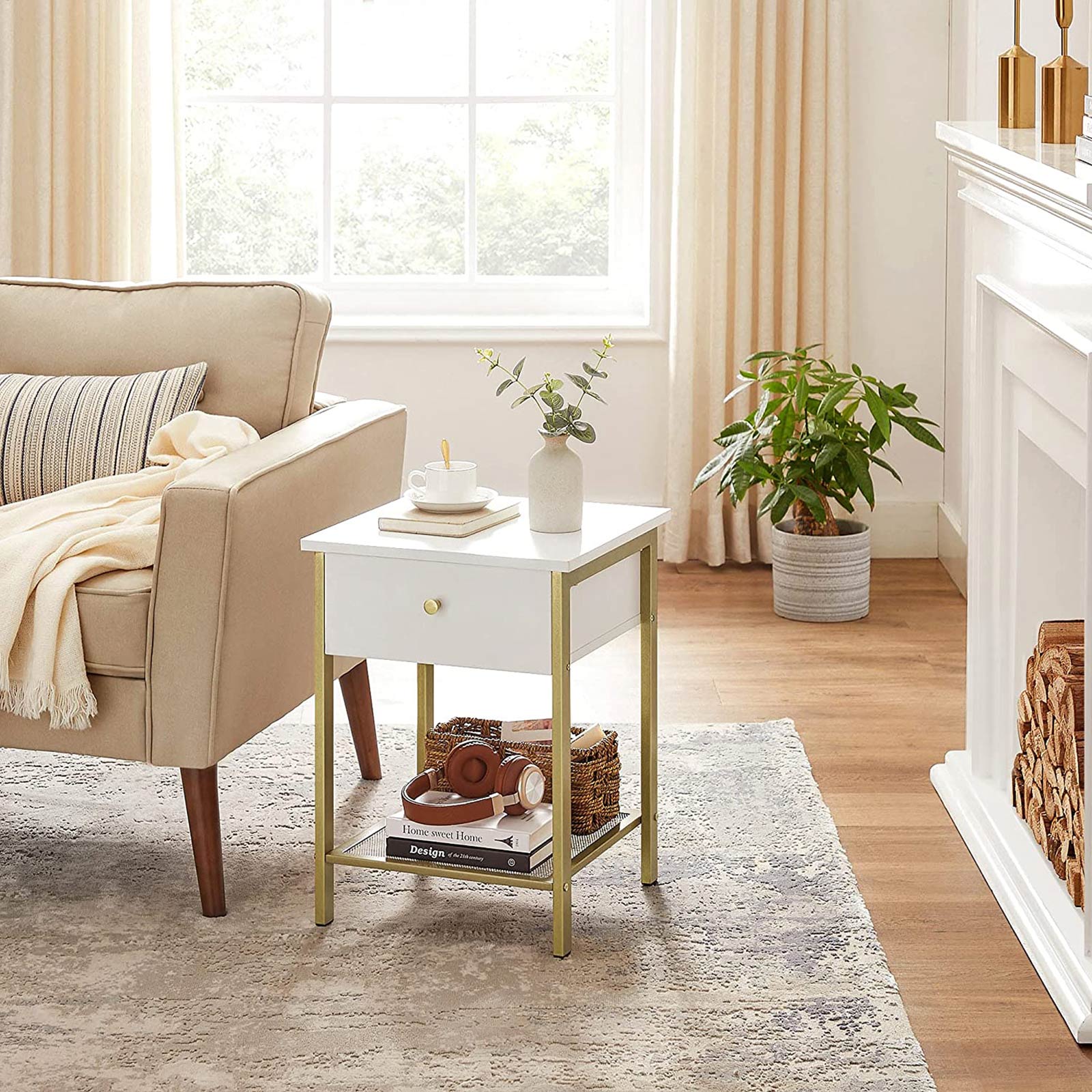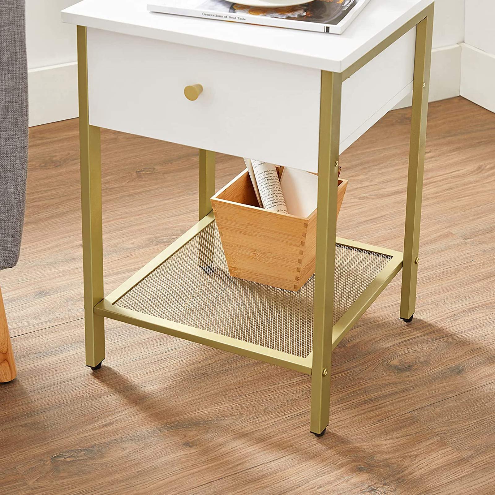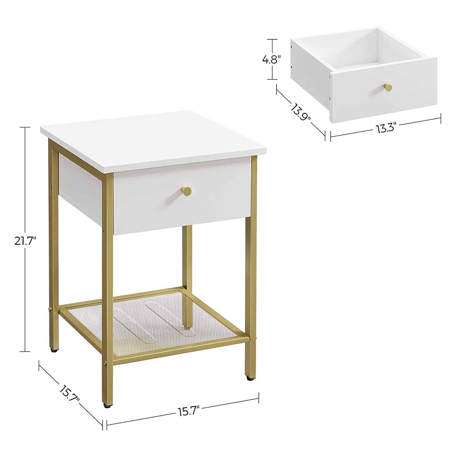 Tuotetiedot: – Väri: valkoinen-kulta – Materiaali: lastulevy, teräs – Koko: 40 x 40 x 55 cm (P x L x K) – Paino: 8,9 kg – Pöydän pinnan maks. staattinen kantavuus: 20 kg – Hyllykön maks. staattinen kantavuus: 5 kg – Laatikon maks. staattinen kantavuus: 5 kg Toimitus sisältää: – 1 x sivupöytä – 1 x lisävarustepaketti – 1 x ohjeet VASAGLE Huomautukset:- Turvallisuussyistä lapset eivät saa kiivetä tuotteelle tai leikkiä sillä.