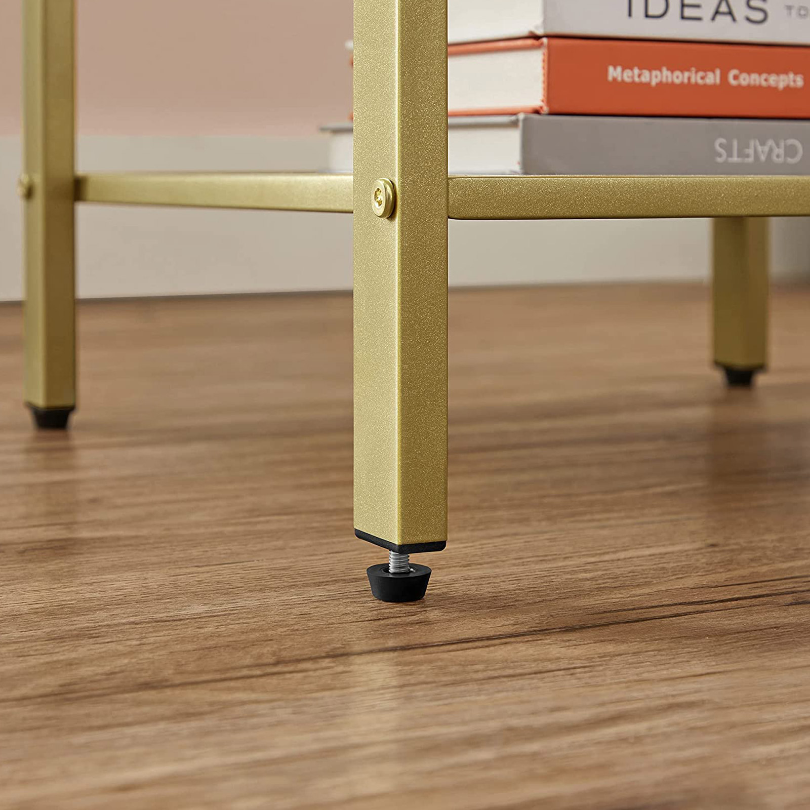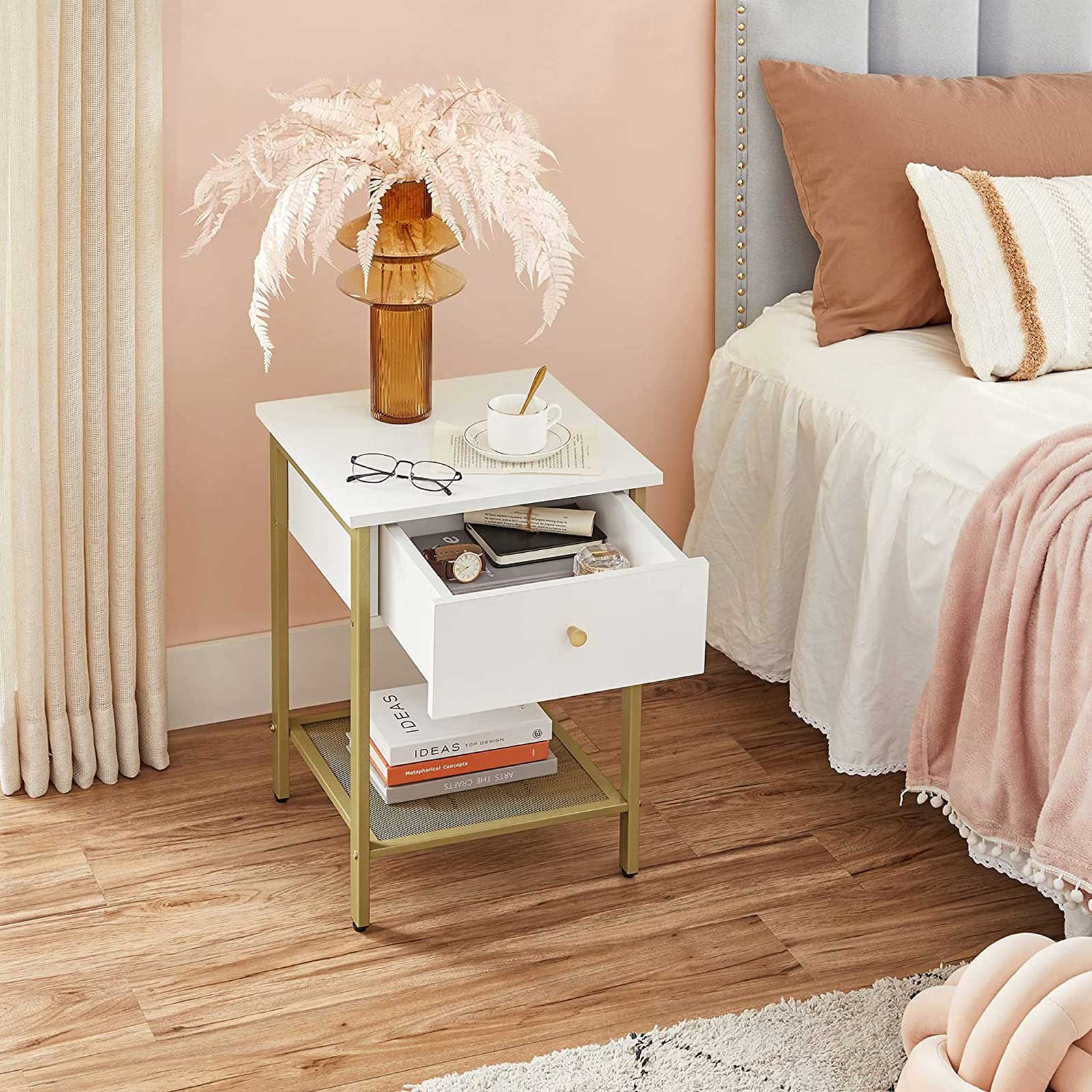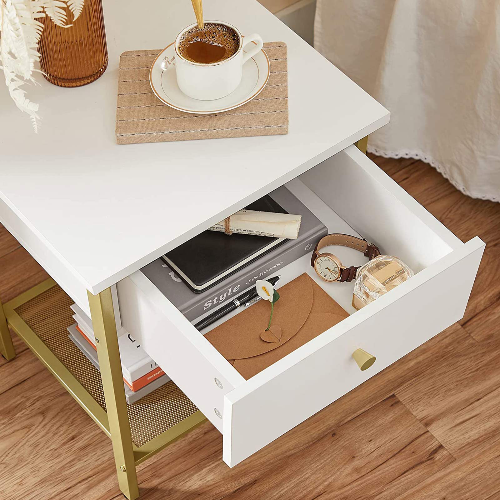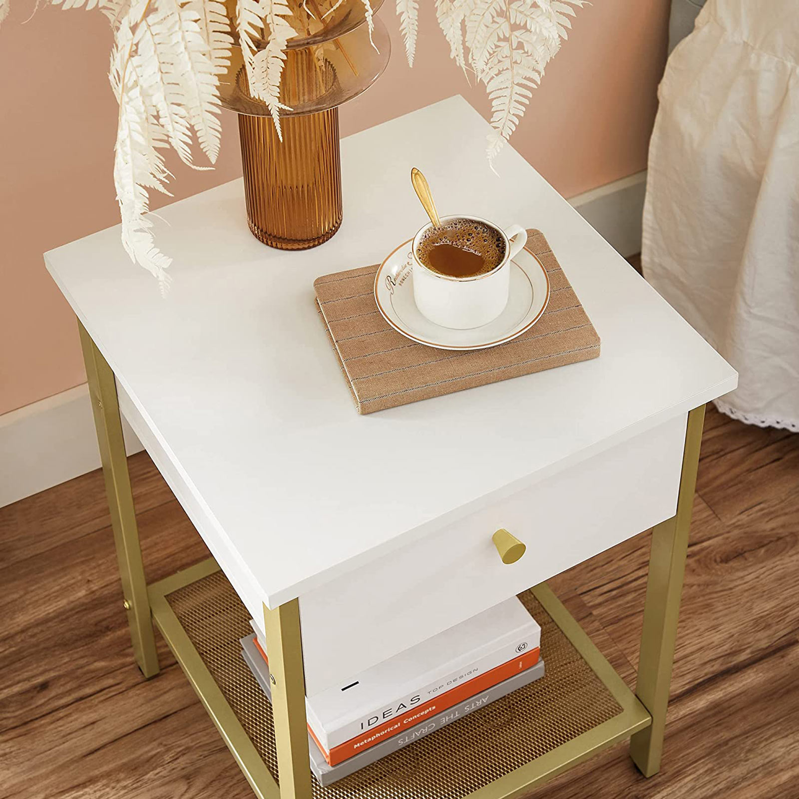 Tuotetiedot: – Väri: valkoinen-kulta – Materiaali: lastulevy, teräs – Koko: 40 x 40 x 55 cm (P x L x K) – Paino: 8,9 kg – Pöydän pinnan maks. staattinen kantavuus: 20 kg – Hyllykön maks. staattinen kantavuus: 5 kg – Laatikon maks. staattinen kantavuus: 5 kg Toimitus sisältää: – 1 x sivupöytä – 1 x lisävarustepaketti – 1 x ohjeet VASAGLE Huomautukset:- Turvallisuussyistä lapset eivät saa kiivetä tuotteelle tai leikkiä sillä.