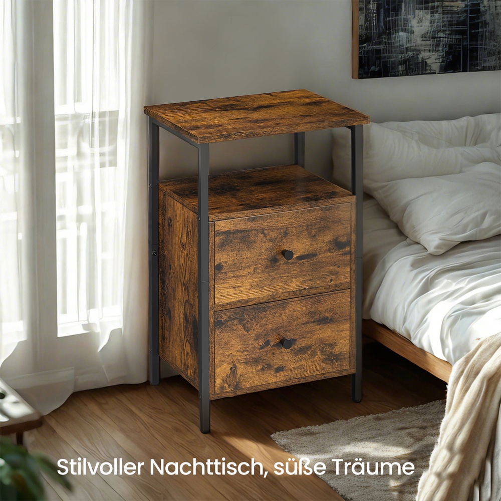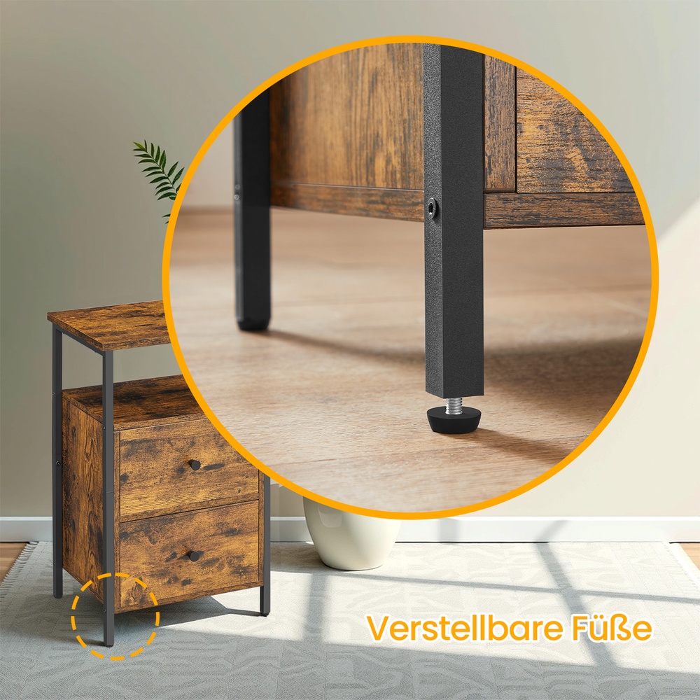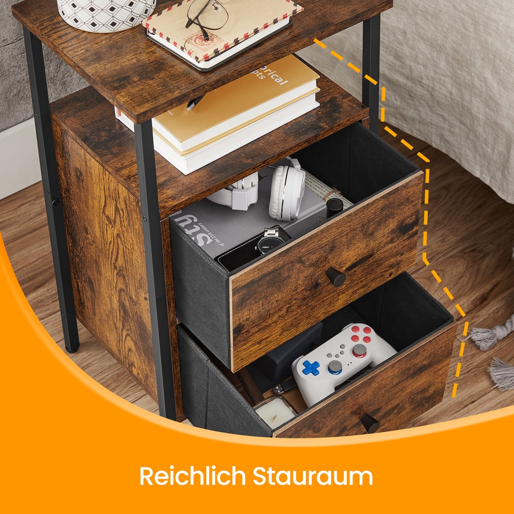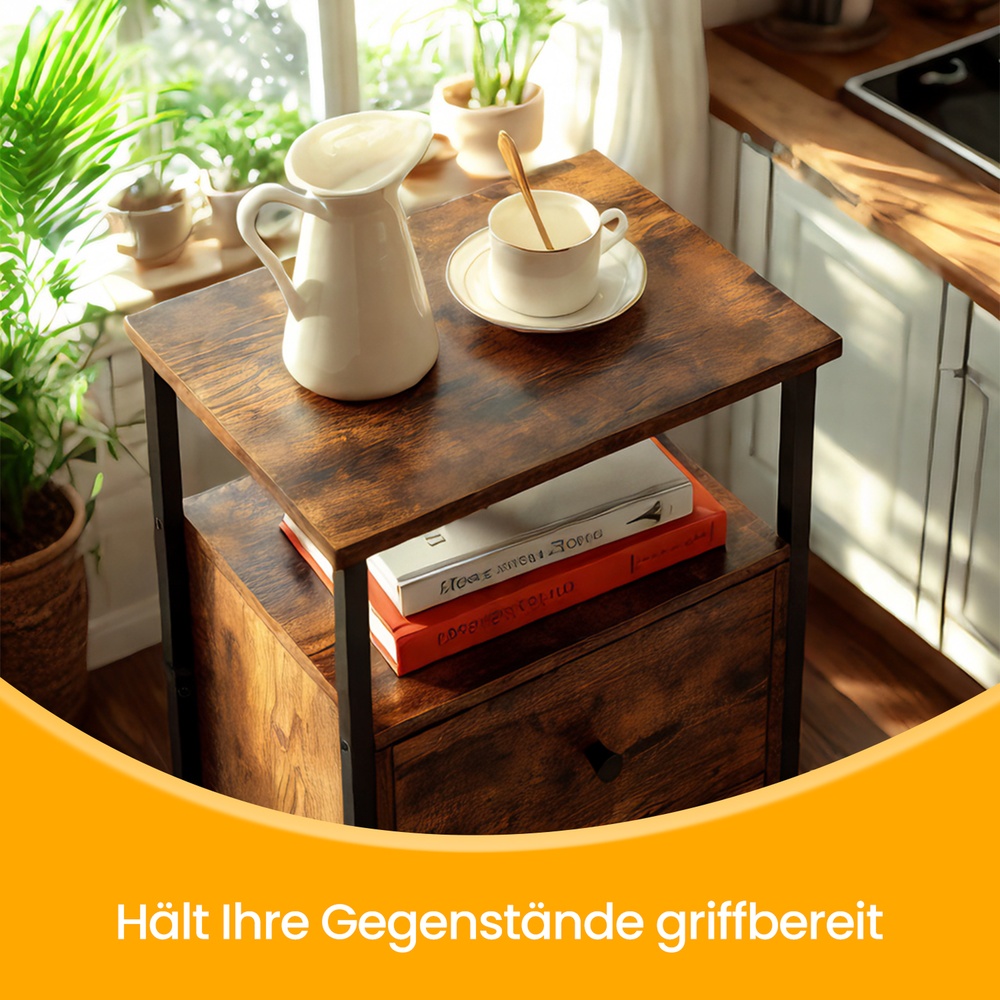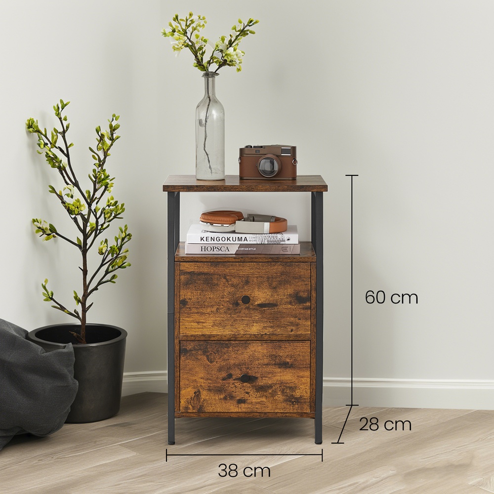 Tuotetiedot: – Väri: vintage-ruskea-musta – Materiaali: lastulevy, teräs, pahvi, kuitukangas – Koko: 38 x 28 x 60 cm (P x L x K) – Paino: 7,7 kg – Pöydän pinnan maks. staattinen kantavuus: 10 kg – Avoimen lokeron maks. staattinen kantavuus: 10 kg – Laatikon maks. staattinen kantavuus: 5 kg Toimitus sisältää: – 1 x sivupöytä – 1 x lisävarustepaketti – 1 x ohjeet VASAGLE Huomautukset:- Turvallisuussyistä lapset eivät saa kiivetä tuotteelle tai leikkiä sillä.