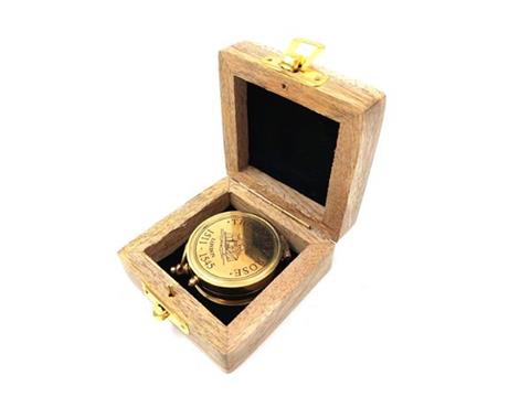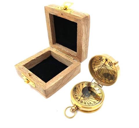 Brass compass with sundial in wooden box 1058 Brass Compass with Sundial is a navigational instrument made with attention to detail and finished in a retro style. It is useful during a field trip, hiking, or walking in the woods. It will help you orient yourself in the area, read the map and set the local time. Compass with a sundial is a useful gift for a traveler, a trekking lover, and anyone who likes to wander around from time to time. The compass housing is made of brass. Arabic numerals on the face indicate the hours of the clock. After opening the device, a gnomon in the form of a rope will automatically unfold. The sundial should be positioned so that it has access to the sun. The gnomon will cast a shadow on the local time. Under the clock face, you will find a compass. A ring fixed to the housing allows attaching a chain or thong to the compass. The compass comes with a wooden box. Information: Dimensions: Ø 4,5 cmMaterial: brass, glassColour: brassInscriptions: blackMagnetic needleLockable compassInscription on the top: The Mary Rose, London 1511-1545 Box: Dimensions: 7,5×7,5×3,5cmColor: natural mangoMaterial: mango wood