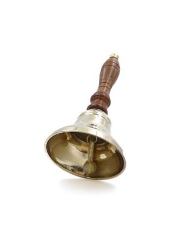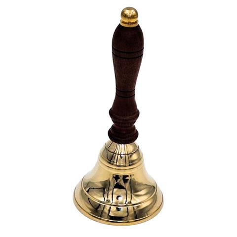 Brass Hand Bell with Wooden Handle – Retro Style – HB70/3 Brass hand bell with a wooden handle, designed in a classic retro style. The traditional form evokes a colonial-era aesthetic, making it suitable as a decorative accent or a functional tool for various commercial and thematic settings. Produces a clear, loud sound. Product Information: Materials: brass, woodDiameter: 7.5 cmColor: gold, brownStyle: retro, vintage, colonialSound: loud and resonant Perfect as: A decorative element in vintage, rustic, or colonial interiorsA prop for theatrical productions, films, or eventsA functional accessory for restaurants, hotels, or reception desksA gift for collectors or enthusiasts of historical items