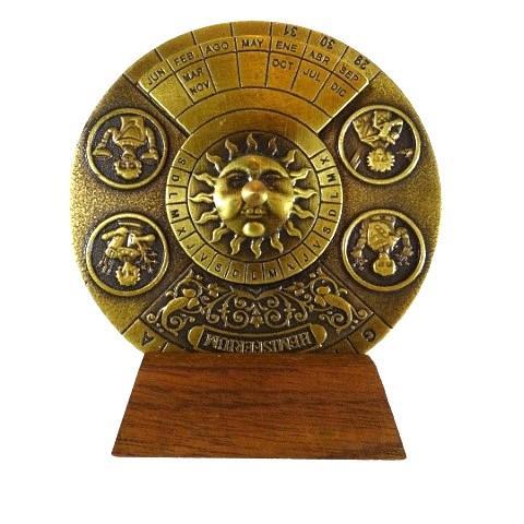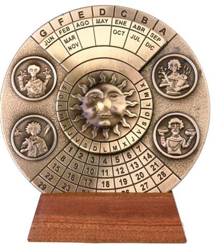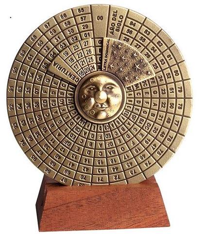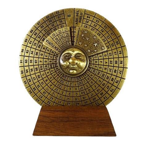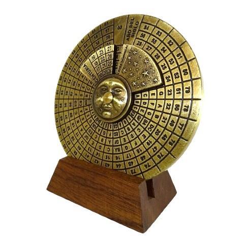Perpetual Calendar H27 The Perpetual Calendar allows you to find every day of the week from 1600-2799! The Calendar uses an old system called Dominical letters – Sunday letters. The calendar is beautifully decorated in Renaissance style. It will work well as a gift for a lover of history and technical monuments, a manager, or a fan of astrology. It will look great on a desk in a study or office. Product Information: Dimensions: Diameter 9 cmRenaissance styleOriginal instruction manual in several languages: English, French, Spanish, ItalianGift packaging: beautiful gift box with molded case How to use the perpetual calendar? Let's say we want to check what day of the week it is on March 2, 2019. To do this, we turn the calendar to the side of the moon's smiley face. We search for the number 20 on the moving ring and align it with the number 19, which we find on the stationary dial. Next, we move the Letra Dominical lettering to the 19, which allows us to see what letter was under the 20 when the 20 and 19 were aligned . In our case it is the letter F. The next move is on the sun's smiley face side. The month of March marked on the moving ring with the letters MAR is placed under F. After that, we see that the 2nd day of the month-we are now looking at the lower part of the stationary dial showing the days from 1 to 31, coincides with the letter S, which means that March 2, 2019 is S – Saturday. In the case of a leap year, it will turn out that we will meet 2 letters in the scepter. Then the rule is that the first one applies to the day up to March 1 of a given year, and the second to any day after March 1 of that year. Other steps as above. Example: let's check what day of the week falls on June 10, 2020. On the moon side, we set 20 of the moving dial under 20 on the stationary one. We use a pinkie and see that there are the letters D,E under 20. We are talking about a date after March 15, so we consider the letter D. With this information we go to the page with the sun's smiley face. JUN – June is set under D. At the bottom we see that the 10th of June is under X- miercoles – Wednesday .