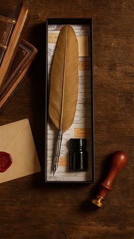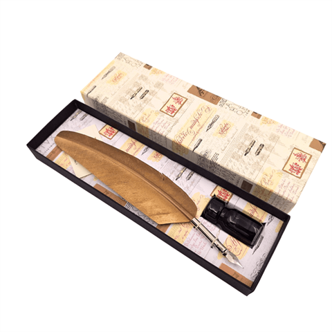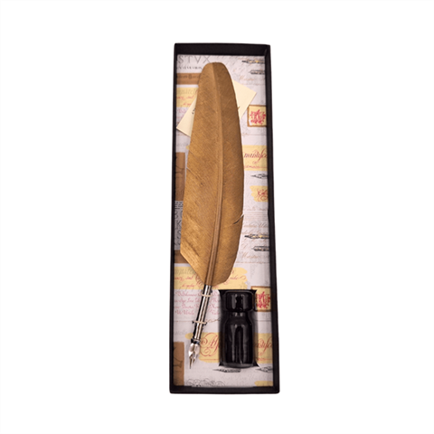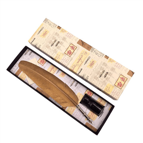 Calligraphy Set – Golden Quill Pen with Nib + Ink – 7262 An elegant calligraphy set inspired by classic Italian writing art. Perfect for lovers of vintage style, calligraphy and people who value unique objects with soul. The set includes: ? Golden quill pen, finished with a precisely made nib? Inkwell with black ink? Aesthetic, gift packaging Parameters: ? Pen length: 24 cm? Dimensions: 26.5 x 8 x 3 cm This set combines elegance and functionality – it will work great both as a desk decoration and in practice – e.g. for creating invitations, letters or decorative signatures. Perfect as a gift – for a calligraphy enthusiast, writer, artist or as an original gift for a special occasion.
