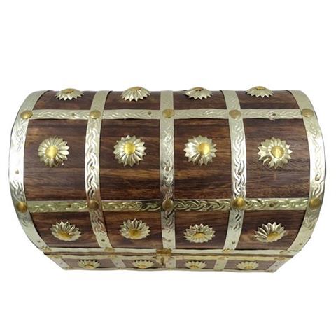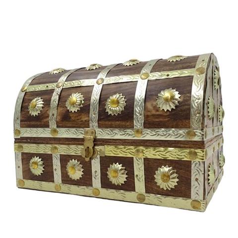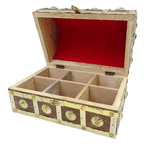Closable Wooden Box – SE28 Closable Wooden Box makes it easy to store your household treasures. The box will hold small jewelry, keys and letters. It can be filled with coins transforming it into a lost treasure chest, which kids will enjoy. The box is made of wood and is richly decorated with metal ornaments that make it look like it came out of a royal treasury. Thanks to its closed age, the box protects objects from dust and getting lost. Wooden Box: Material: wood, metal Dimensions: 22.85 x 15.2 x 15.2 cmColor: brown, gold6 compartmentsRed padding