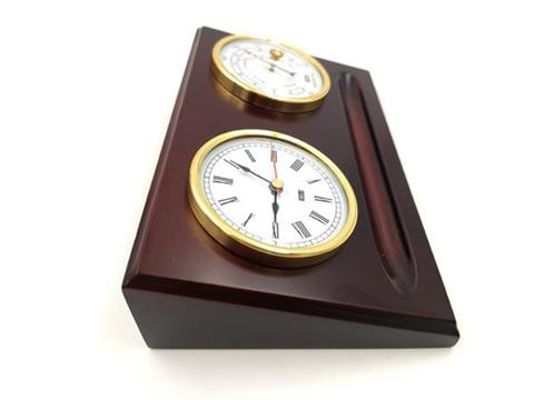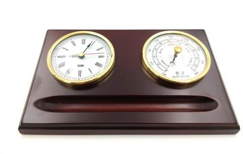 Exclusive desk set: barometer and clock – 28.5161 Introducing an exclusiveand sophisticated desk set, the perfect combination of style and functionality. This beautifully crafted desk set features a barometer and clock, housed in a dark brown wooden frame with brass accents around each instrument. The classic and elegant shape makes it a perfect fit for any office with an eye for sophistication and style. Whether you're a weather enthusiast, or simply looking for a practical and stylish way to keep track of the time and barometric pressure, this desk set is the perfect choice. It also makes a great gift for anyone who appreciates the finer things in life and wants to add a touch of elegance to their workspace. Dimensions: 190x120x55 mm Operating range: Temperature – -20st. to 50st. CelsiusHumidity 20% – 98%Pressure: 1060 hPa – 960 hPa Accuracy: Temperature:+/- 2 deg.Humidity:20%-45% – accuracy +/-9%45%-75% – accuracy +/-6%75%-98% – accuracy +/-9%Atmospheric pressure:1060hPa – 1030hPa +/-10hPa1030hPa – 990hPa +/- 5 hPa990hPa – 960hPa +/-10hPa We suggest placing the weather station in a non-sunny location with fresh air supply and corrosion protection. Avoid contact with water or steam or vibration. The barometer is set at the factory. However, the factory pressure measurement should be verified. It depends on our location – the altitude above sea level. The pressure will differ, for example, over the sea and in the mountains. Therefore, before starting the device, please set the barometer output using the gold screw on the back of the device. You will need a small screwdriver. For this purpose, it would be best to refer to the reading of another barometer or check the pressure for your locality, for example, on the Internet. After setting the correct pressure, we recommend knocking lightly on the glass to stimulate the barometer to work.