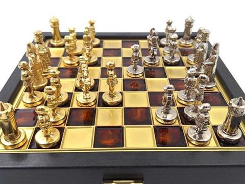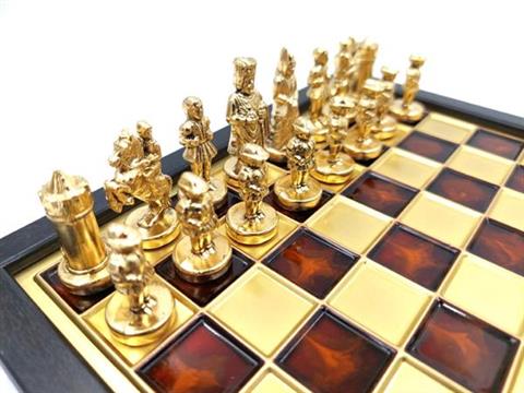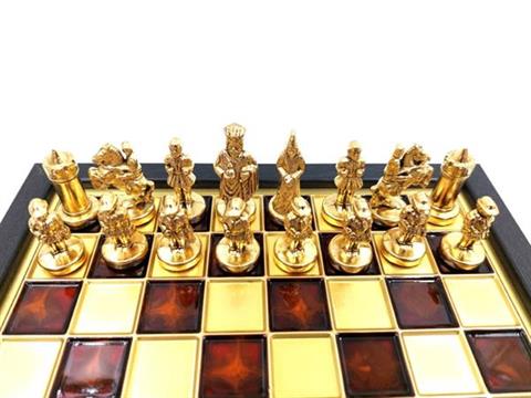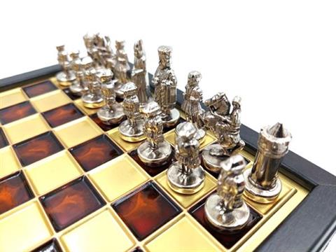 Exclusive Macedonian Dynasty Metal Chess – Chessboard 20x20cm – SK1. Exclusive chess inspired by the Macedonian Dynasty – the eighth imperial dynasty ruling in the Byzantine Empire. During the Macedonian Dynasty, Byzantium regained its power after the defeats inflicted by the Arab invasions. It was then that its military power and prestige in the international arena increased. 20 x 20 cm chessboard is made of high quality brass, which gives it a unique look and durability. Great design and attention to detail make this chessboard a true work of art. Entire chess set is neatly packaged in an elegant wooden molded box, which protects the chess pieces from damage and provides them with adequate storage space. The SK1 chess set will not only enable you to spend time with your loved ones – it will also be a great decorative piece that will look great in your home, office or library. This is a beautiful, elegant gift for chess lovers, historians and people who appreciate the highest quality workmanship. We assure you that this chess set will provide hours of entertainment and will please both experienced players and novice enthusiasts of this royal game. Dimensions: Chessboard 20 x 20 cmKing height 3.5 cmWeight of the set: 1.5 kg Chess pieces: Metal chess piecesFigures and pawns made of zinc alloy.Colors: gold / silver Chessboard: Made of brassColors: burgundy/goldenHand-paintedChess pieces are packaged in a beautiful, luxurious wooden boxInside a carefully crafted molding box for stacking and safe storage of the figures