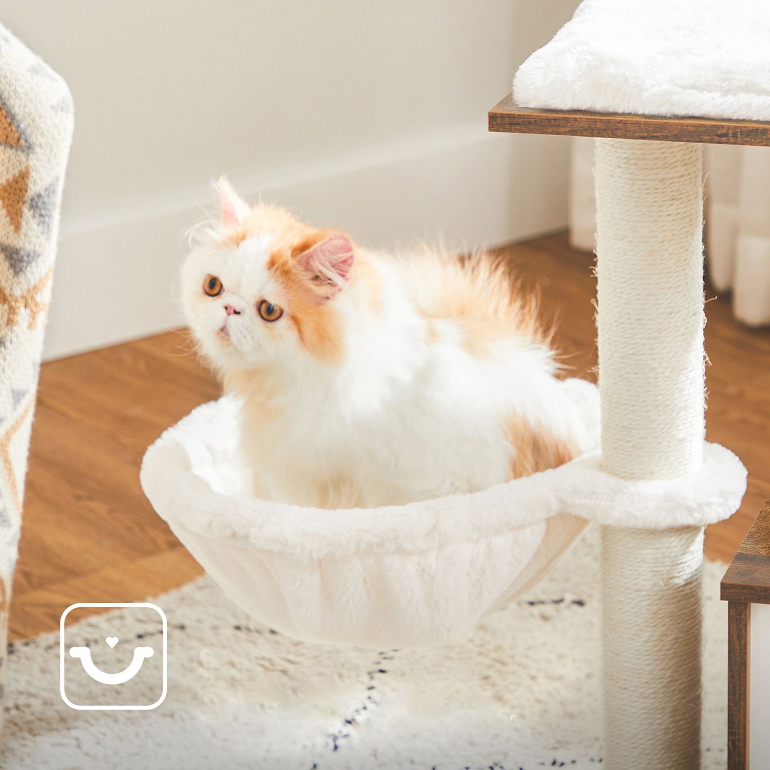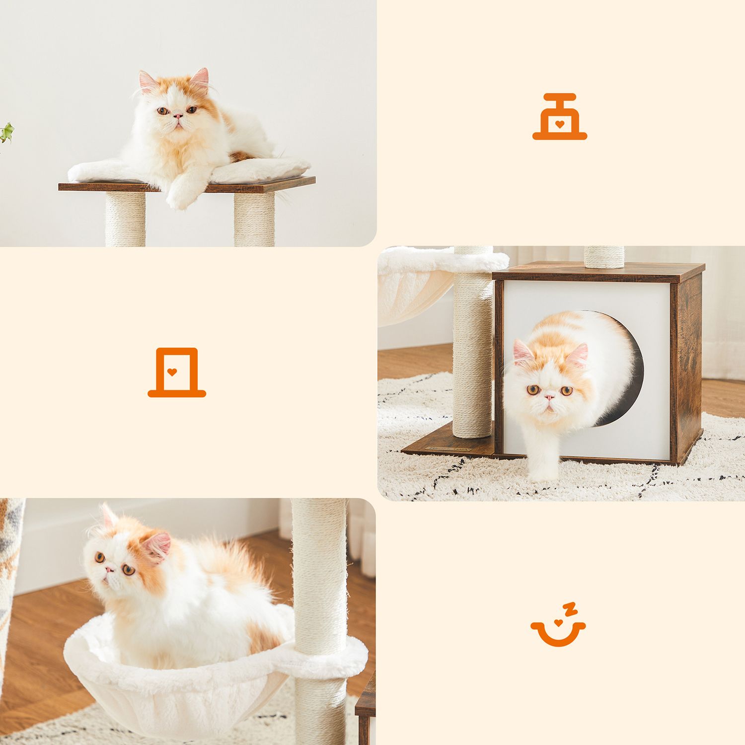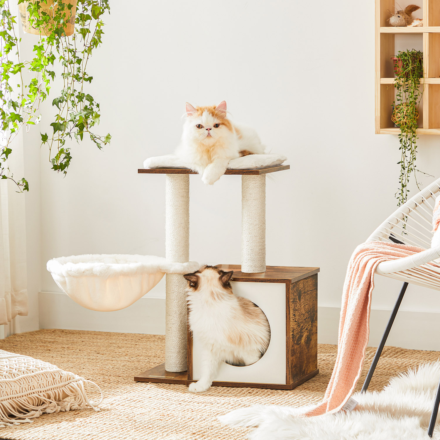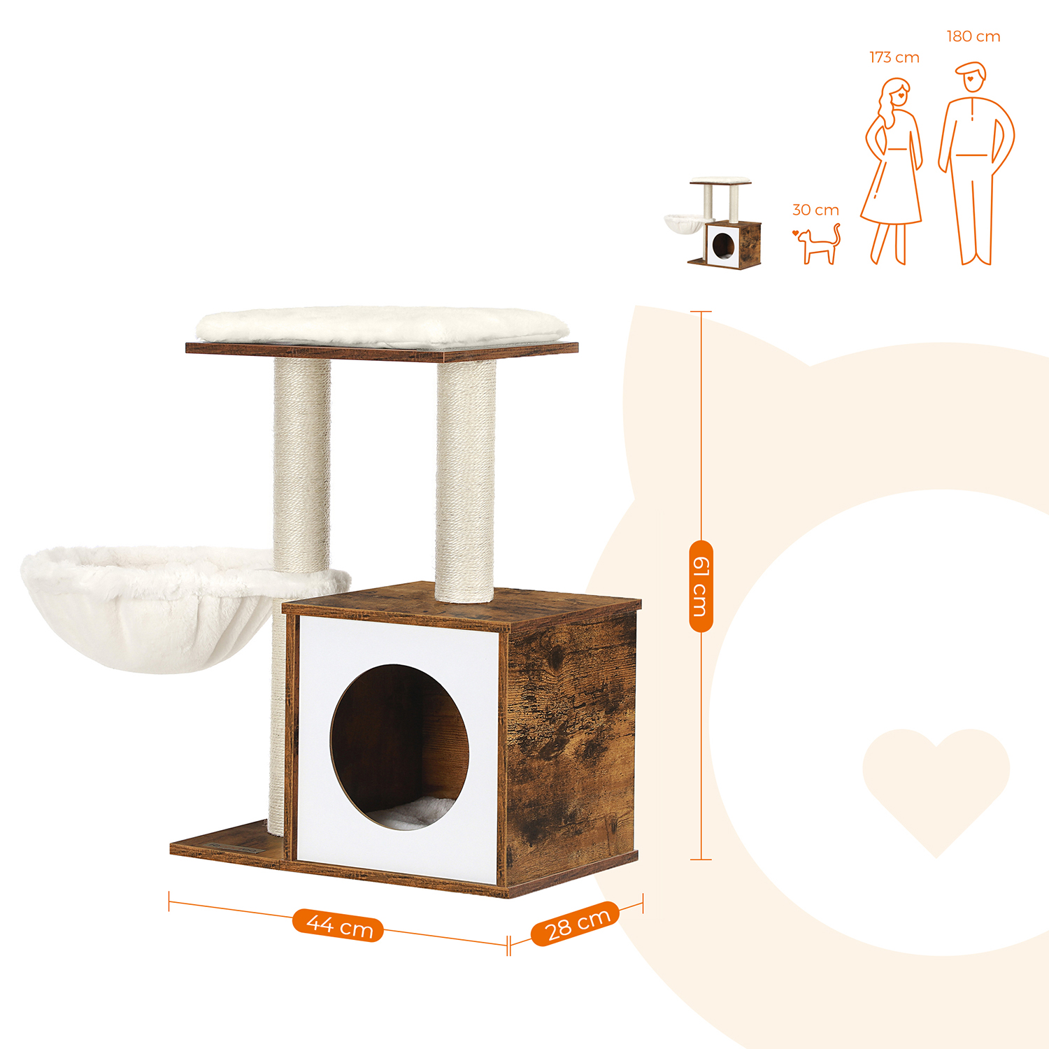 In the creative workshops of FEANDREA, two cute kittens jump around, personally inspecting all the scratching posts and giving their animal feedback. This allows the designers at FEANDREA to find out firsthand, or rather first paw, whether the products meet the demands of pampered whiskered friends. The highlights of this scratching post at a glance: – With its rustic surface, the scratching post fits in well with your home furnishings – 500 g/m² plush provides a fluffy and comfortable surface – 1 platform at the top for relaxing – 1 cozy cave for playing hide and seek – 1 fluffy lying area for napping – 2 sisal posts for sharpening claws – Removable cushions are easy to clean Product details:- Color: vintage brown – Material: chipboard, 500 g/m² plush, sisal – Size: 44 x 28 x 61 cm (L x W x H) – Weight: 5.2 kg Scope of delivery: – 1 x scratching post – 1 x anti-tip device – 1 x accessory pack – 1 x instructions