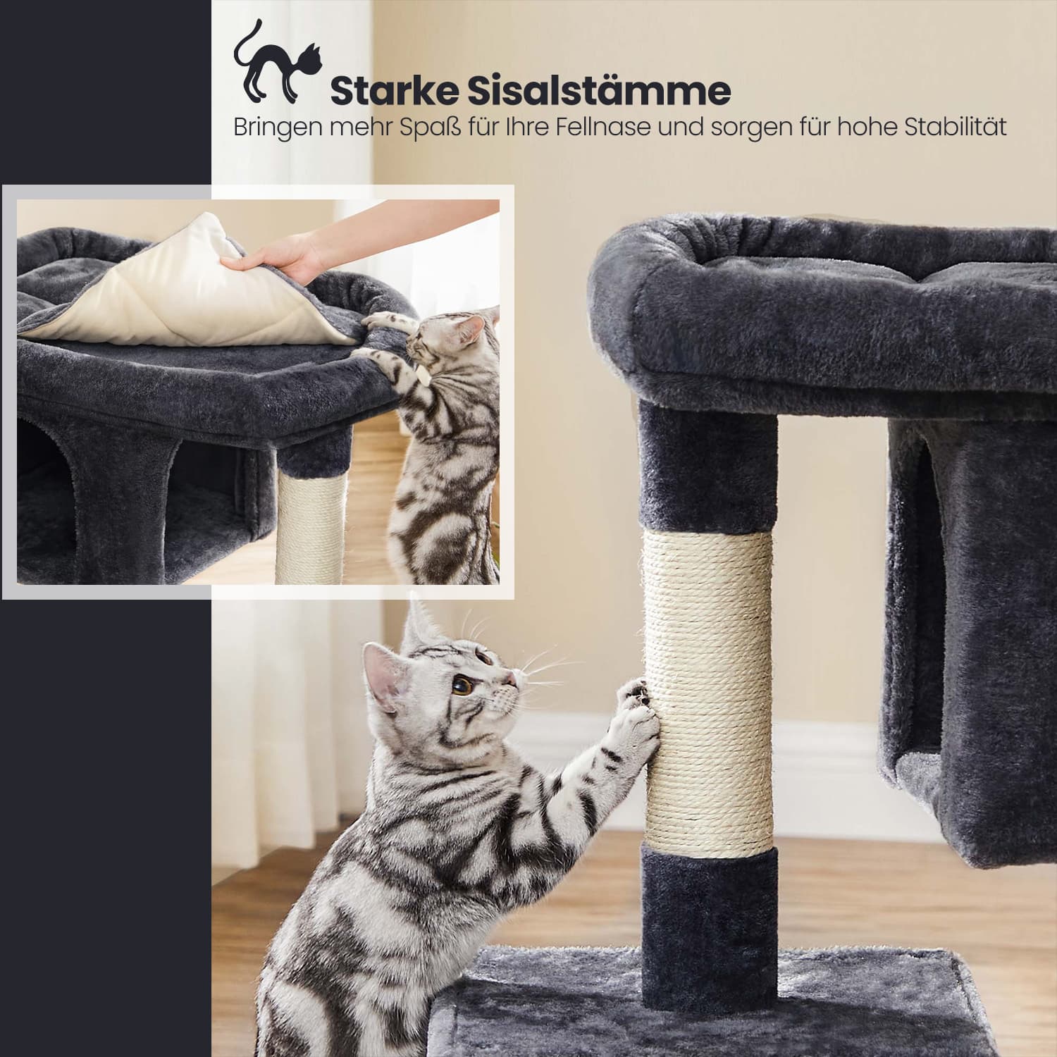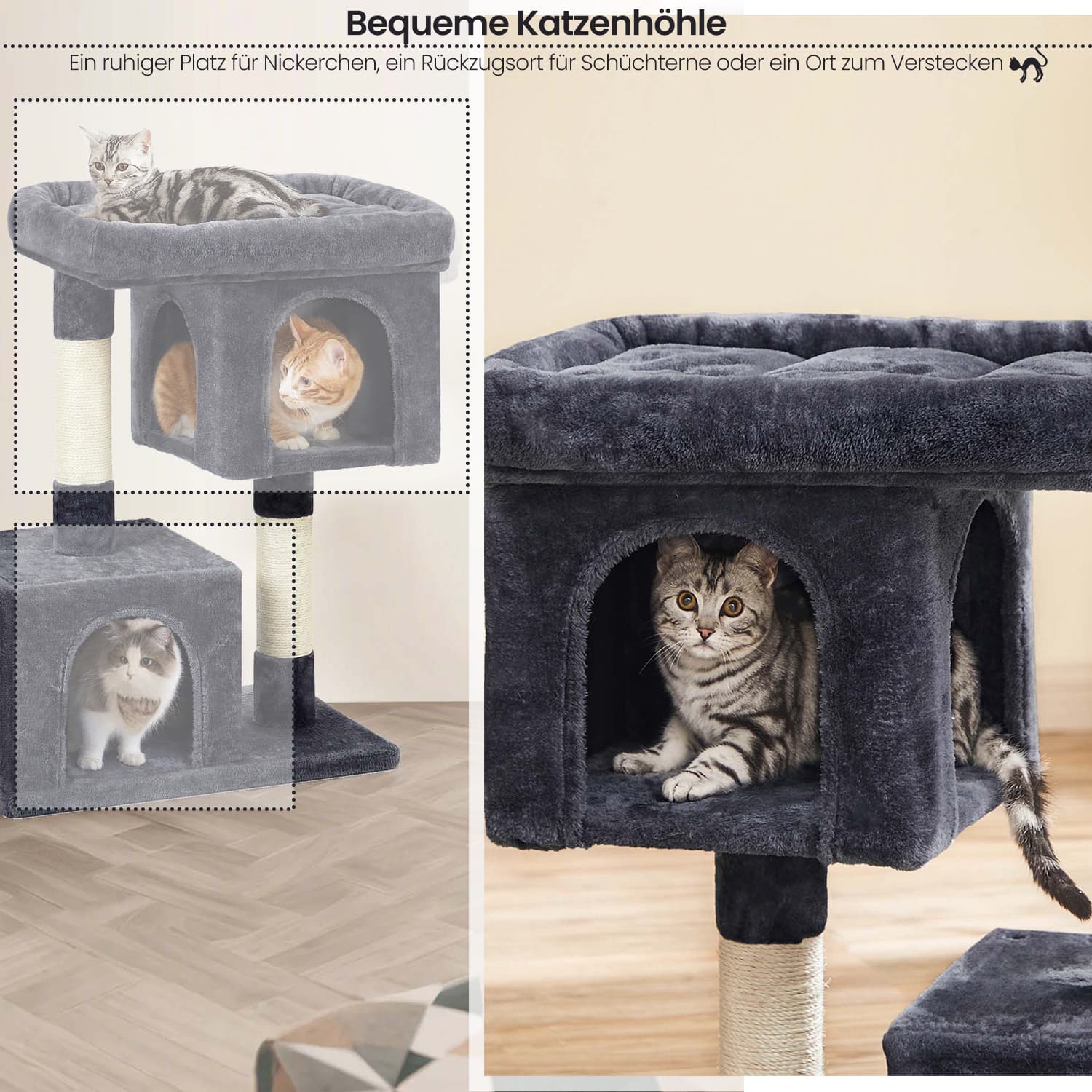 FEANDREA cat trees have all the features you need to help your cats thrive. RELAX – Enlarged top surface with raised edge provides a luxurious lounge experience.SCRATCHING – Strong poles covered with natural sisal rope allow cats to scratch their claws and stretch. NAPPING – Thanks to the two caves, your cats can finally have their own bed and behave peacefully. Apart from all the fun, the safety of your pets is guaranteed. The base is reinforced with slats to ensure stability; anti-tip fittings are also included so you can attach the scratching post to the wall. Whether you have kittens, large cats, or older cats, this cat tree is a wonderful home for your furry friends. Product details: – Color: Smoke gray – Material: CARB-certified particle board, plush, sisal – Product dimensions: 60 x 40 x 84 cm (W x D x H) – Weight: 10.9 kg Scope of delivery: – 1 x scratching post – 1 x instructions (DE, EN, FR, ES, IT) FEANDREA notes:- Place the scratching post on a flat surface in a corner of the room. – Avoid damp environments. – Children must not climb on or play with the scratching post. – We recommend securing this tower to the wall using the anti-tip devices provided.