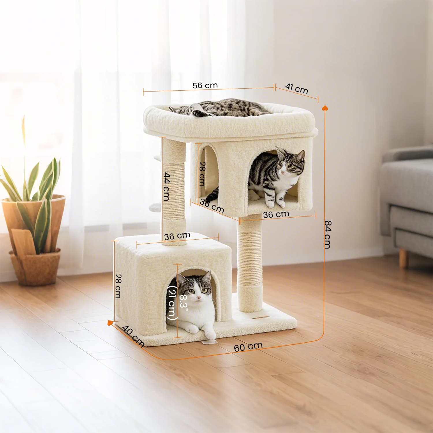 FEANDREA cat trees have all the features you need to help your cats thrive. RELAX – Enlarged top surface with raised edge provides a luxurious lounge experience.SCRATCHING – Strong poles covered with natural sisal rope allow cats to scratch their claws and stretch. NAPPING – Thanks to the two caves, your cats can finally have their own bed and behave peacefully. Apart from all the fun, the safety of your pets is guaranteed. The base is reinforced with slats to ensure stability; anti-tip fittings are also included so you can attach the scratching post to the wall. Whether you have kittens, large cats, or older cats, this cat tree is a wonderful home for your furry friends. Product details:- Color: Beige – Material: CARB-certified chipboard, plush, sisal – Product dimensions: 60 x 40 x 84 cm (W x D x H) – Weight: 10.9 kg Scope of delivery: – 1 x scratching post – 1 x instructions (DE, EN, FR, ES, IT) FEANDREA Notes:- Place the scratching post on a flat surface in a corner of the room. – Avoid damp environments. – Children must not climb on or play with the scratching post. – We recommend securing this tower to the wall using the anti-tip devices provided.