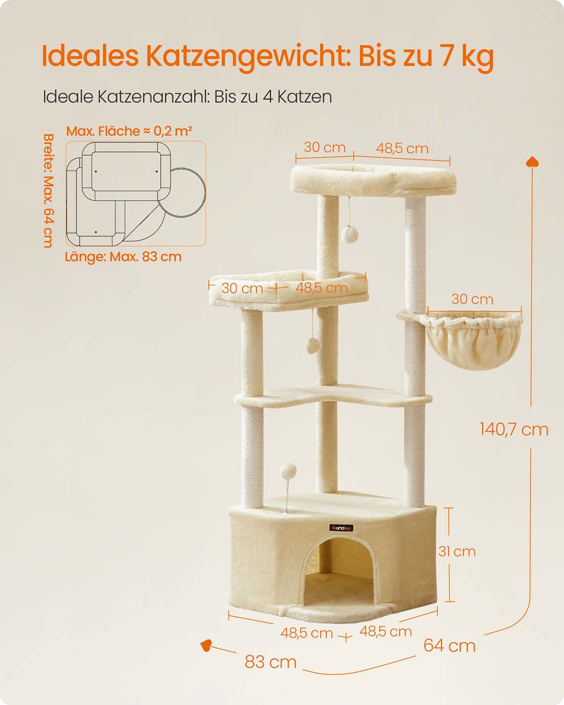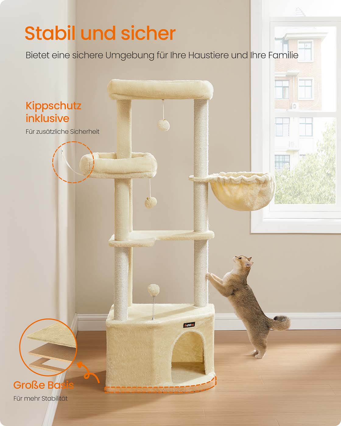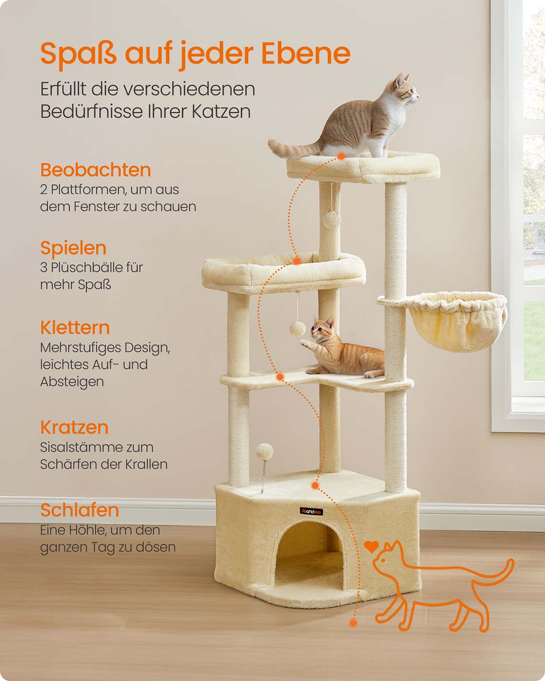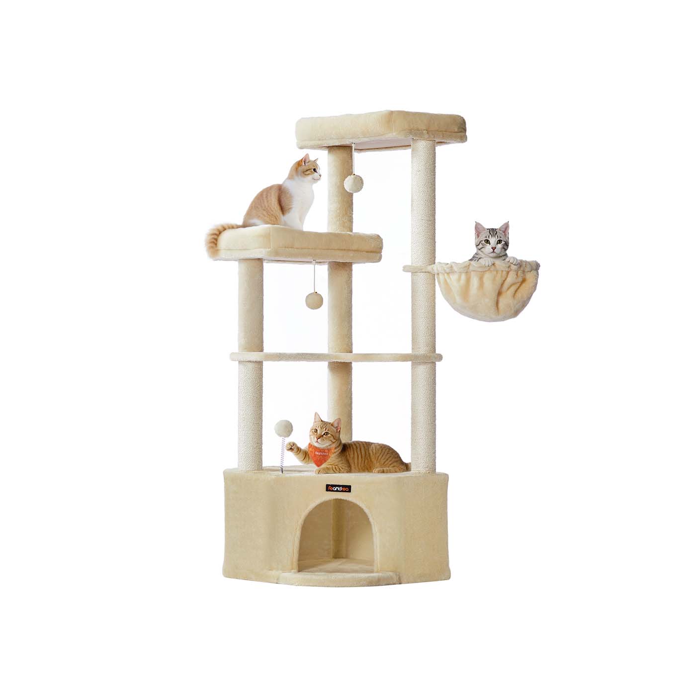 Feandrea scratching post, cat tree, 48.5 x 48.5 x 140.7 cm, cat scratching post with large cozy cave, large platforms, plush balls, reclining hollow, dark gray PCT009G02