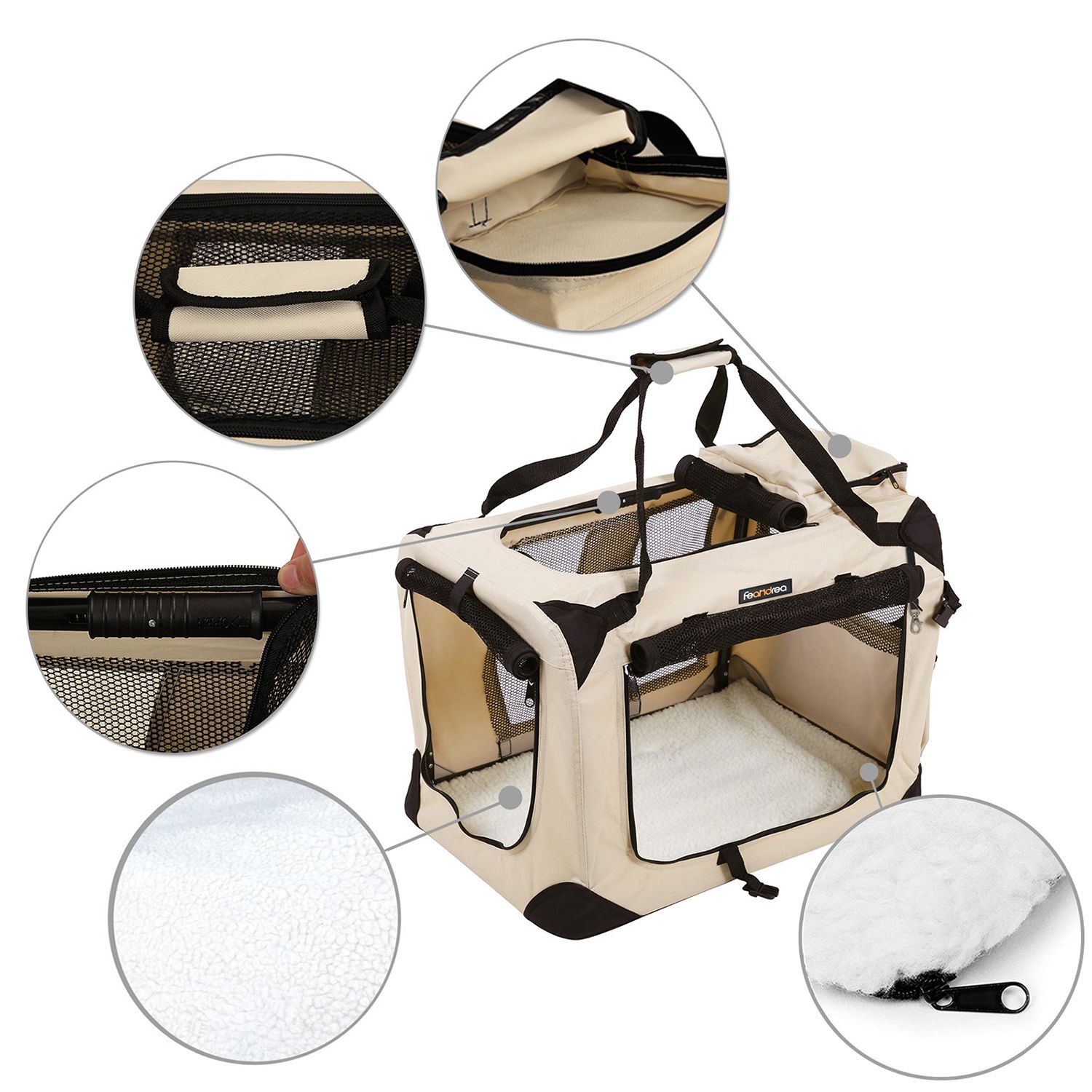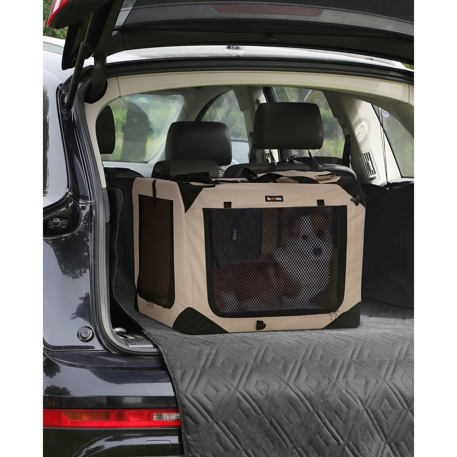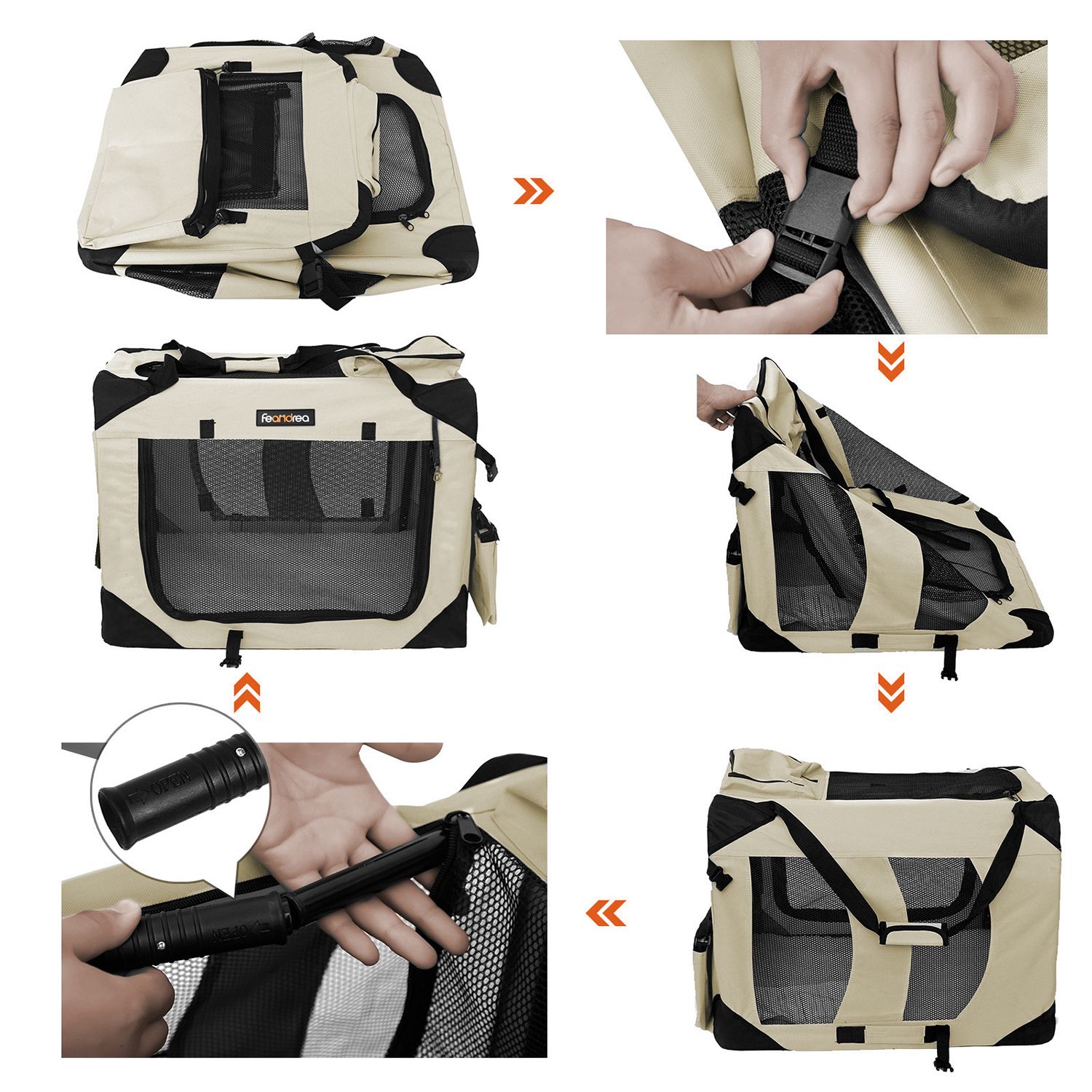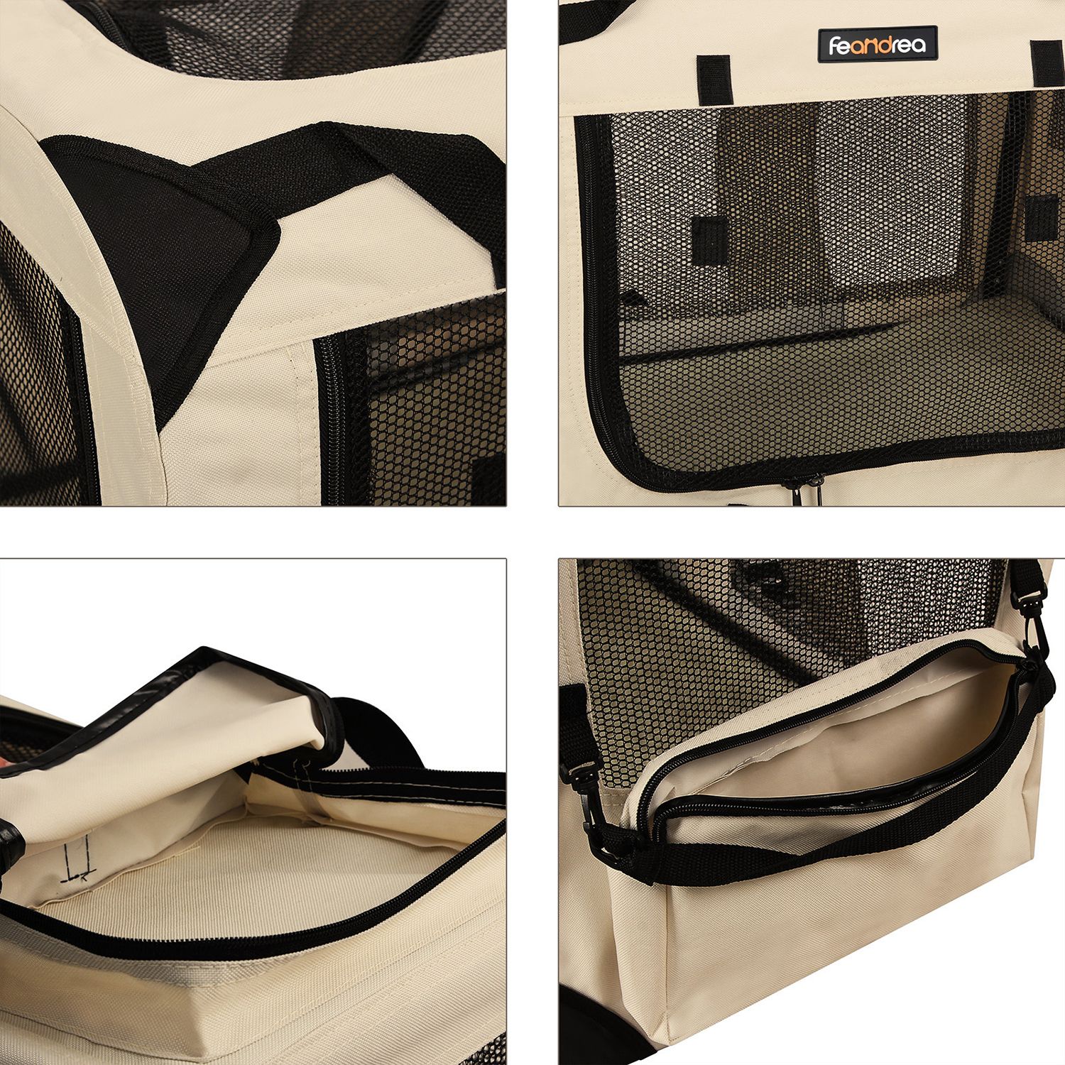Wherever you go: Are you taking the train from Munich to Berlin to visit family or friends? Or do you like to go to the seaside on vacation? Your dog or cat would surely like to come along, right? Simply place your pet in this transport box from FEANDREA, grab the handles, and you’re ready to go! All the advantages of this practical dog carrier at a glance: Metal frame; ensures a stable structure Made of Oxford fabric; robust and durable With a fluffy mat inside that can be removed and with a water-repellent PVC coating on the bottom. 2 additional small zippered compartments for storing pet accessories. Can be assembled or disassembled in a few minutes. Can be easily folded up when not in use and stored in a corner to save space. Mesh window and spacious interior to make your pet feel right at home. Product details:Color: Beige Material: Metal frame, Oxford fabric, PVC coating, fleece Size: 81 x 58 x 58 cm (L x W x H)Folded size: 81 x 58 x 8 cm (L x W x H) Weight: 4.1 kg Recommended for dogs weighing between 16 and 23 kg Scope of delivery: 1 x dog crate FEANDREA Notes: Tip for choosing the right dog crate: Please let your dog stand upright and measure its length from the base of its tail to its nose; have your dog sit upright and measure its height from the top of its head to the floor. Then add 10 cm to the measured length and height to select the right dimensions for your dog. Pets may only be in the dog crate without a collar or leash. Please measure your pet before ordering this product to ensure that it fits in this dog crate.