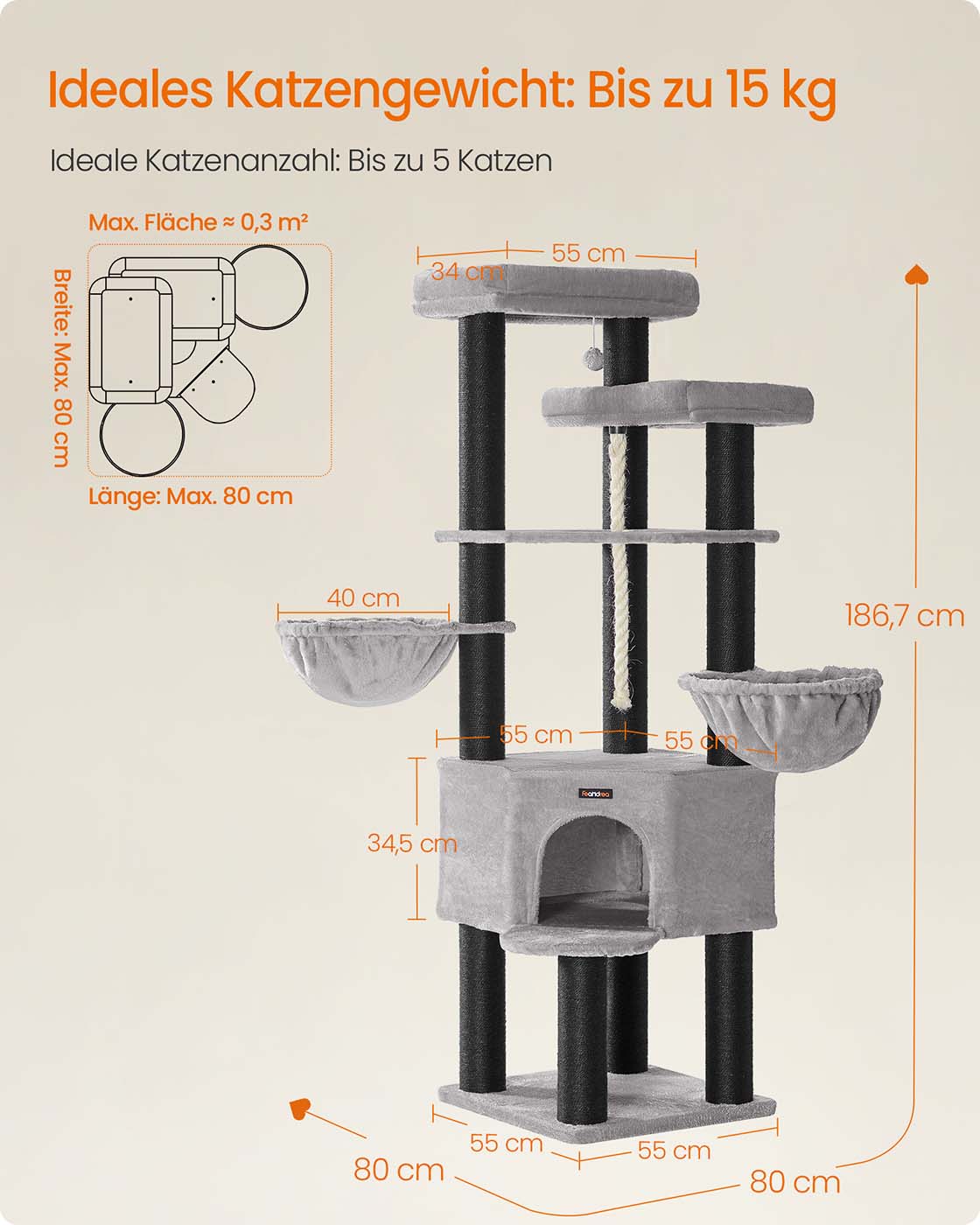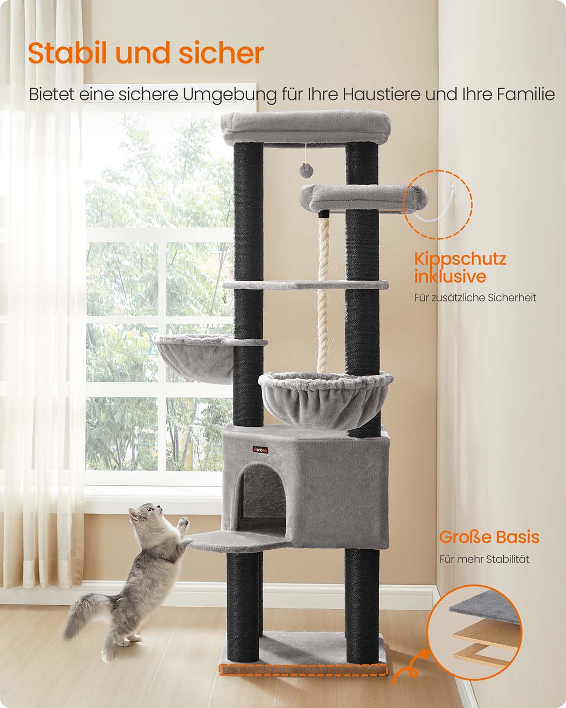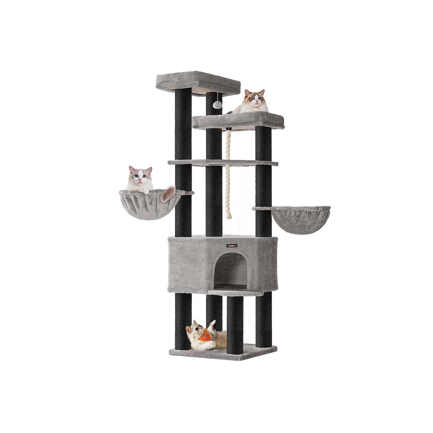 Feandrea Large Scratching Post, Multi-Level Cat Tree, XXL, 55 x 55 x 186.7 cm, 11 cm thick sisal posts, for large cats such as Maine Coons, cat scratching post, dove gray-cream white PCT008G01