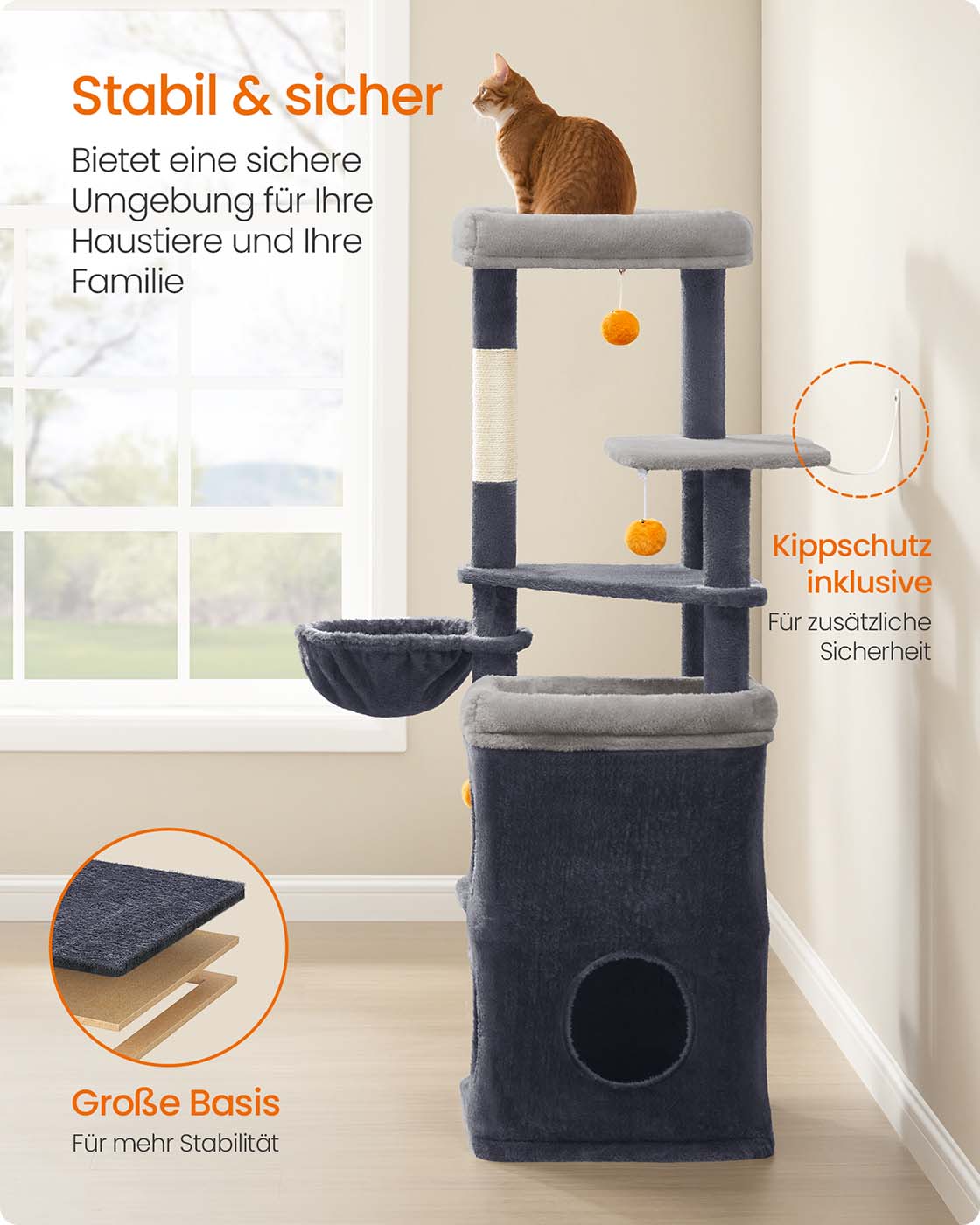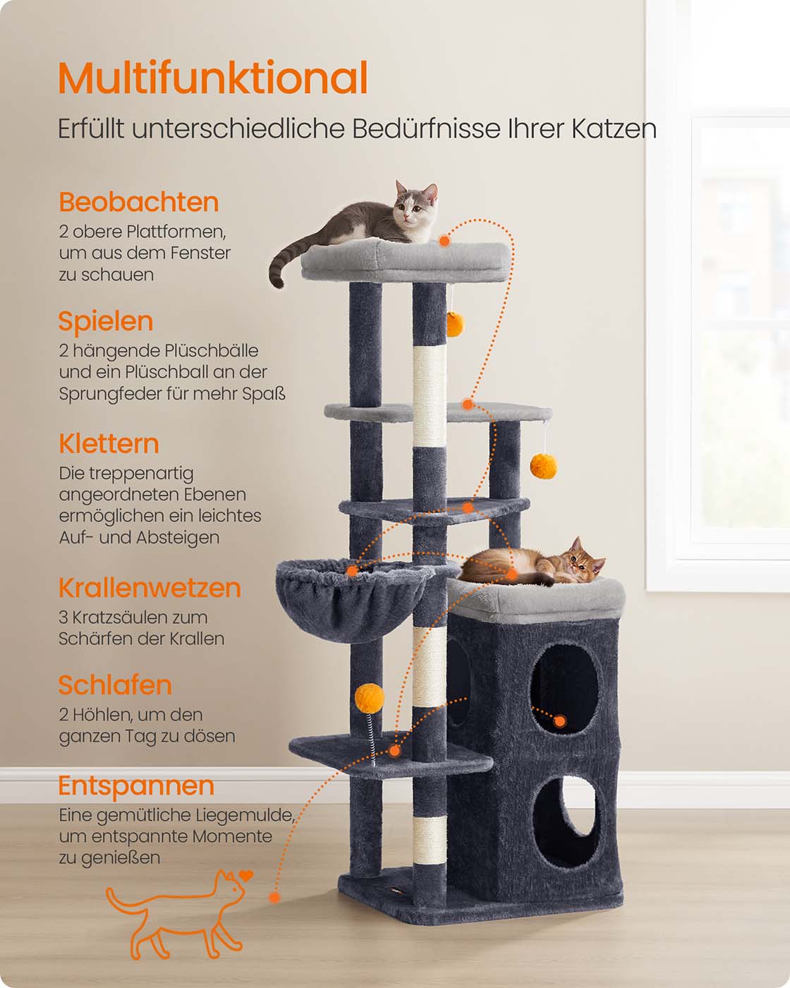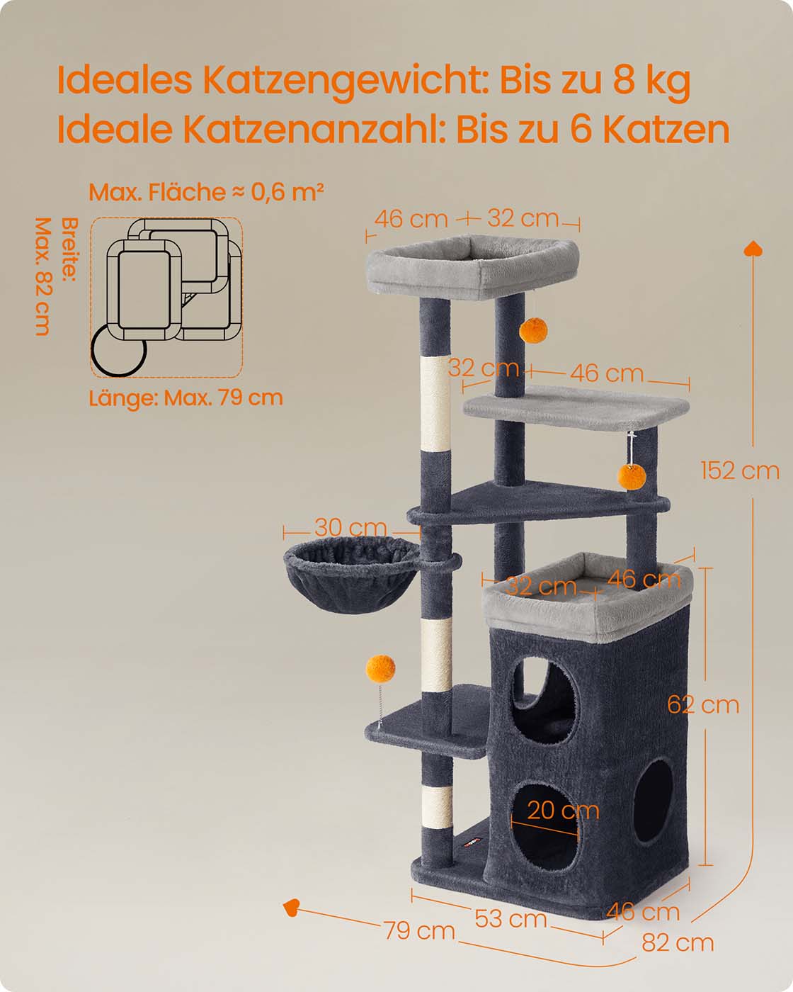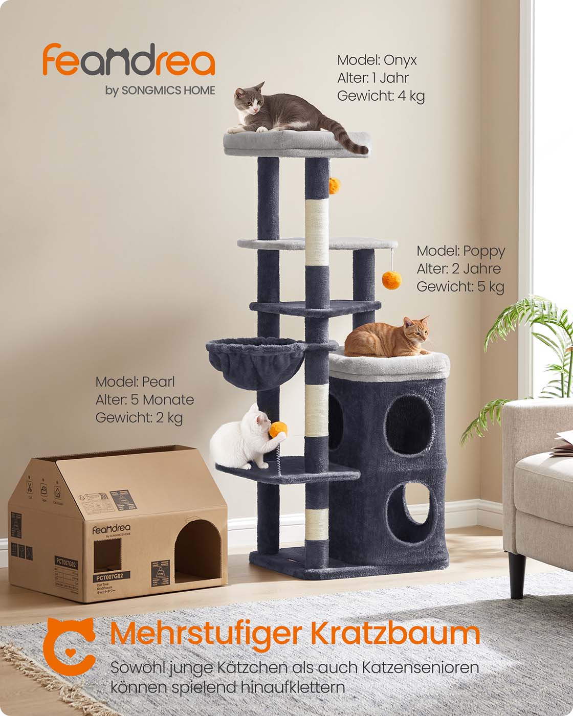Feandrea scratching post, 152 cm high, multi-level cat tree with 2 large caves, 1 resting hollow, 3 scratching posts, 3 platforms, cat scratching post, dove gray PCT007G01