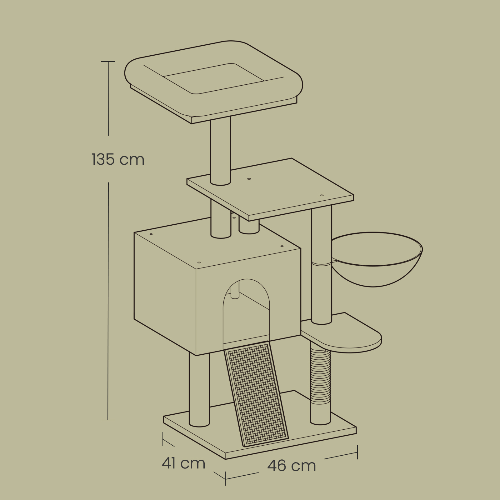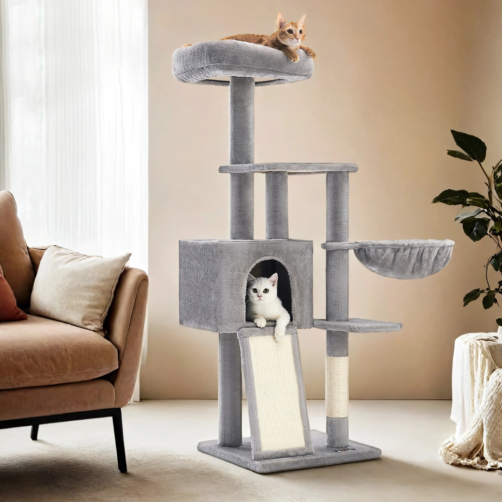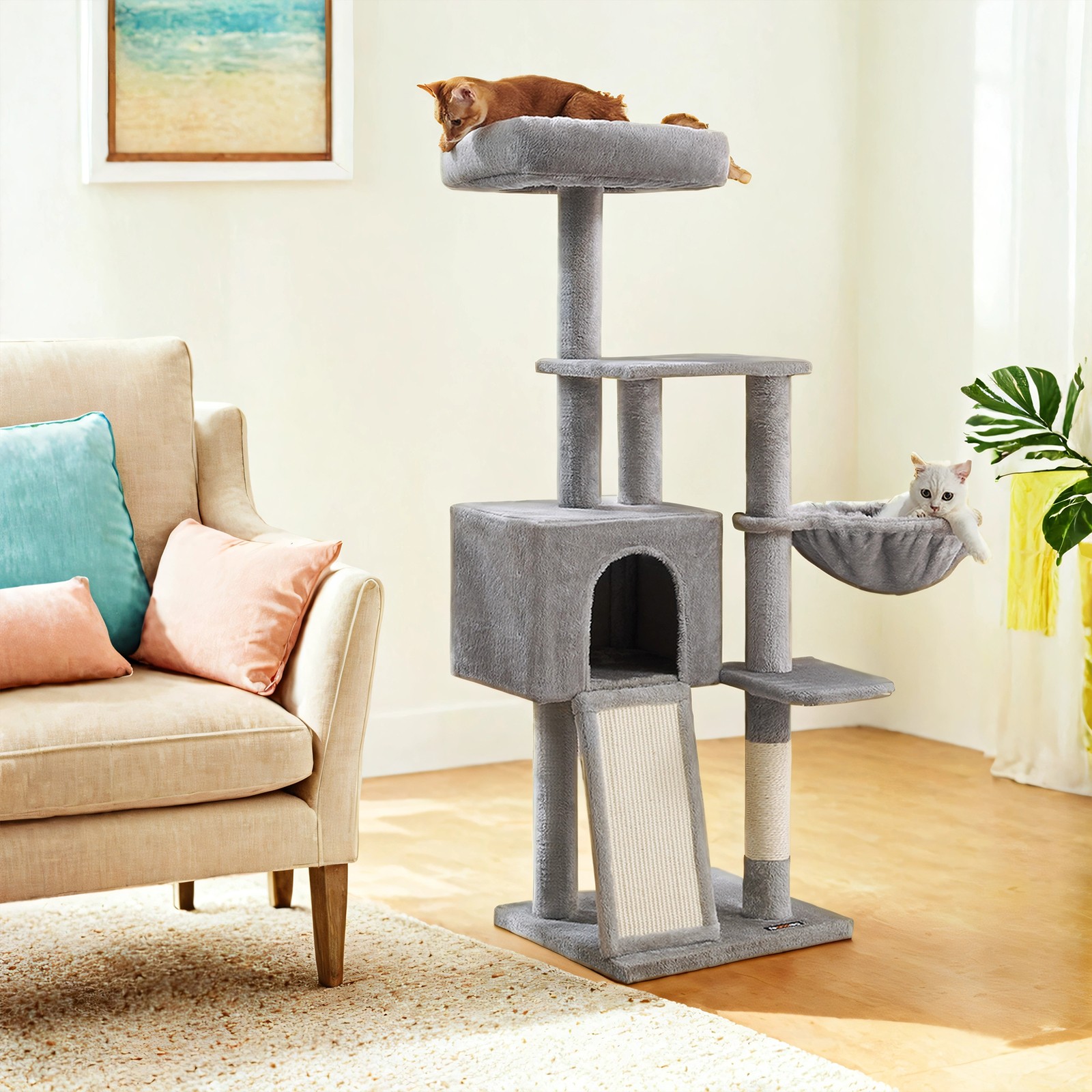 In the FEANDREA creative workshop, two little kittens hop around, personally inspecting our scratching posts and providing animal feedback. This gives FEANDREA designers first-hand knowledge of which products meet the needs of our precious kittens. Why should you choose this multi-level scratching post? – Friendly for kittens and older cats: Both the multi-level design and the ramp make it easy to get on and off. – Soft and comfortable: The soft plush cover creates a relaxed atmosphere. – Versatile fun: 1 perch for watching birds, 1 cave for hiding, 1 basket for resting, and 1 pole and board for exercising. – Easy to clean: The upper perch has a removable cover for easy cleaning. – Easy assembly: With labeled parts, clear instructions, and an assembly tool, it can be quickly and easily assembled by one person. Product details: – Color: Light gray – Material: Chipboard, plush, sisal – Size: 46 x 41 x 135 cm (L x W x H) – Weight: 10.4 kg – Total static load capacity: 40 kg Scope of delivery: – 1 x scratching post for cats – 1 x anti-tip guard – Accessory pack – 1 x instructions FEANDREA Notes:- If the cat cave is scratched and damaged by poor paws, please repair or replace it before continuing to use it to avoid the risk of injury to your furry friend. – As cats like to jump and play, please attach the product to the wall using the anti-tip device provided to ensure safe use.