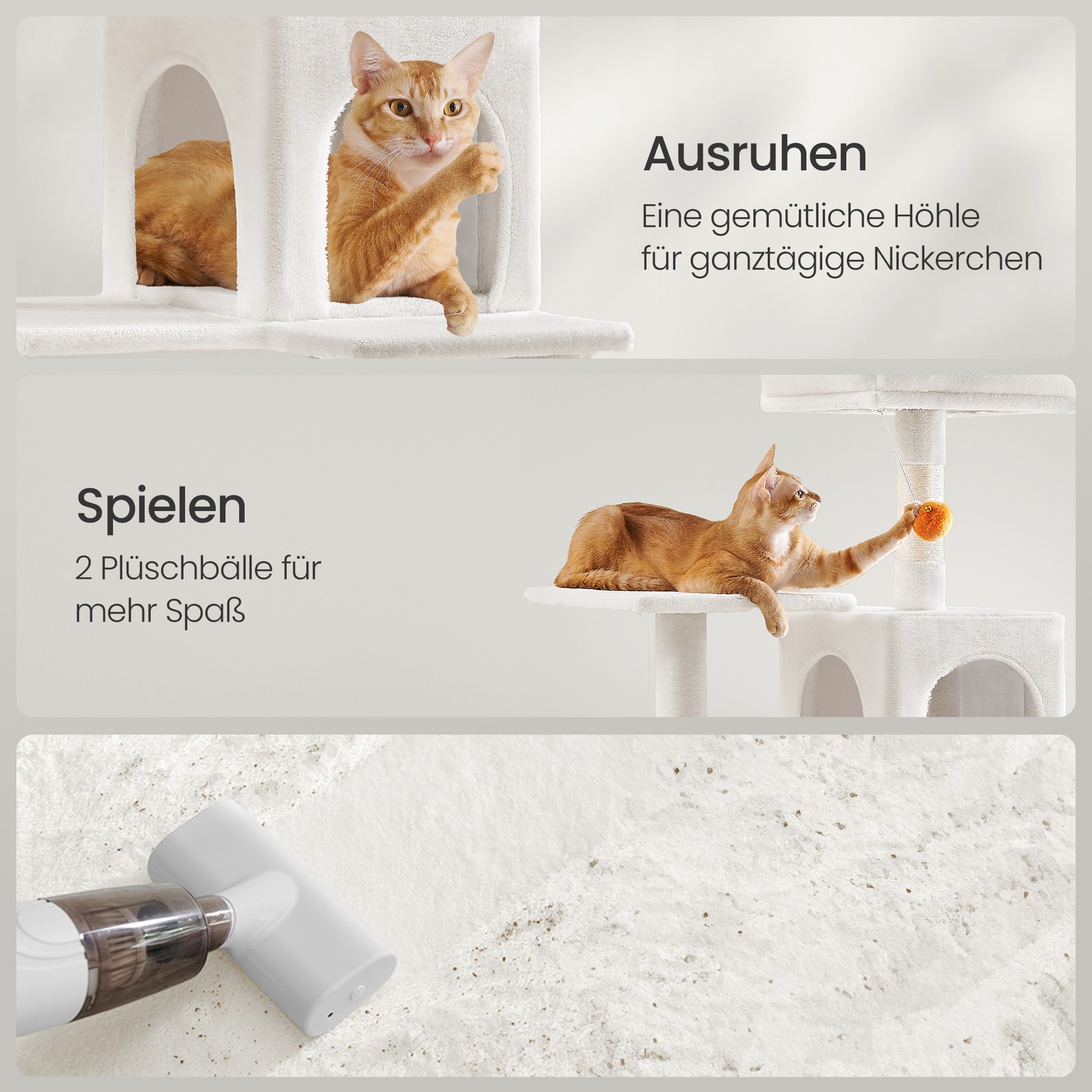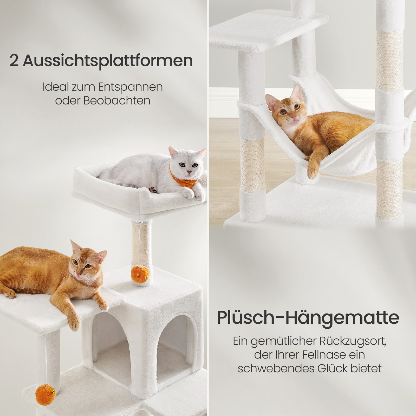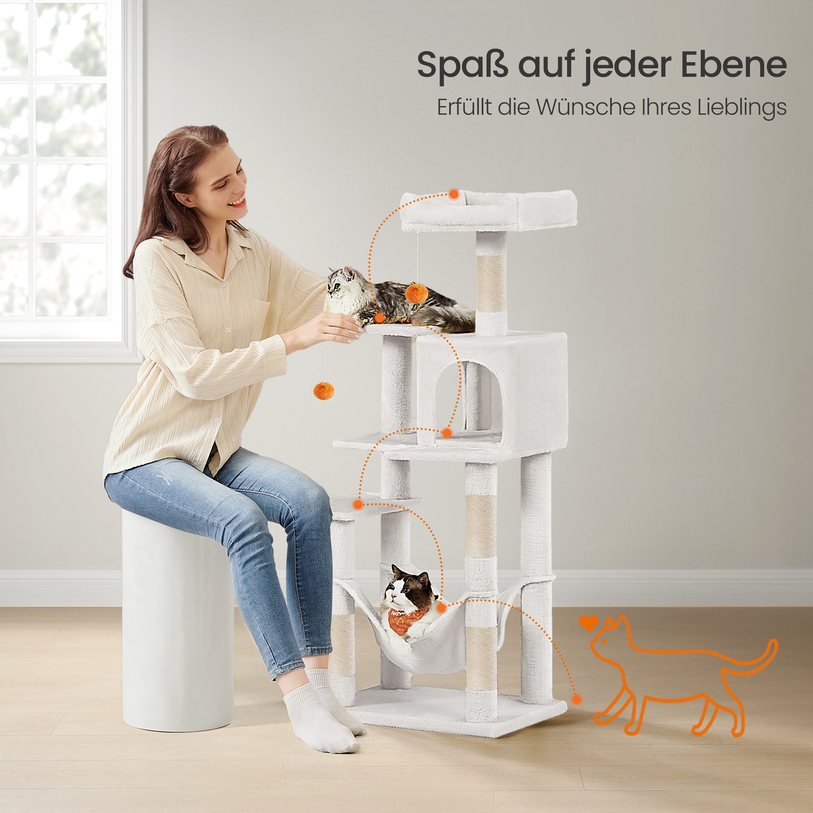 Scratching post, 143 cm high cat tree, cat scratching post, with plush balls, scratching posts, platforms, hammock, cave, beige