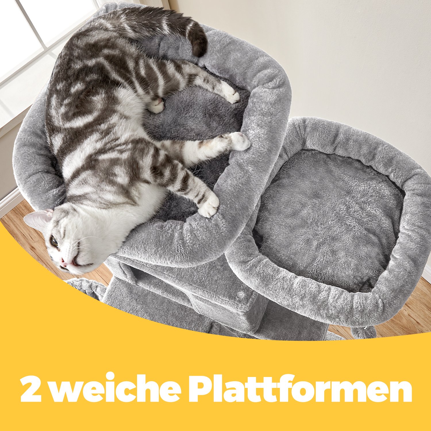 FEANDREA Large Scratching Post With a floor space of 60 x 50 cm and a height of 206 cm, you can save space while creating an amusement park for your cats, especially those who love heights. Sharpening claws, napping, relaxing, stretching, playing… Every cat has a favorite spot on our scratching post. And what about your cat? In FEANDREA’s creative workshops, two cute kittens jump around, personally inspecting all the scratching posts and giving their animal feedback. This allows FEANDREA’s designers to find out firsthand, or rather first paw, whether the products meet the demands of pampered whiskered friends.Your cat will have lots of fun with this scratching post: 206 cm high, perfect for cats who love heights 1 hammock and 1 reclining bed for relaxing 2 comfortable cozy caves for hiding Sisal posts and 1 scratching ramp for sharpening claws 2 viewing platforms for observing 2 fur balls for extra fun Product details:Color: Light gray Material: Chipboard, plush, sisal Size: 60 x 50 x 206 cm (L x W x H) Weight: 26.4 kg Scope of delivery: 1 x scratching post 1 x anti-tip device 1 x instructions (DE, EN, FR, ES, IT) FEANDREA notes:If the cat cave is damaged, please repair or replace it in good time to avoid injury from damaged parts. If your cats chew on the fur ball or rubber band, please remove the toy immediately and store it in a place that is inaccessible to your cat.