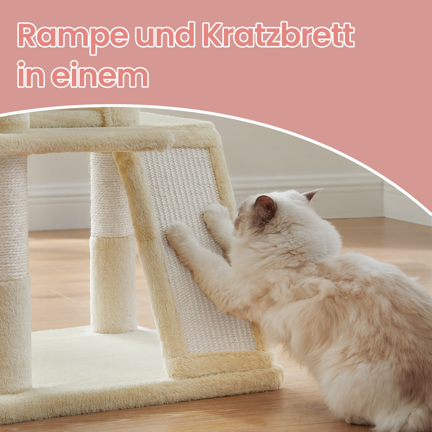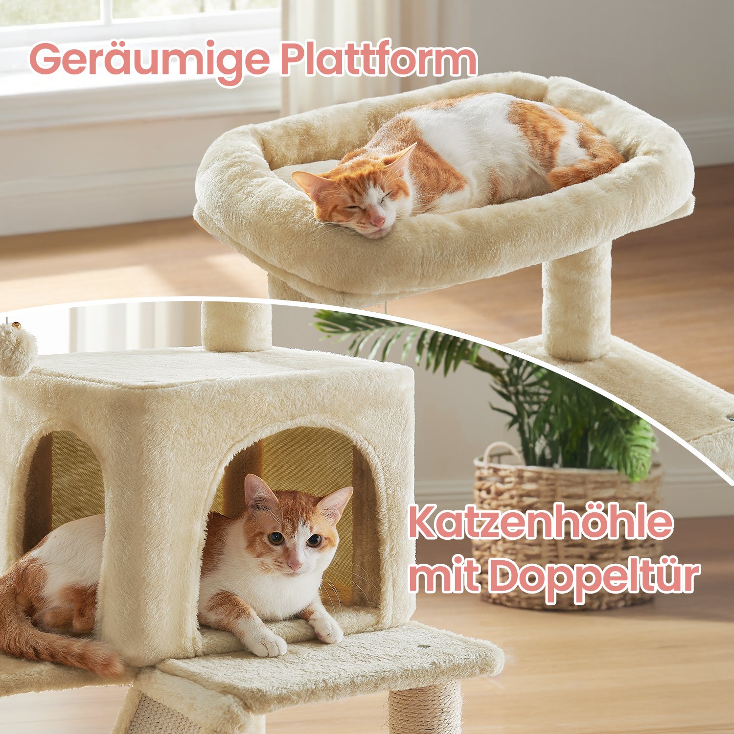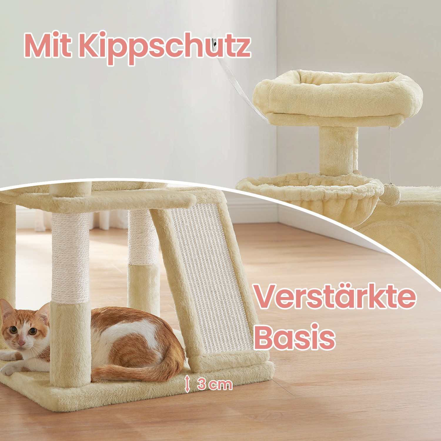 In FEANDREA’s creative workshops, two cute kittens jump around, personally inspecting all the scratching posts and giving their animal feedback. This allows FEANDREA’s designers to find out first-hand, or rather first-paw, whether the products meet the demands of pampered whiskered friends. A scratching post with numerous advantages The cat tower shown above has passed the kitty test. The cozy and pretty cuddle cave and the ramp with scratching board were particularly popular. But the sisal and plush-covered posts, the cozy platforms arranged in steps, and the lying hollow were also in high demand.Whether you have a young kitten or a senior cat, this 48 x 48 x 96 cm (L x W x H) cat tower offers a home for every feline friend. Which part of our scratching post will your cat like best? Do you think they won’t be able to stop sharpening their claws on the scratching board? Product details: – Color: Beige – Material: Chipboard, hardboard, plush, sisal – Size: 48 x 48 x 96 cm (L x W x H) – Weight: 11.6 kg Scope of delivery: – 1 x scratching post – 1 x instructions (DE, EN, FR, ES, IT)