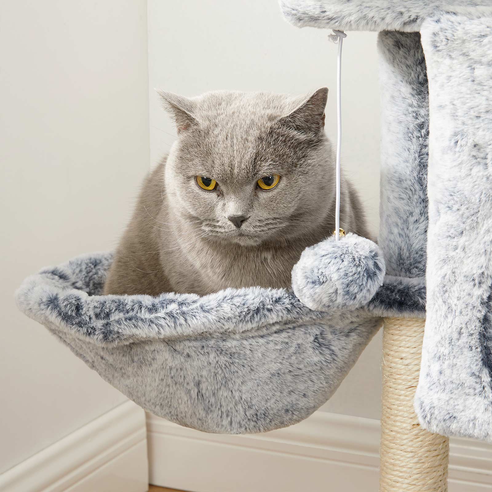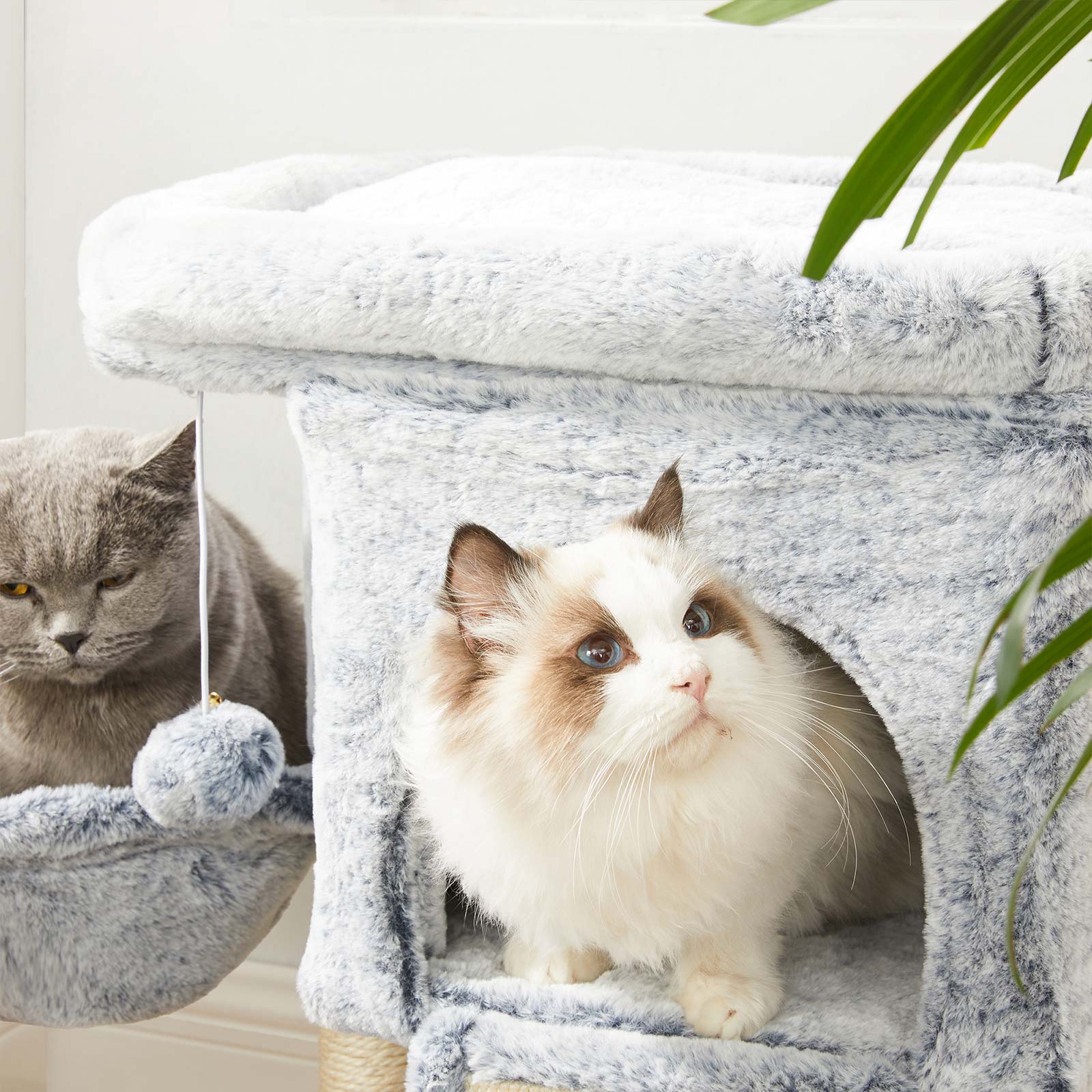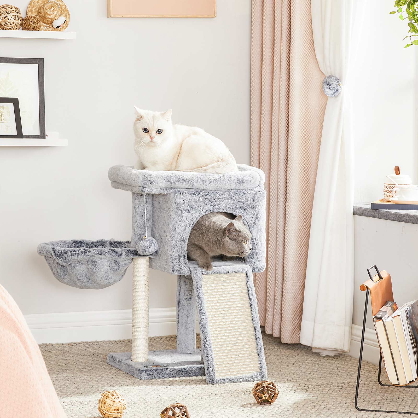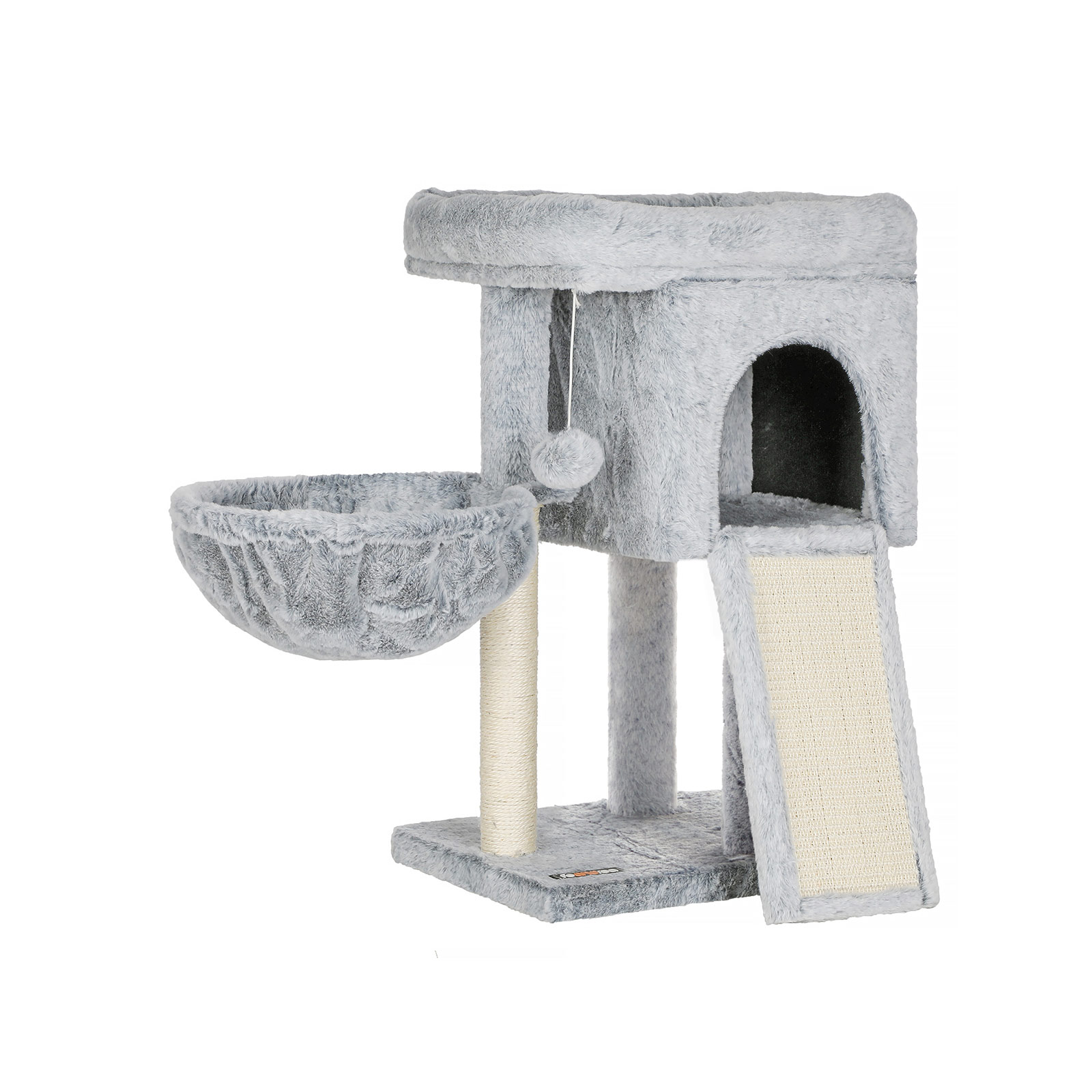 Two cute kittens are jumping around in FEANDREA’s creative workshops, personally inspecting all the scratching posts and giving their animal feedback. This allows FEANDREA’s designers to find out firsthand, or rather first paw, whether the products meet the standards of pampered whiskered friends.The highlights of this scratching post at a glance:Durable and soft plush cover1 XXL scratching board for sharpening claws1 comfortable cozy cave for hiding1 sturdy lying area for naps1 well-padded viewing platform for observing1 fur ball for extra funProduct details:Color: Light gray Material: Chipboard, plush, sisal Size: 43 x 33 x 66 cm (L x W x H) Weight: 6.5 kg Scope of delivery: 1 x scratching post 1 x anti-tip device 1 x accessory pack 1 x instructions (DE, EN, FR, ES, IT) FEANDREA notes:If your cats chew on the fur ball or rubber band, please remove the toy immediately and store it in a place that is inaccessible to your cat. If the cat cave is damaged, please repair or replace it in good time to avoid injury from damaged parts.Please attach this product to the wall using the included anti-tip device to ensure safe use.