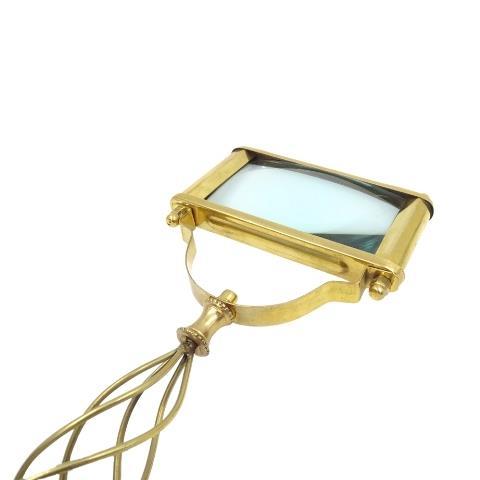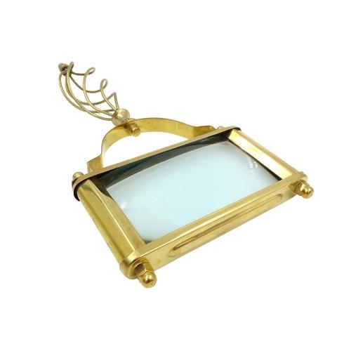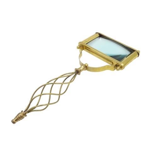 Large rectangular brass magnifying glass with wire handle – 70718 The magnifying glass will be perfect for reading maps, old documents or small inscriptions. It will be useful for work that requires precision, such as numismatics, philately or modeling. Thanks to its unique design, the magnifier can also be a decoration for a desk, bookcase or study. Product information: Magnification: magnifies 3.5 timesMaterial: brassDimensions: length 27.5cm x width 12cm