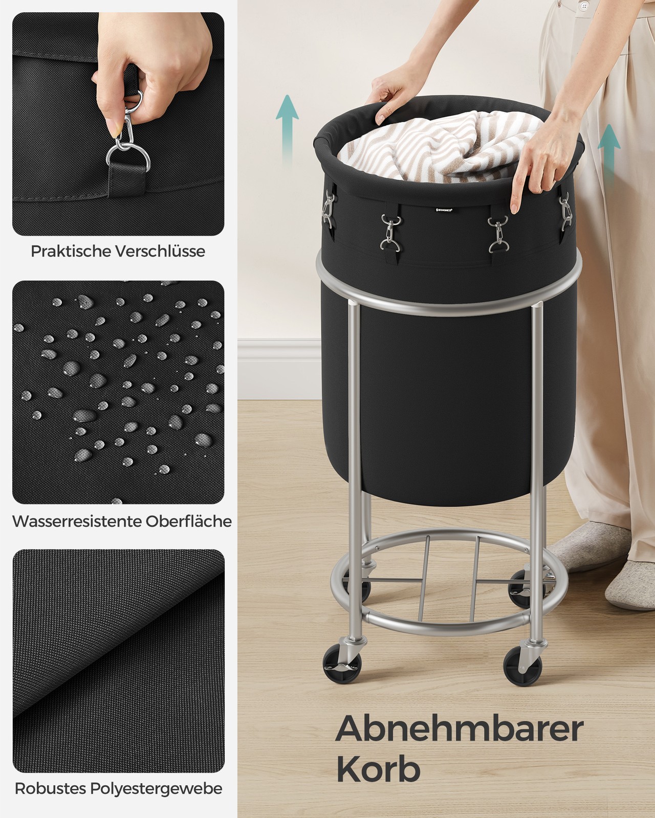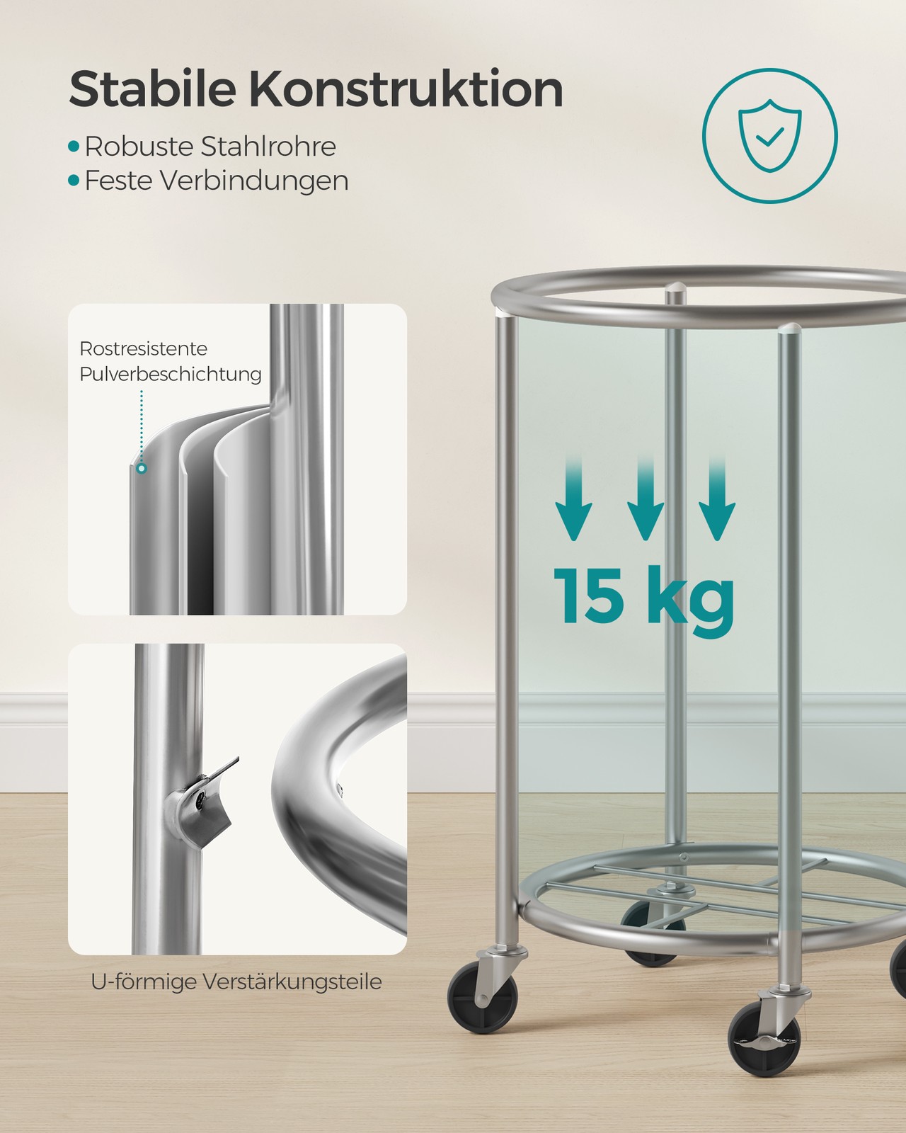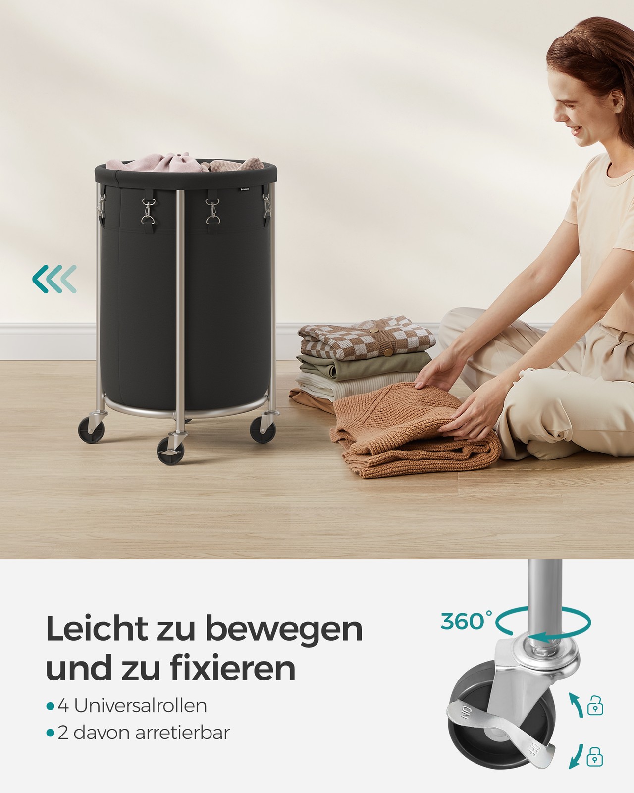 SONGMICS laundry basket with wheels, rolling laundry basket, round, steel frame and removable bag, 4 wheels and 2 brakes, cream and silver URLS006W01