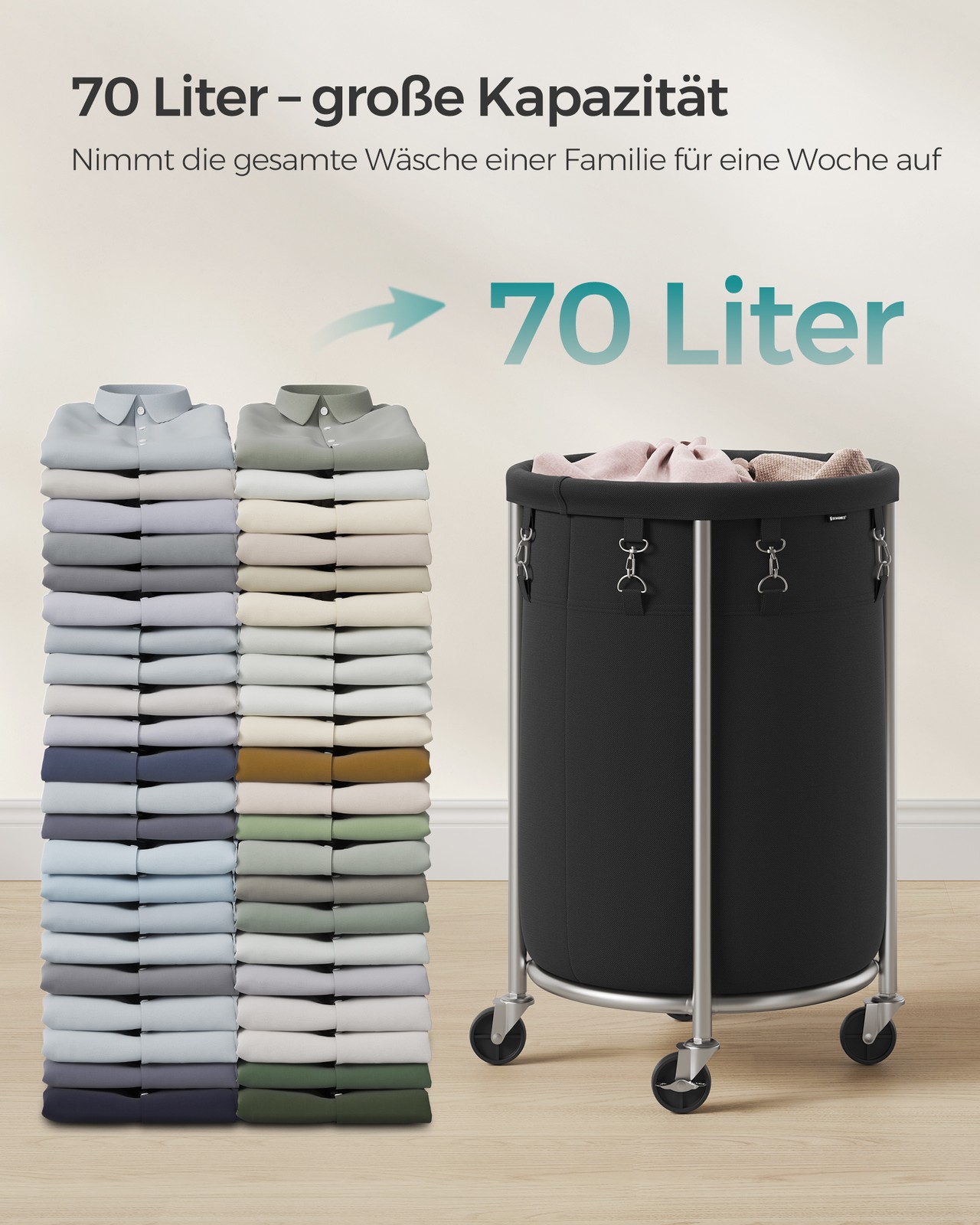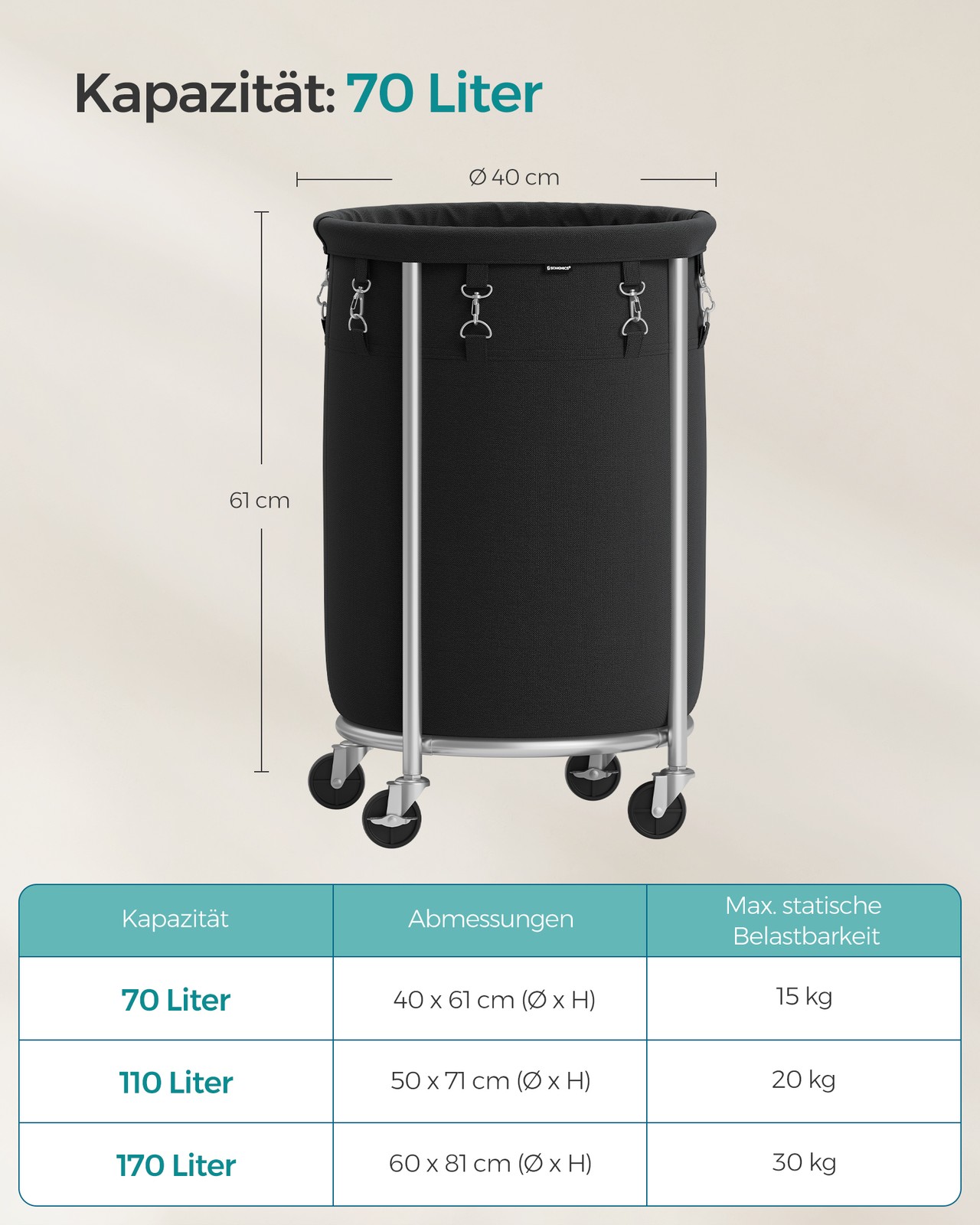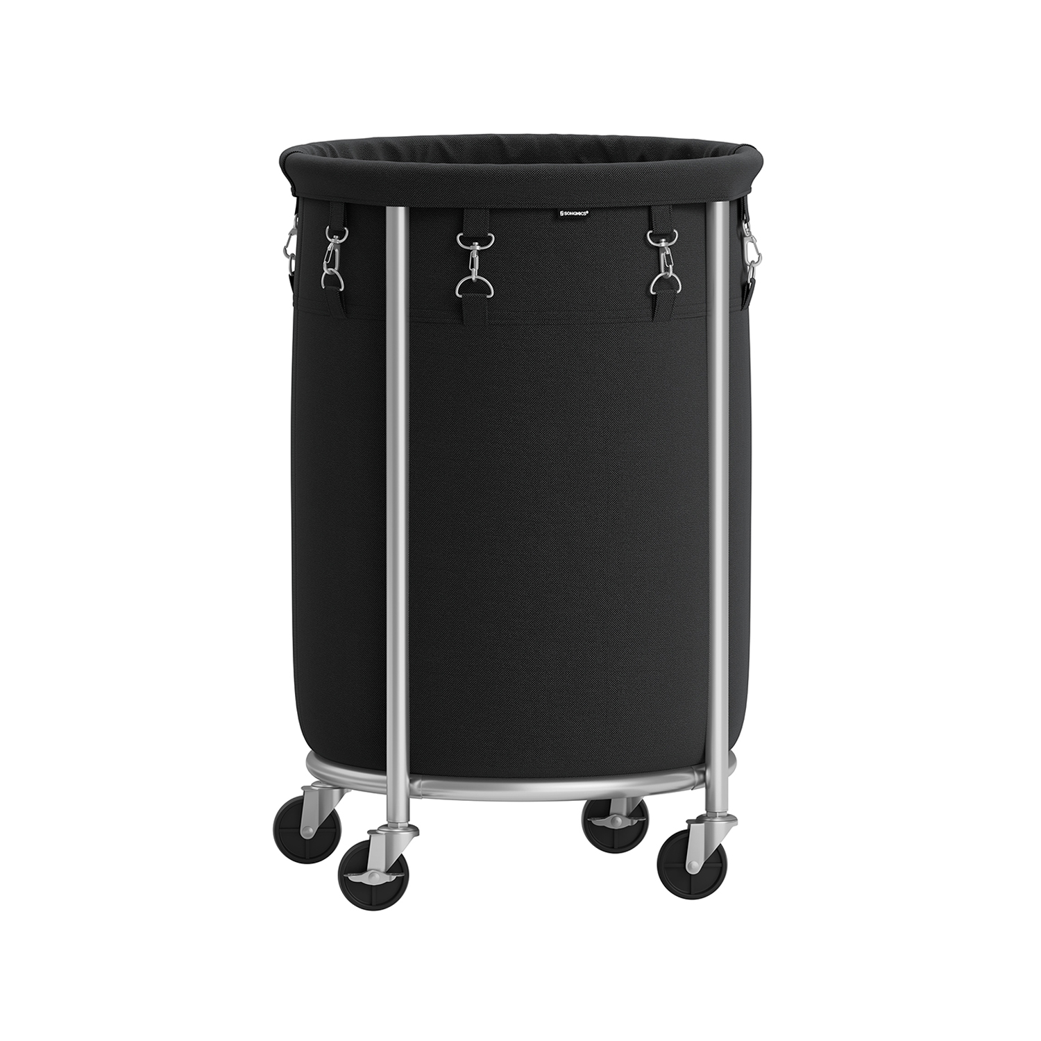 SONGMICS laundry basket with wheels, rolling laundry basket, round, steel frame and removable bag, 4 wheels and 2 brakes, cream and silver URLS006W01