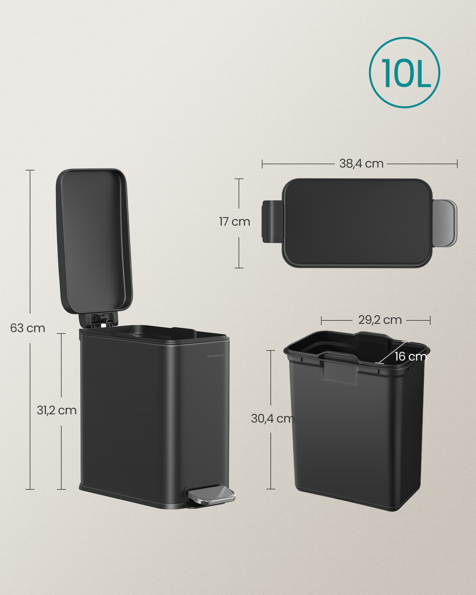 Size of inner bucket: 29.2 x 16 x 30.4 cm (L x W x H)