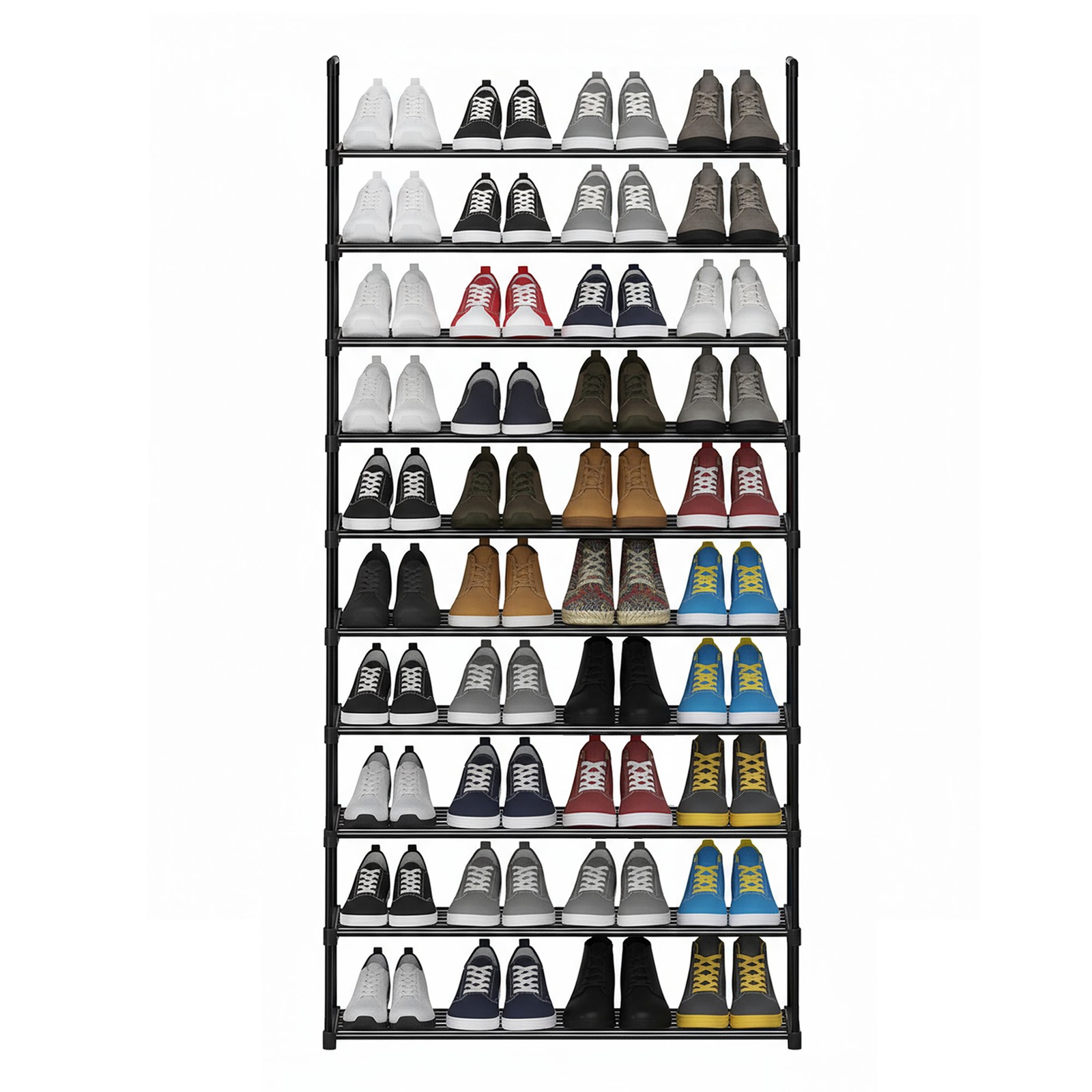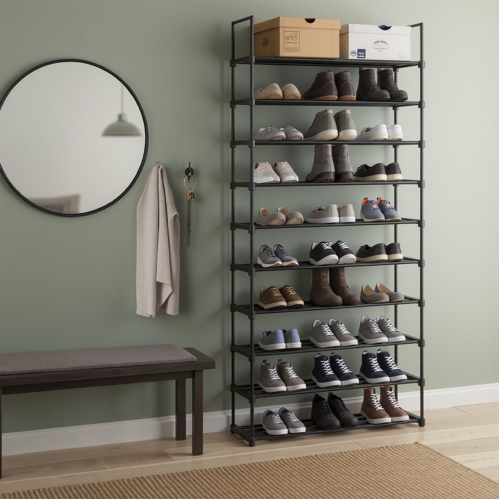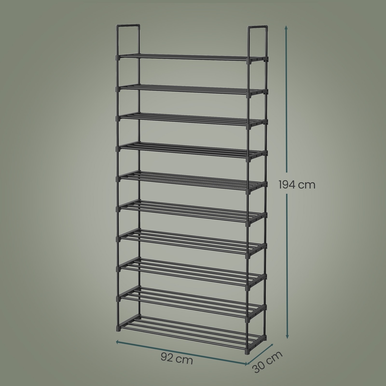 Adjustable – Clever design: This shoe rack is easy to assemble and adjust. You can leave out one or two shelves during assembly to make room for your new boots! Would you like to divide this rack into two small pieces of furniture? No problem! How many pairs of shoes fit on the rack? 40-50 pairs? No problem! Each shelf can hold 5 pairs of women’s shoes or 4 pairs of men’s shoes. This rack provides a suitable place for all your family members’ shoes. Product details: Color: Black Material: Metal tubes, plastic connectors Size: 92 x 30 x 194 cm (L x W x H) Distance between shelves: 20 cm Weight: 4.4 kg Max. static load capacity per shelf: 4 kg Max. static load capacity of the entire shelf: 40 kg Scope of delivery: 1 x shoe rack 1 x instructions (DE, EN, FR, ES, IT) SONGMICS notes:Please do not use the product outdoors. It is recommended to use the included anti-tip device to prevent injuries caused by tipping. The max. load capacity in the text refers to the maximum static weight.
