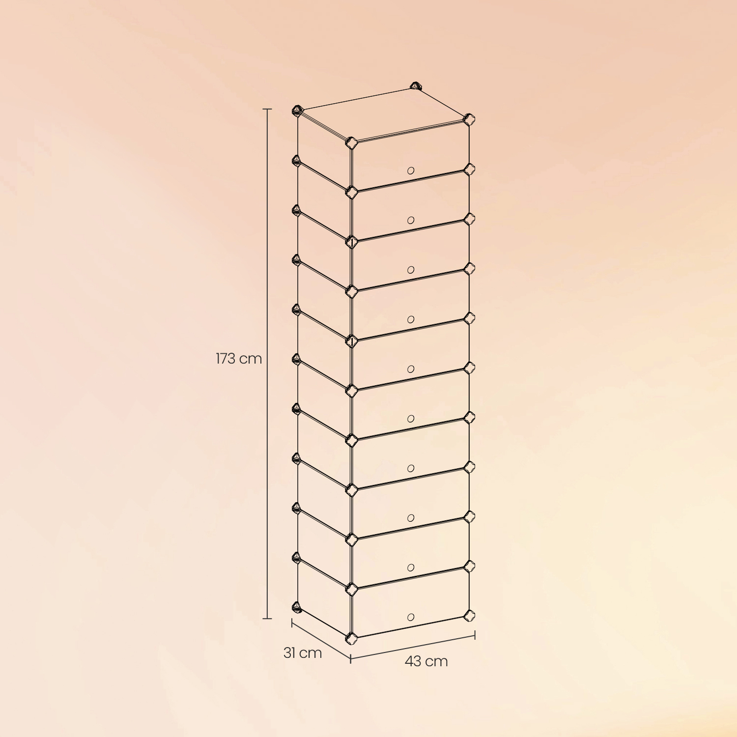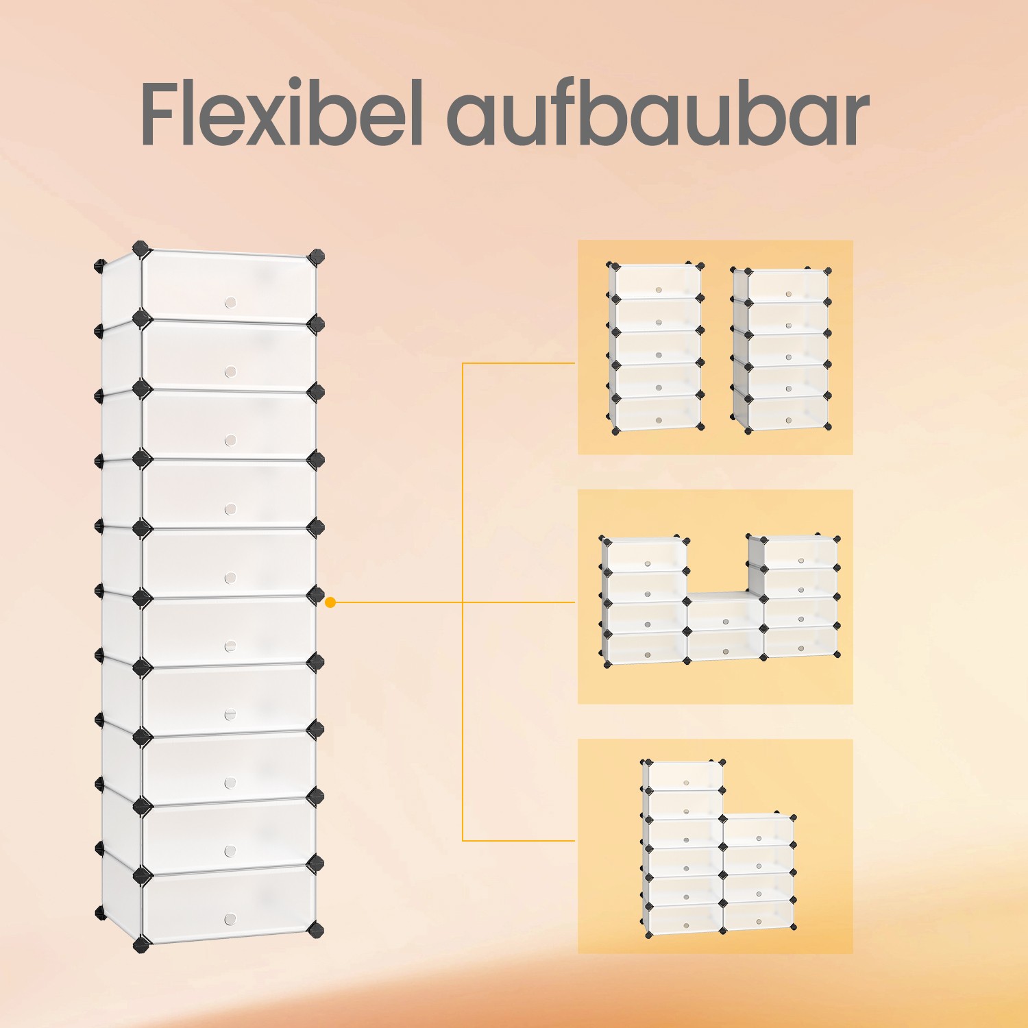 Men’s shoes, women’s shoes, children’s shoes, slippers, pumps, etc. There is space for all shoes. It combines lightness and stability in an ideal way. Assembly is based on a sophisticated plug-in system, and the graphic assembly instructions guide you step by step to a practical space-saving wonder. If necessary, the cabinet can be easily dismantled for space-saving storage or transport. Whether you are looking for a shoe cabinet or just need storage space in your hallway, Songmics offers the right solution for all these tasks with its flexible system! Product details: Dimensions: 43 x 173 x 31 cm (W x H x D) Material: PP plastic (panel) + ABS plastic (connecting piece)Color: semi-transparent whiteMax. load capacity of each compartment: 10 kgScope of delivery:12 x PP panel (40 x 30 cm; semi-transparent white)20 x PP panel (30 x 17 cm; semi-transparent white)10 x PP panel (40 x 17 cm; semi-transparent white)10 x door (40 x 17 cm; semi-transparent white)48 x plastic connector (black)1 x small wooden hammer1 x instructions (DE, EN, FR, IT, ES)1 x anti-tip device (2 sets of screws, dowels, and nylon straps)SONGMICS Notes:As the cabinet is mainly made of PP plastic, please avoid applying high pressure to the cabinet, hitting it with great force, or allowing it to come into contact with sharp/pointed objects. Please also take care not to sit on the cabinet. Please keep it away from ignition sources and open flames. When attaching the connectors, please note that the round surfaces with the “Songmics” logo should all face outwards. When attaching the door, insert the iron wire along the corner of the inner corrugation of the connector sector and the iron wire should sit “all the way down” in the plug slot. Depending on the structure of a level, attach the doors. When attaching the panels, please note that the recessed corners of the panels should be inserted into the slots of the connectors with pressure until they reach the end. To do this, you should always press each connector after constructing a level until the parts are “all the way down” and snap into place. It is essential to ensure a precise fit, otherwise the cabinet will appear warped. The panels consist of a metal frame covered with a sturdy plastic film, which is placed over the edges and then welded. It is not recommended to store books, dumbbells, or other heavy objects inside.
