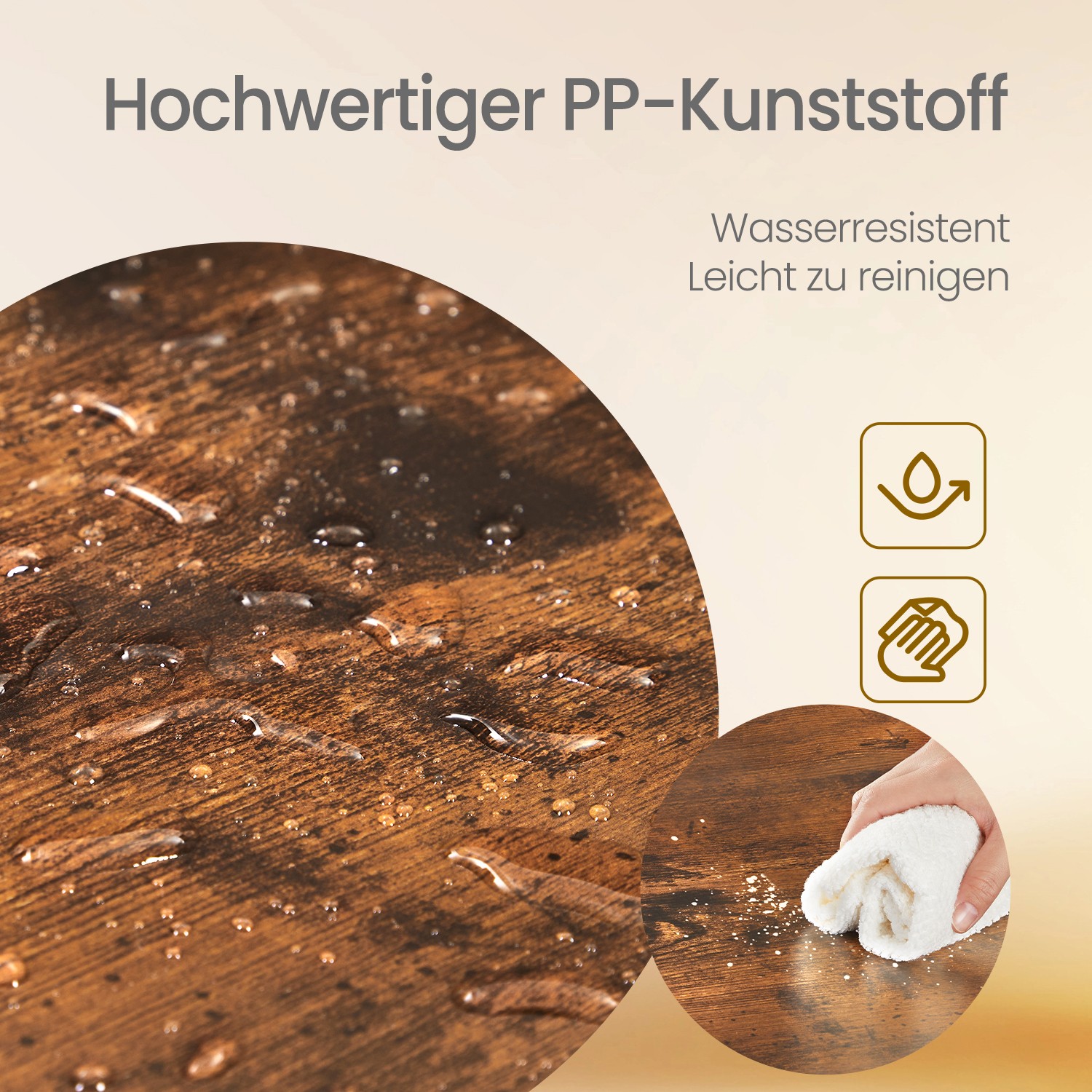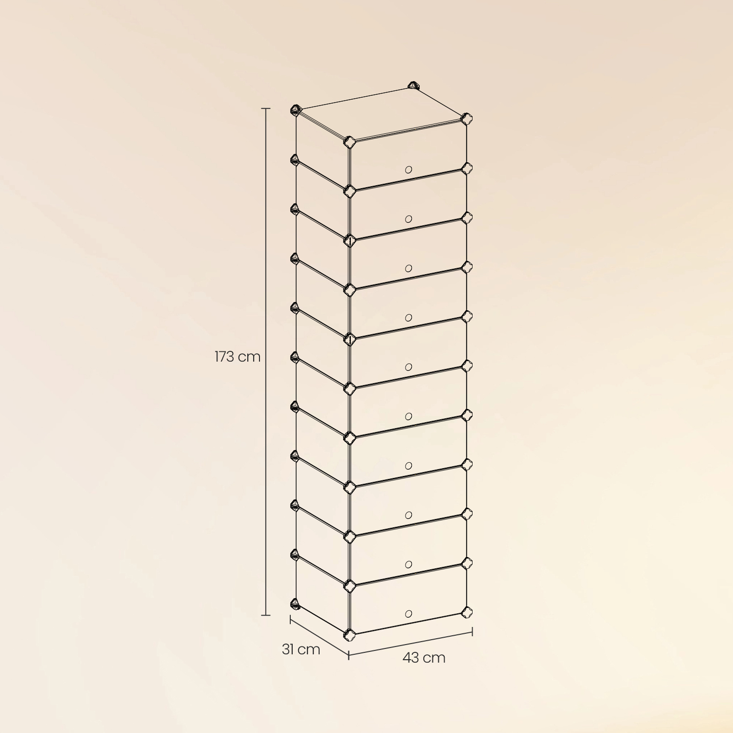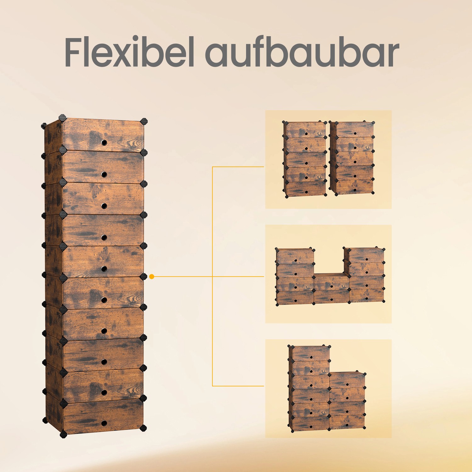 Stable, safe, durableThe PP plastic panels are held together securely by high-quality ABS connectors, allowing each unit to hold up to 10 kg of clothing or shoes. In addition, the anti-tip protection provides additional stability and safe use. Product details: – Color: Vintage brown – Material: PP plastic panels, wire frame, ABS plastic connectors – Size (1 x 10): 43 x 31 x 173 cm (L x W x H) – Size (2 x 5): 83 x 31 x 88 cm (L x W x H)- Weight: 7.2 kg- Max. static load capacity per compartment: 10 kg Scope of delivery:- 12 x plastic panels in vintage brown (40 x 30 cm)- 20 x plastic panels in vintage brown (30 x 17 cm)- 10 x plastic panels in vintage brown (40 x 17 cm)- 10 x door panels in vintage brown (40 x 17 cm)- 48 x ABS plastic connectors- 1 x hammer- 2 x anti-tip devices- 1 x instruction manual (DE, EN, FR, ES, IT)SONGMICS Notes:- Please do not expose the product to intense sunlight for long periods of time. – Please do not sit on the product or place heavy objects on it. – All plastic panels should be pressed firmly into the connectors; use the hammer to ensure a stable connection between all individual parts. After assembling each row, press down on the connectors until they are completely locked into place. – Please secure the product to the wall using the included anti-tip device if it is higher than 60 cm.