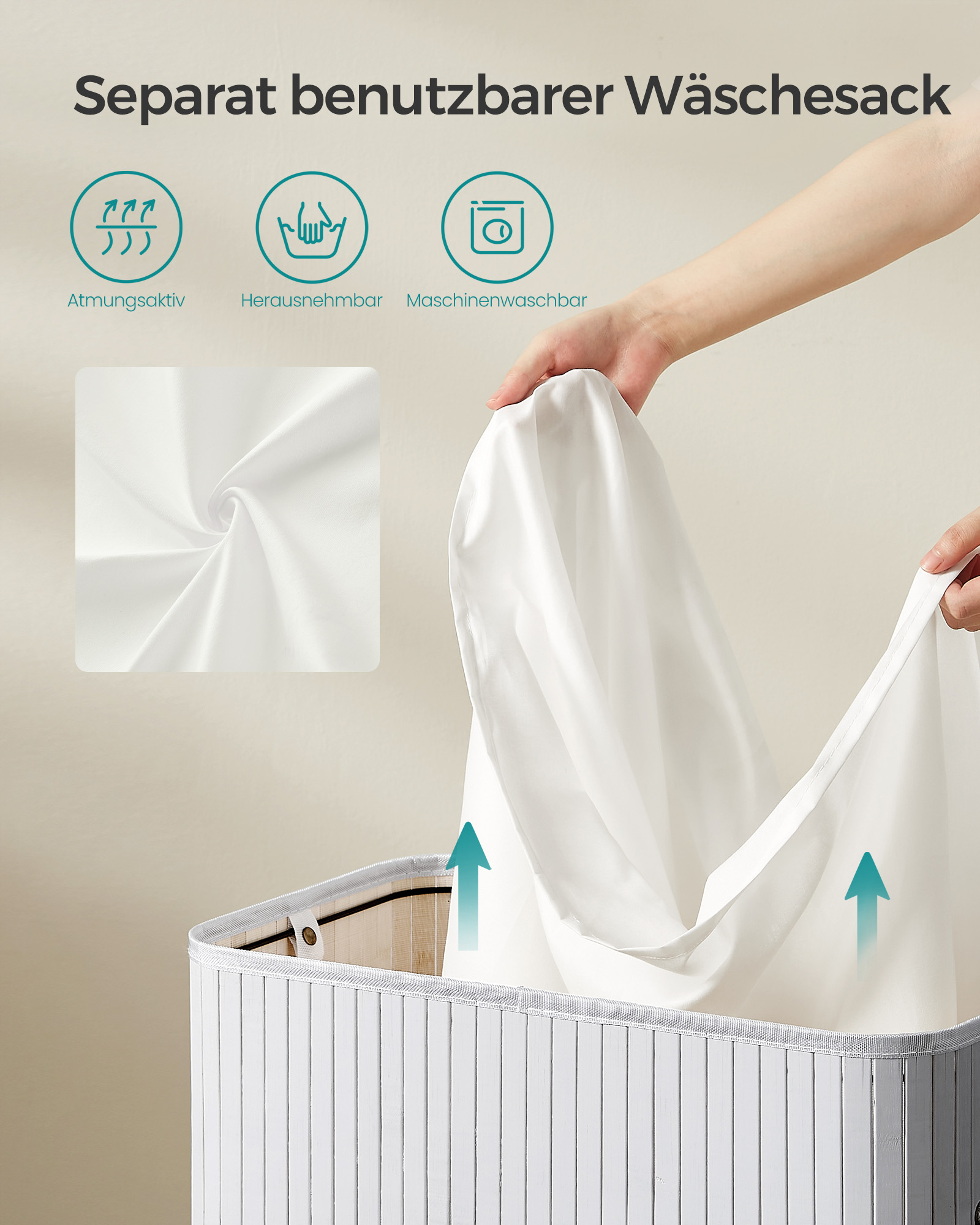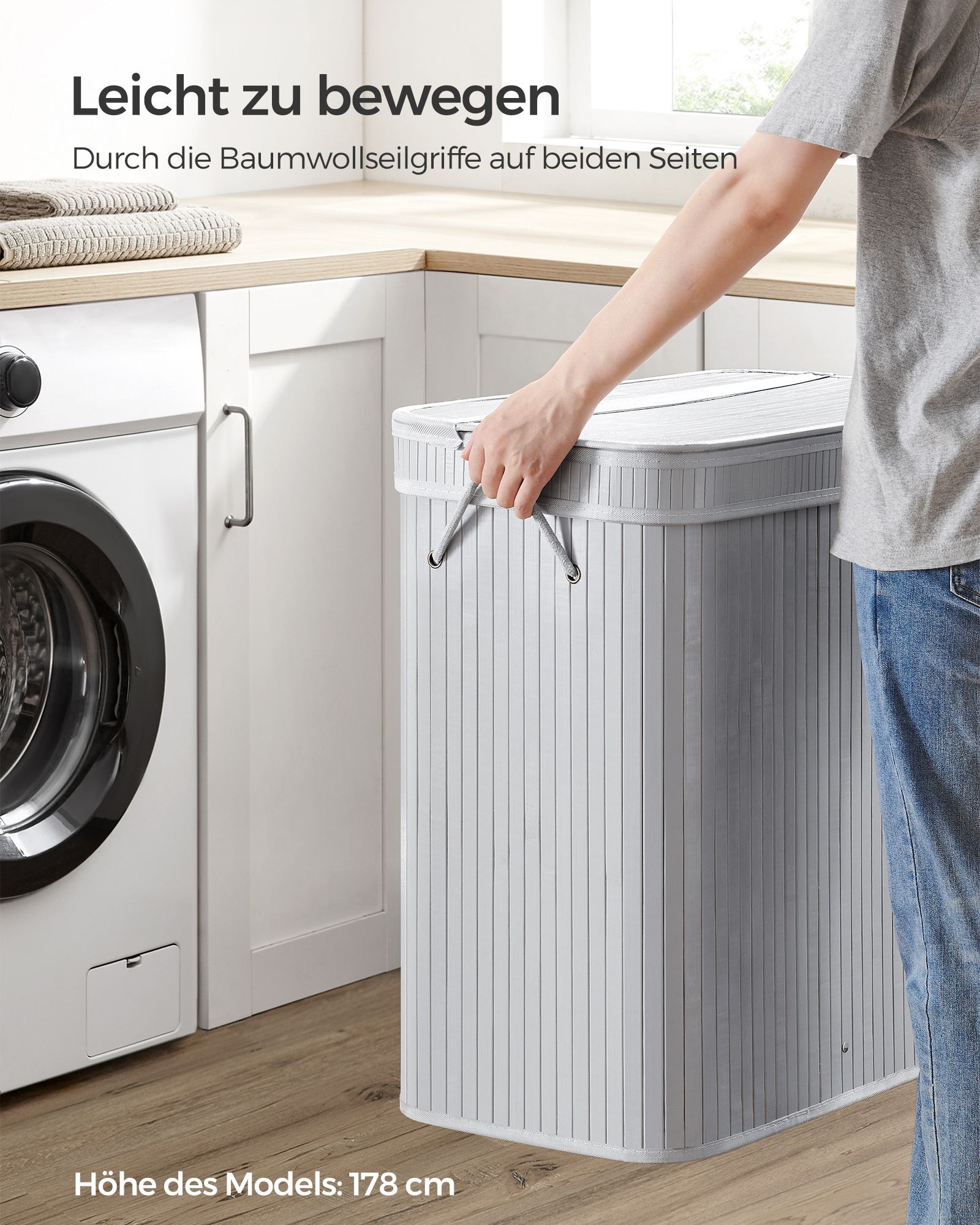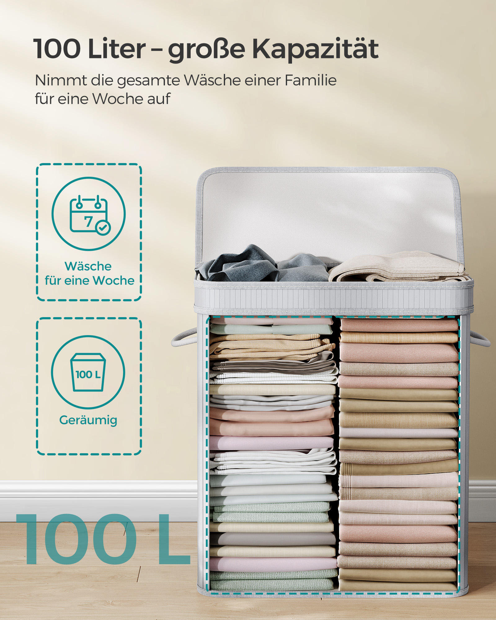 SONGMICS laundry basket with lid, 100 liters, bamboo laundry collector, removable and machine-washable laundry bag, with handles, for laundry room, bedroom, living room, natural color LCB063N01