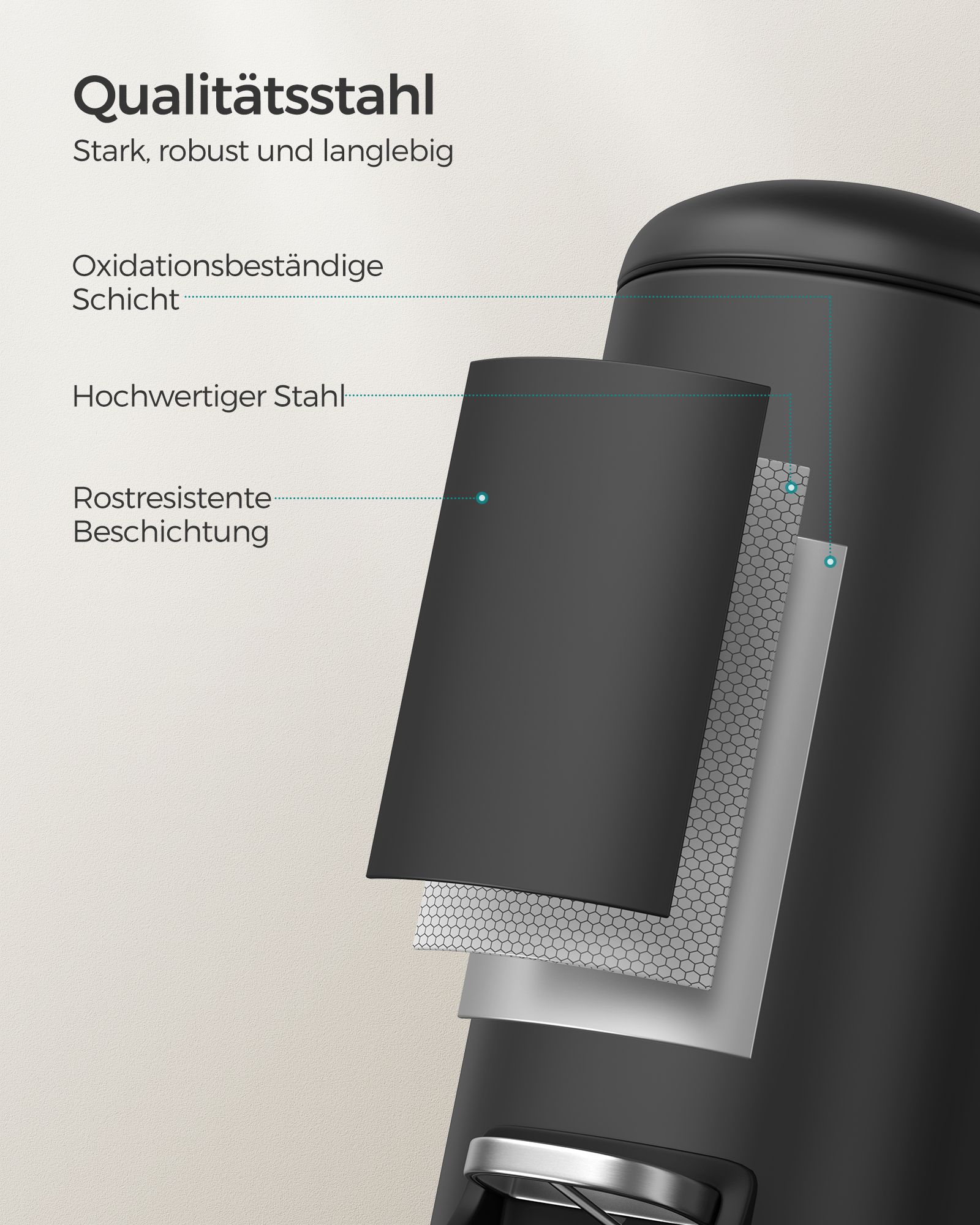 Material: Outer container made of steel, inner bucket made of PP plastic, base made of ABS plastic